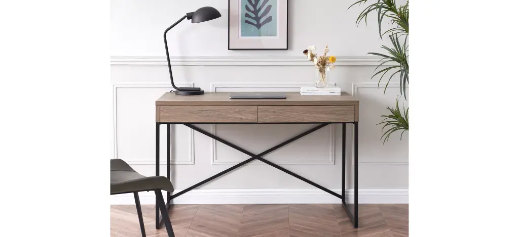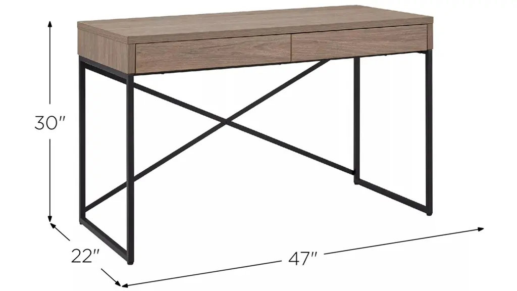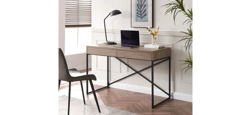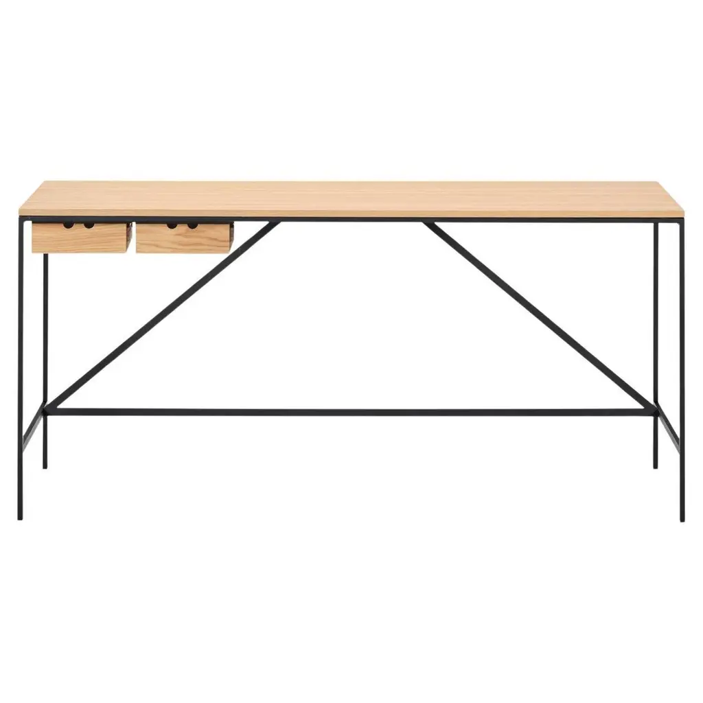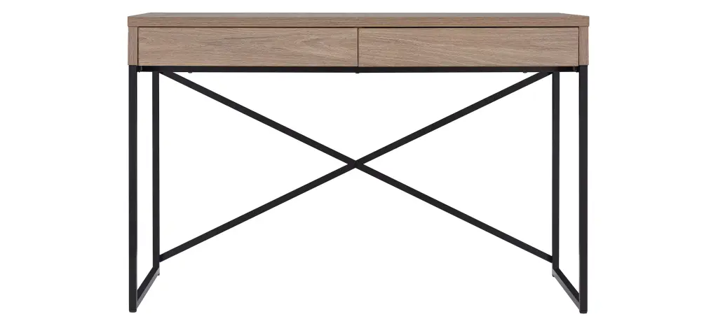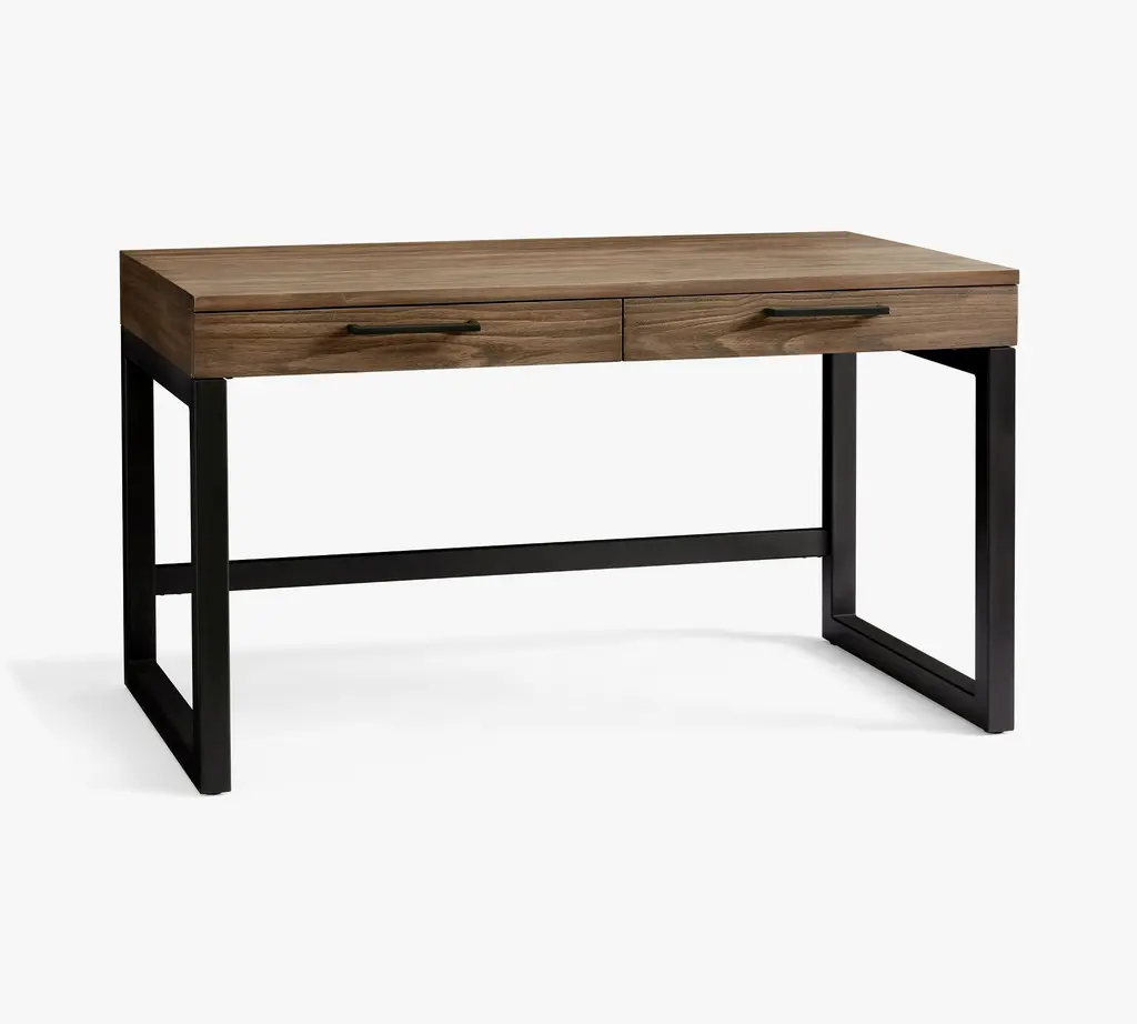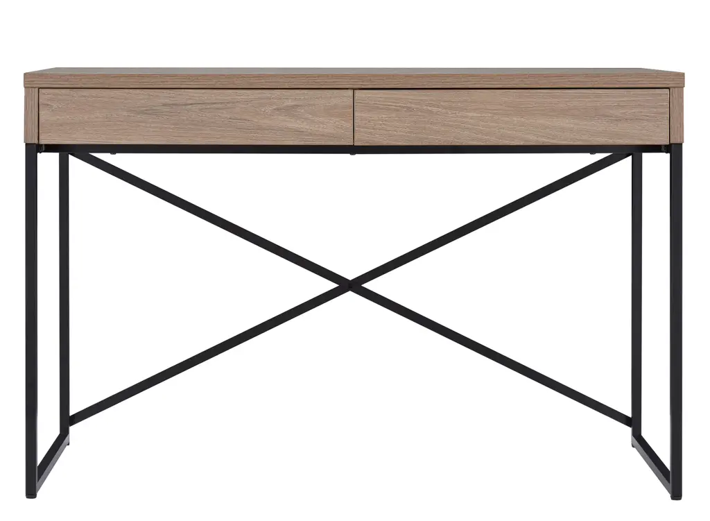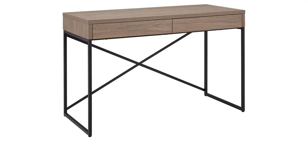 Cultivate mid-century style in your home office, game room, or vanity area with this modern Mason Writing Desk. The sleek lines of its black steel base are offset by a sturdy MDF desktop, finished in a warm rustic tone. This desk features two push-to-open drawers for storage, while the open lower space provides plenty of room to settle in and take on the day.