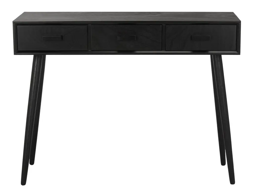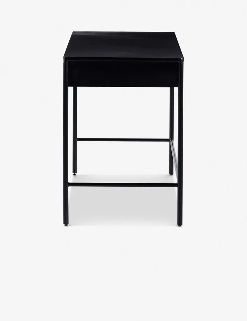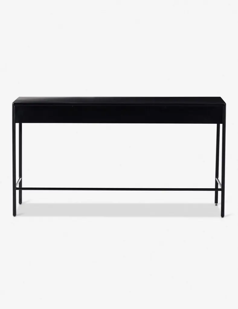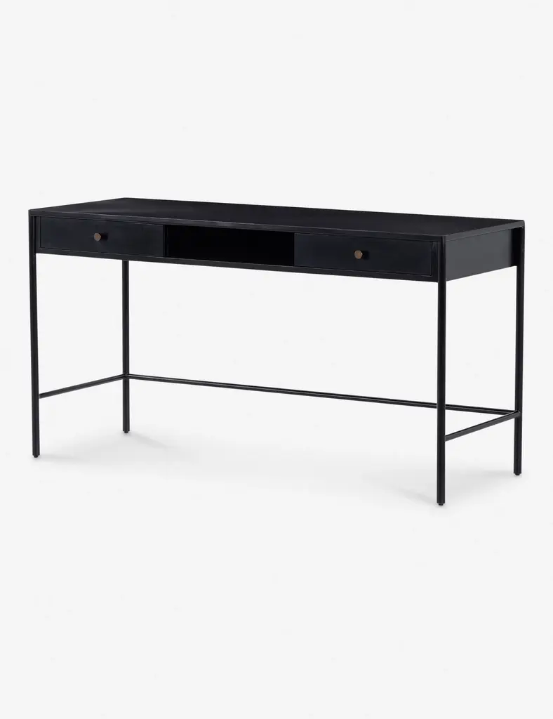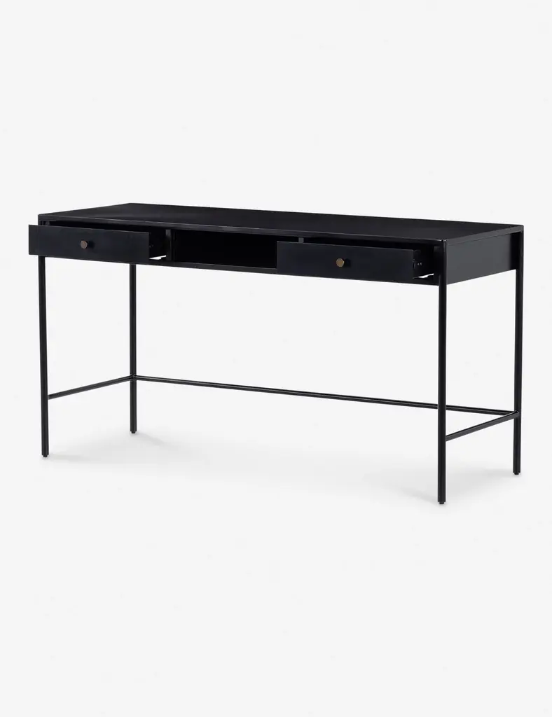 Blending sleek style with industrial undertones, this black-finished iron desk casts a clean, spare silhouette with bronzed hardware for modern appeal. Dual drawers add convenient storage to this streamlined design.