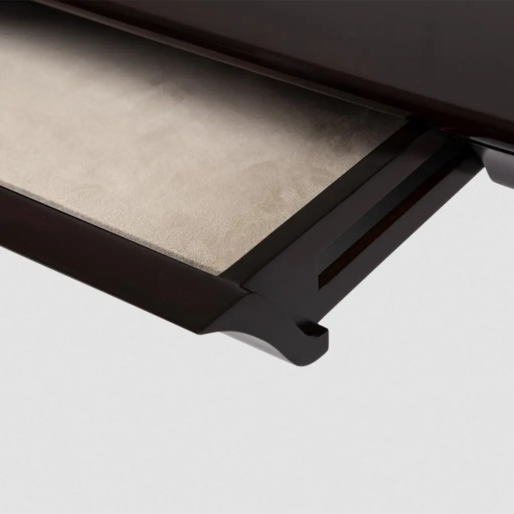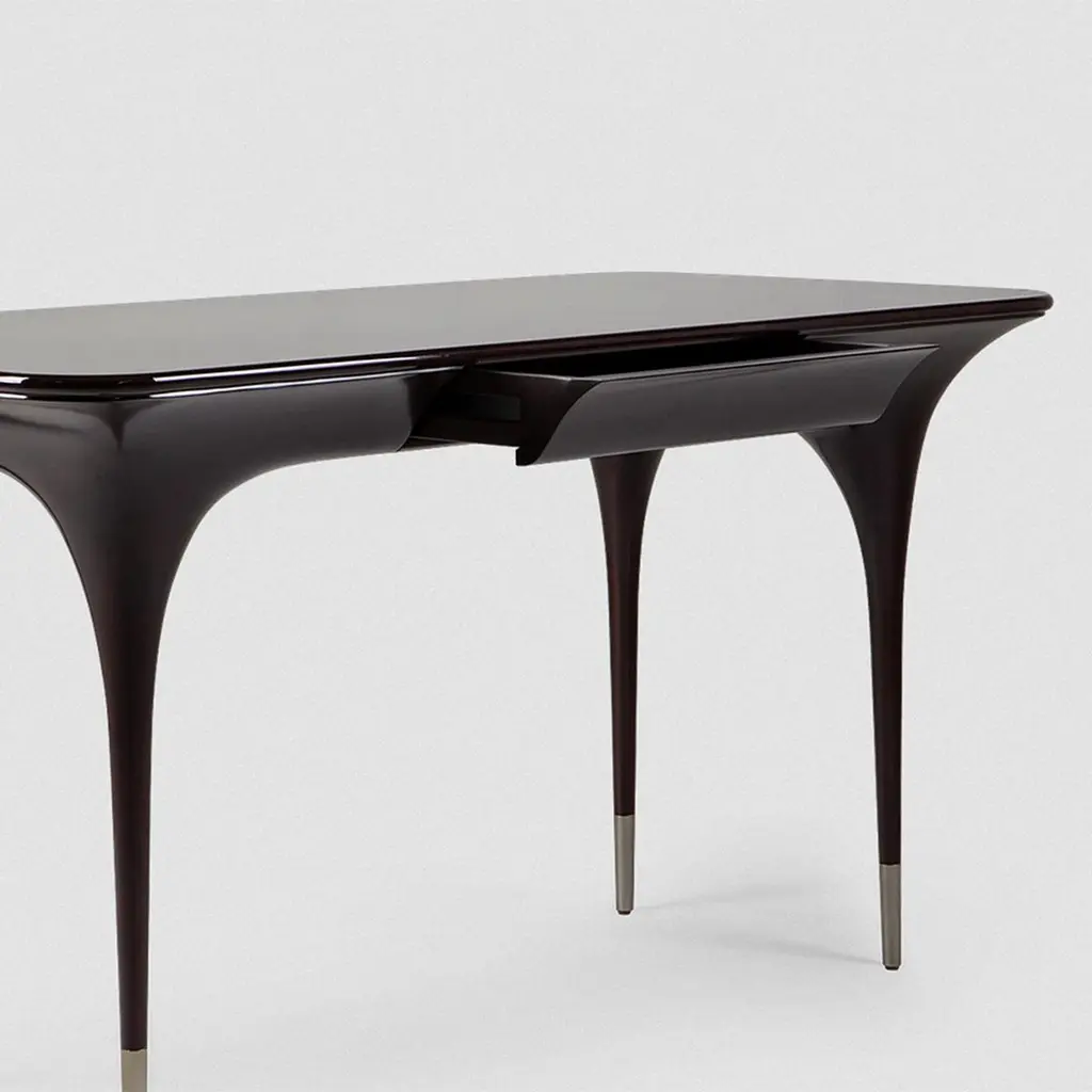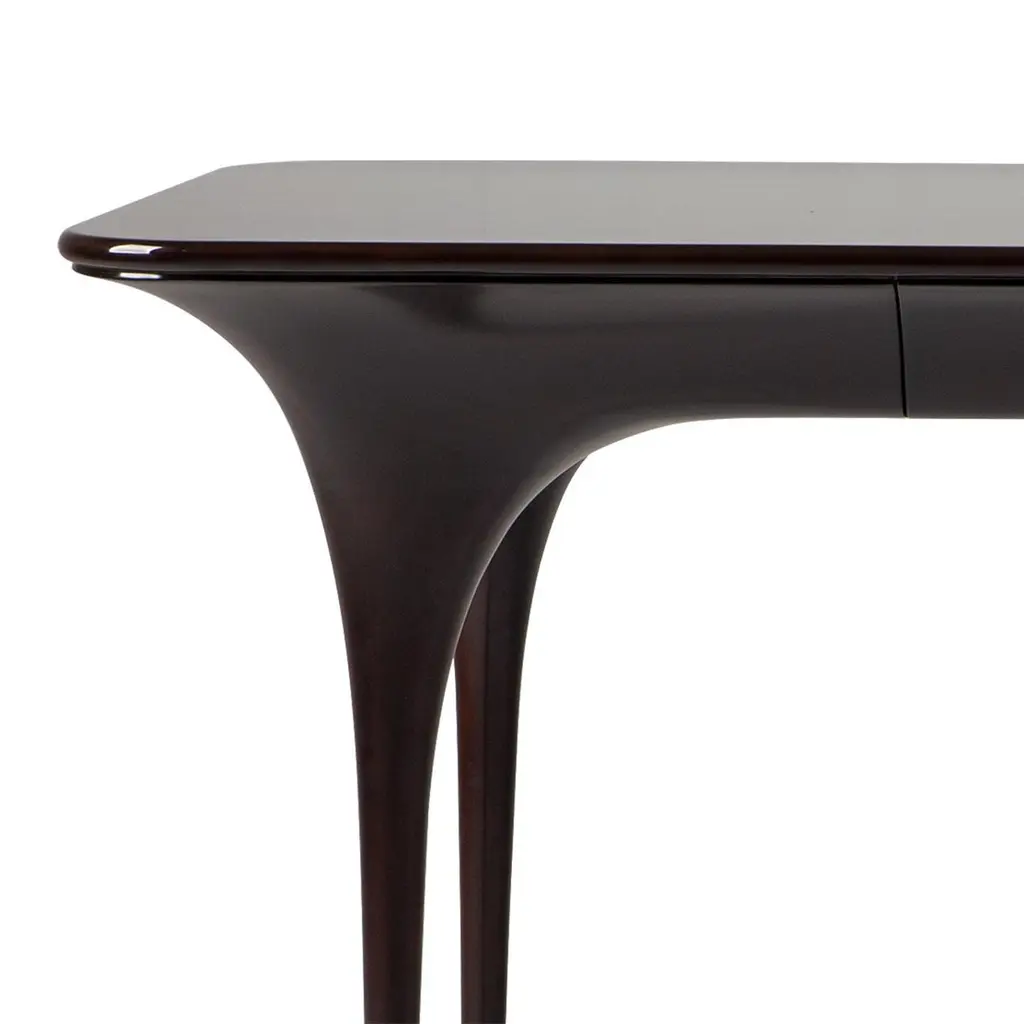 Desk Matis with structure in solid mahogany woodin black lacquered finish. With brushed nickel finish feet on each leg and with 1 drawer covered with suede leather.