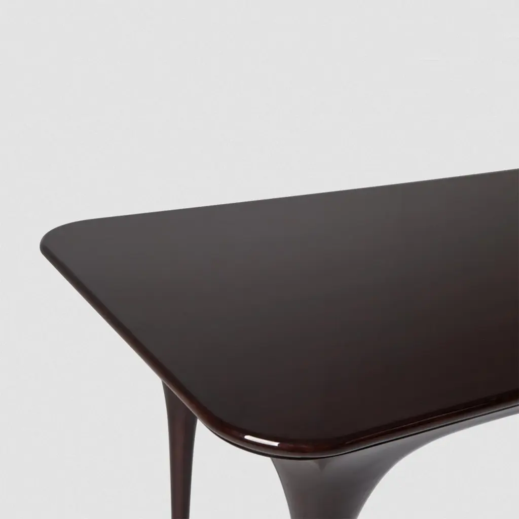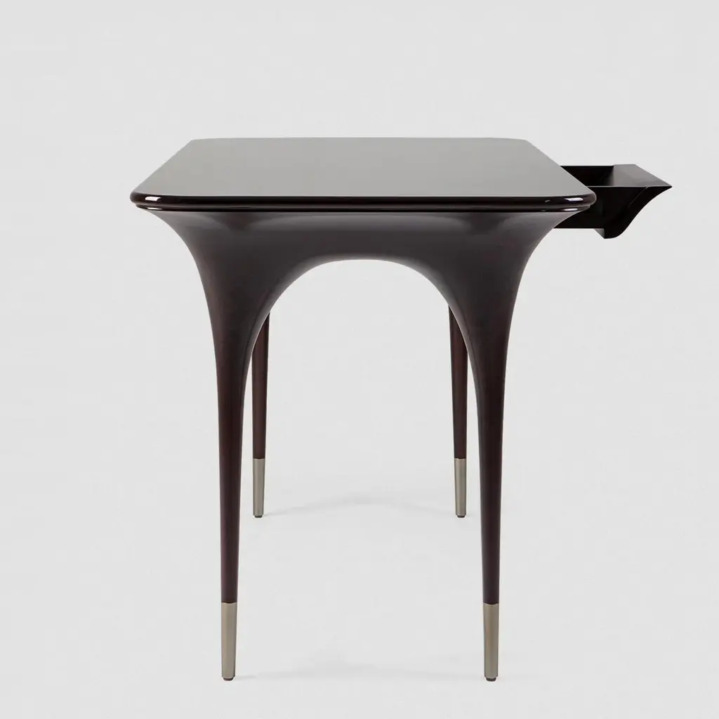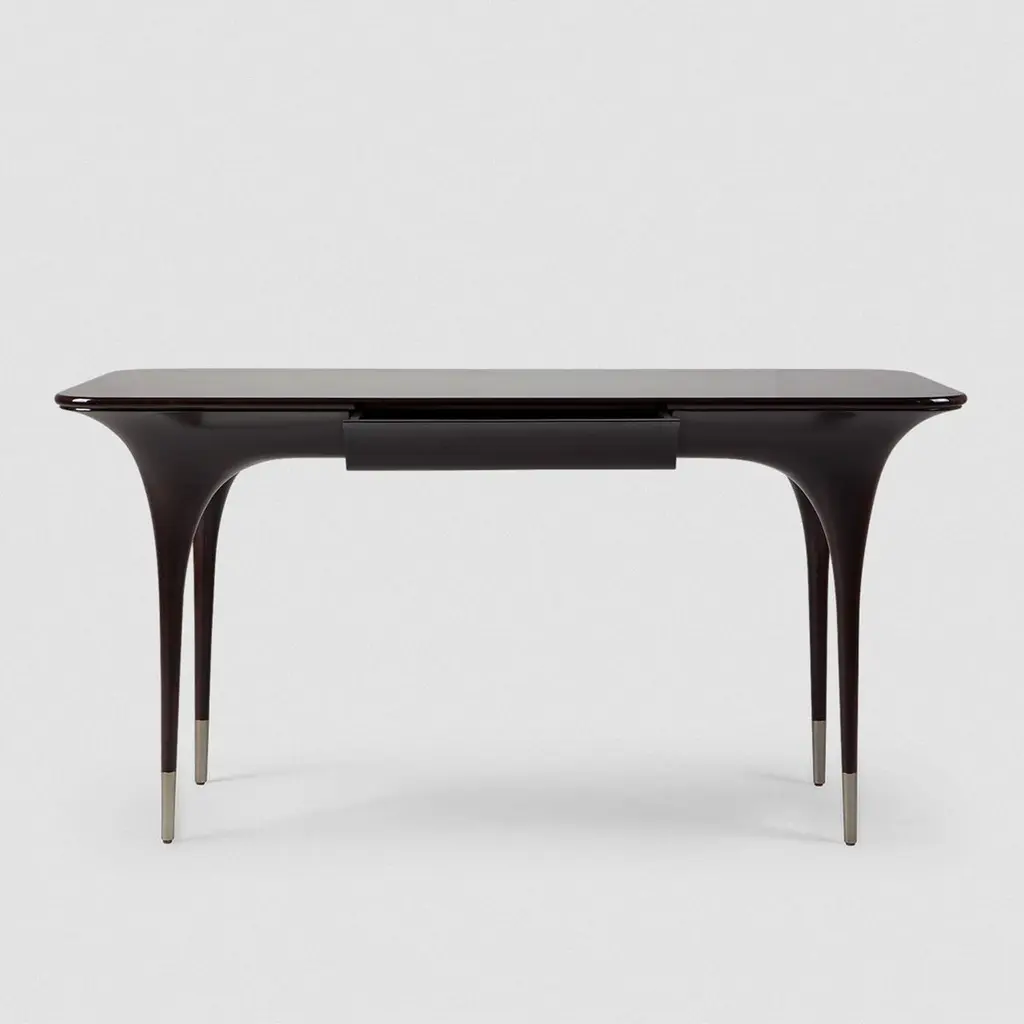 Desk Matis with structure in solid mahogany woodin black lacquered finish. With brushed nickel finish feet on each leg and with 1 drawer covered with suede leather.