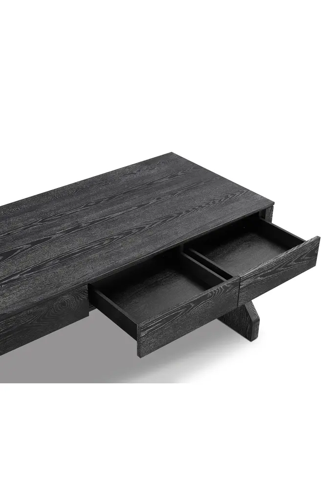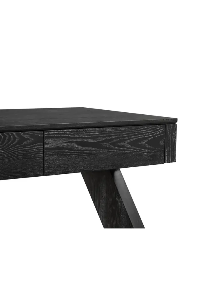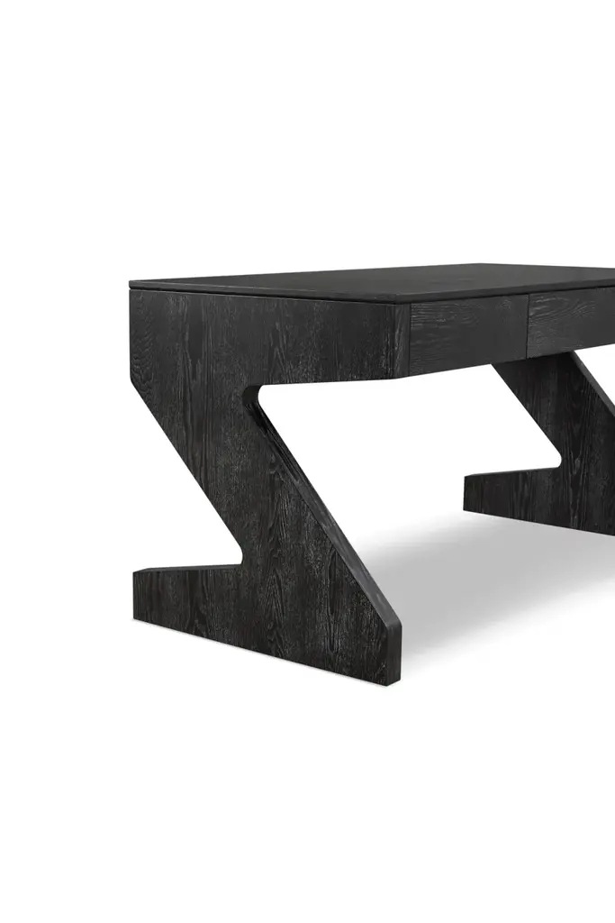 Upgrade your workspace with the exquisite Zeta Desk, a masterpiece that effortlessly blends sophisticated design with exceptional functionality. Crafted to inspire creativity and productivity, this desk is more than just a piece of furniture – it’s a statement of refined taste and modern sensibility.The Zeta Desk exudes a timeless allure with its striking ebony matt black ash veneer finished with cerusing wax to accentuate the wood grain. This meticulous craftsmanship not only enhances the desk’s visual appeal but also ensures its durability and resilience. The unique cerused finish adds depth to the wood’s natural grain, creating a captivating play of textures that’s sure to draw admiring glances.One of the defining features of the Zeta Desk is its innovative Z-shaped legs, a testament to cutting-edge design and engineering. These legs provide exceptional stability and support while adding a touch of design element. The Zeta Desk’s ingenious leg structure not only contributes to its aesthetics but also offers ample legroom.