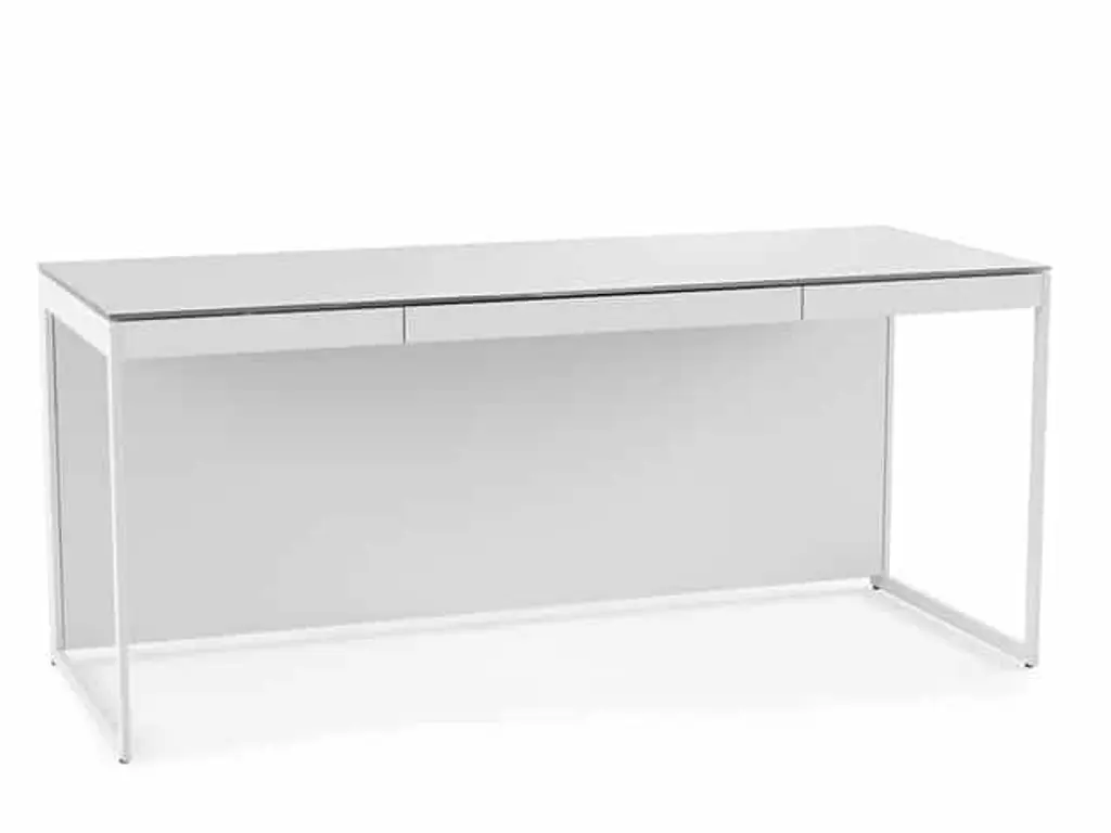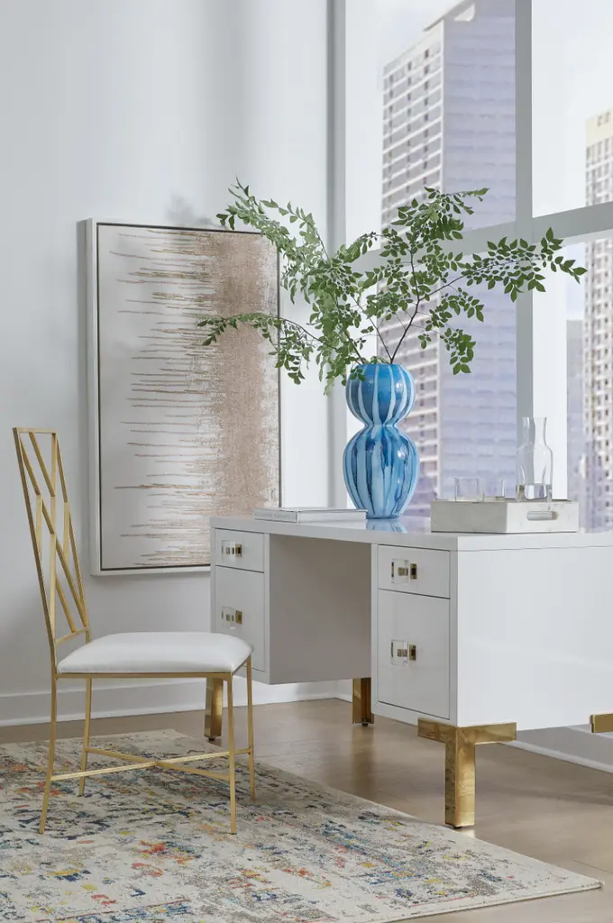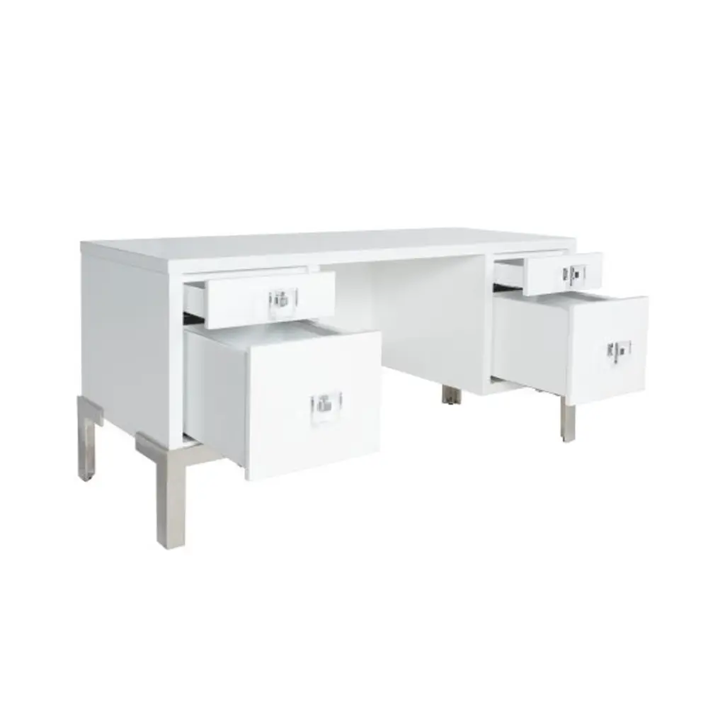 Providing maximum storage for all your work needs, our elegant desk marries style and functionality. Fresh, white lacquer case floats atop four polished nickel legs. Complete with coordinating nickel and acrylic pendant hardware, this desk pairs perfectly with our Shaw chair. *TWO PERSON ASSEMBLY REQUIRED. INSTRUCTIONS PROVIDED. WHITE GLOVE SHIPPING CHARGES MAY APPLY. Width:60.50" Height:29.50" Depth:24.50"