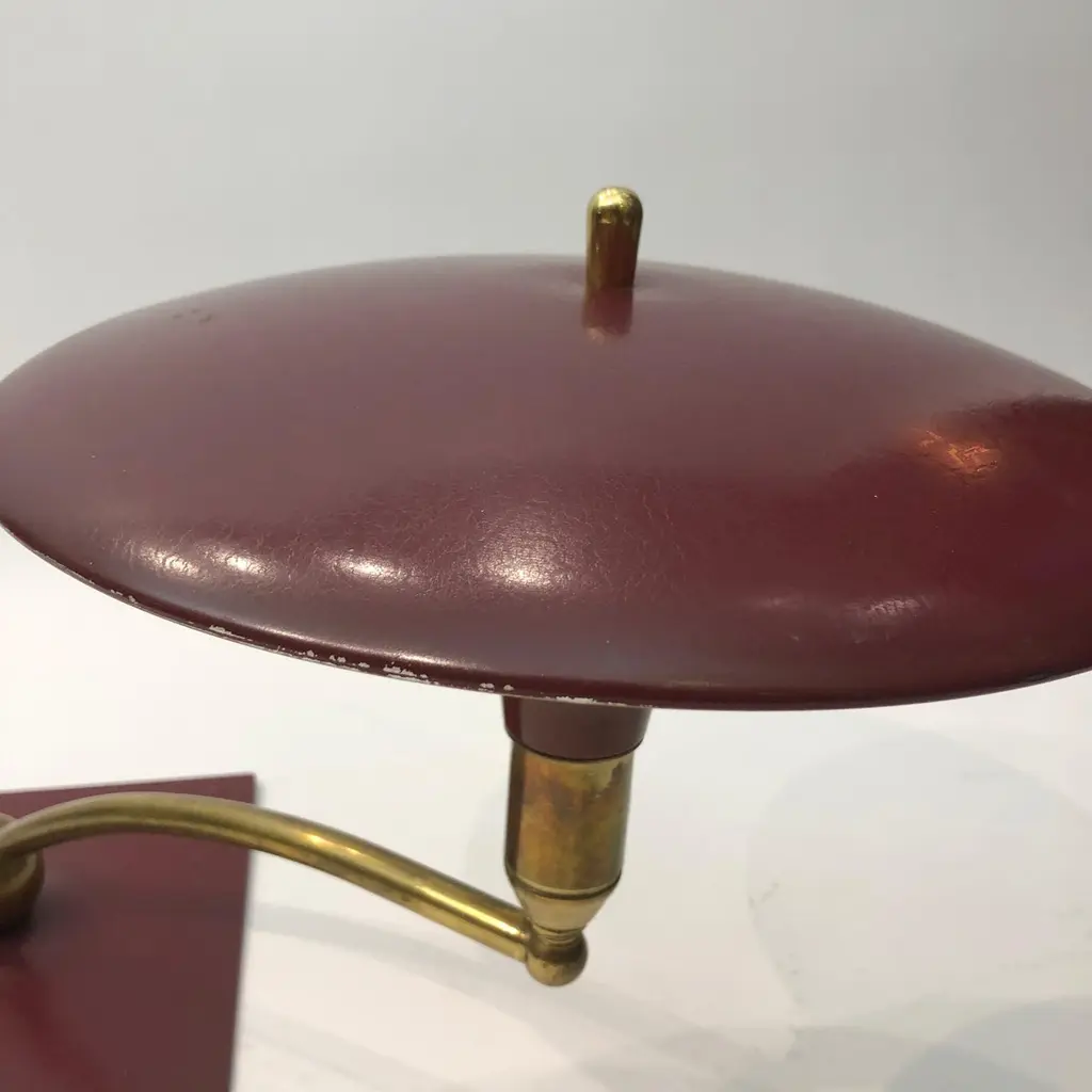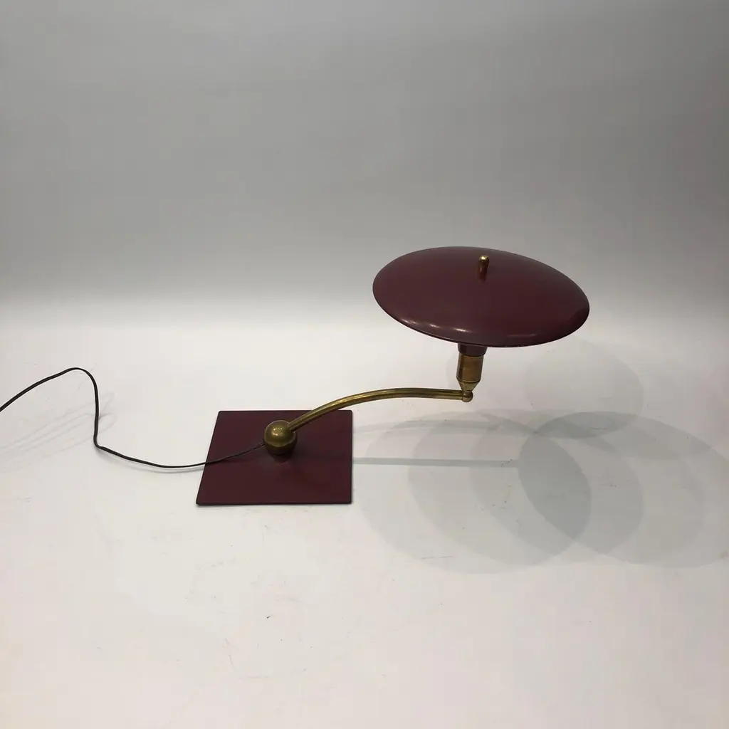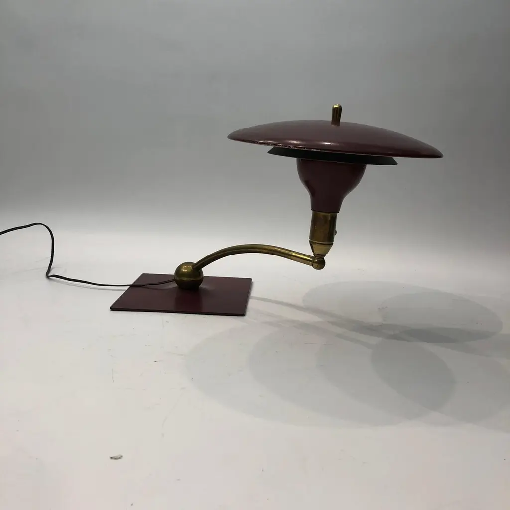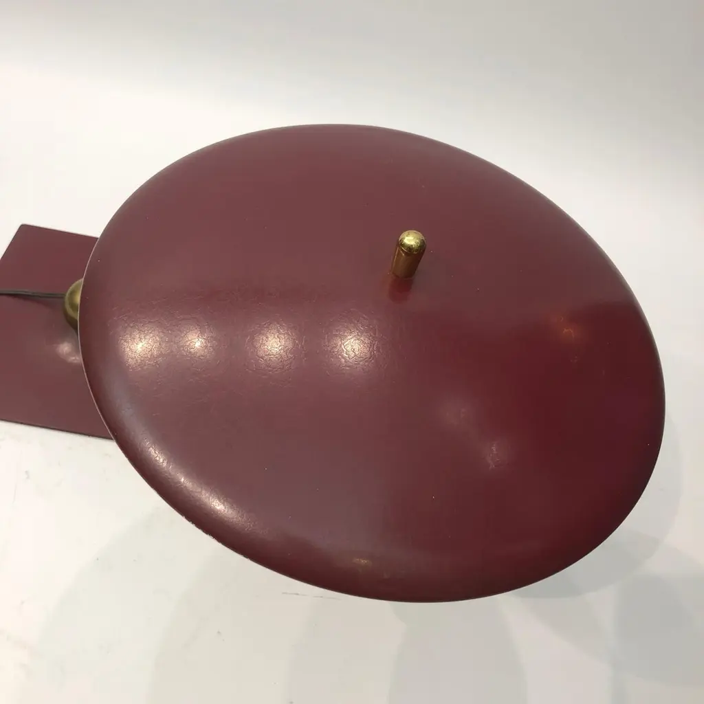 A classic desk table lamp by MG Wheeler in burgundy crackled finish and brass details. Steady heavy square base with a brass rotating ball with a curved pole that supports the UFO like shade. Elements of 1950s futurism and is evident on this classic design that would look amazing on most desks and tables.There are two lamps available. The given price is for one lamp, the left one on top of the tables.Currently USA wired Please contact us for international postage quotes.CREATOR: M. G. WheelerPLACE OF ORIGIN: United StatesDATE OF MANUFACTURE: c. 1960'sPERIOD: 1960 - 1969MATERIALS & TECHNIQUES: Metal, Brass.CONDITION: Good original condition.WEAR: Wear consistent with age and use. Minor paint chips and scratches on the shade as seen in the pictures.HEIGHT with Shade: 33cm 13inWIDTH with Shade: 58cm 22.8inDEPTH with Shade: 24cm 9.44in