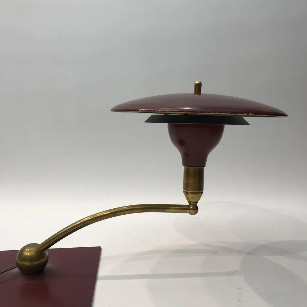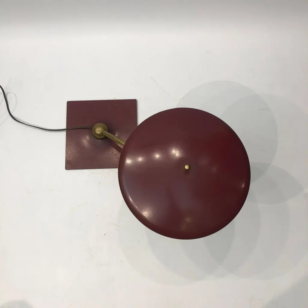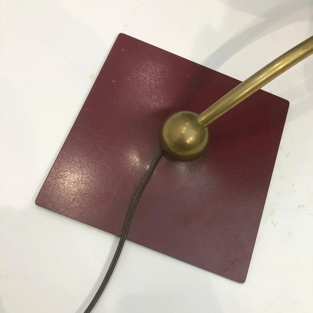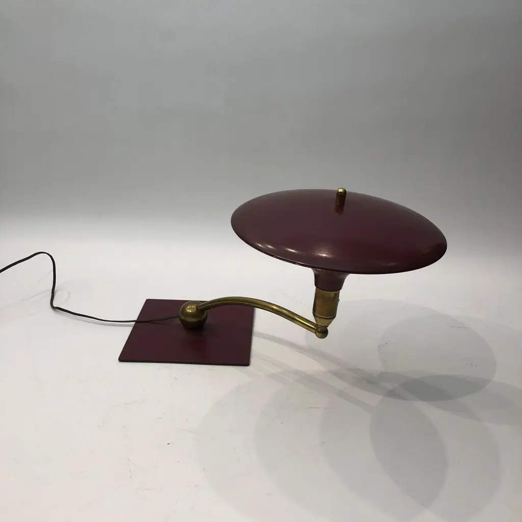A classic desk table lamp by MG Wheeler in burgundy crackled finish and brass details. Steady heavy square base with a brass rotating ball with a curved pole that supports the UFO like shade. Elements of 1950s futurism and is evident on this classic design that would look amazing on most desks and tables.There are two lamps available. The given price is for one lamp, the left one on top of the tables.Currently USA wired Please contact us for international postage quotes.CREATOR: M. G. WheelerPLACE OF ORIGIN: United StatesDATE OF MANUFACTURE: c. 1960'sPERIOD: 1960 - 1969MATERIALS & TECHNIQUES: Metal, Brass.CONDITION: Good original condition.WEAR: Wear consistent with age and use. Minor paint chips and scratches on the shade as seen in the pictures.HEIGHT with Shade: 33cm 13inWIDTH with Shade: 58cm 22.8inDEPTH with Shade: 24cm 9.44in