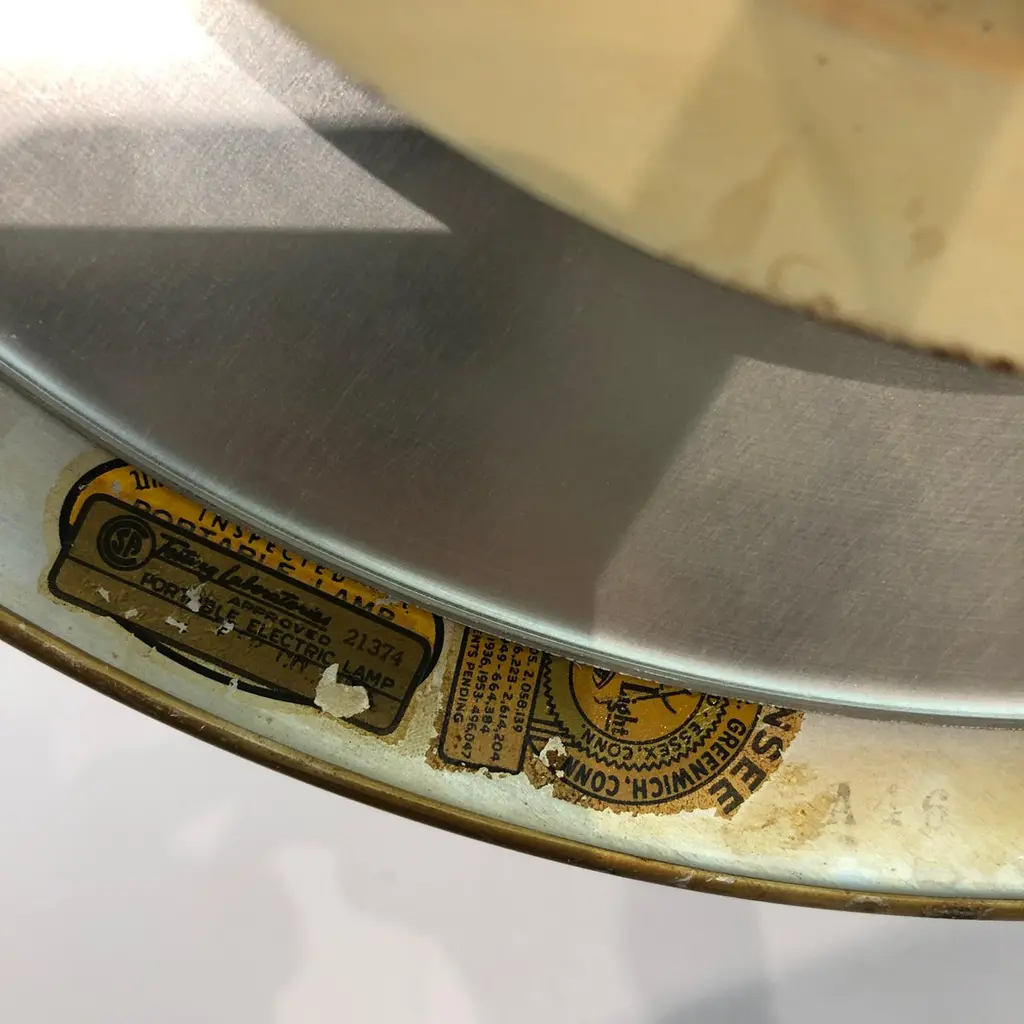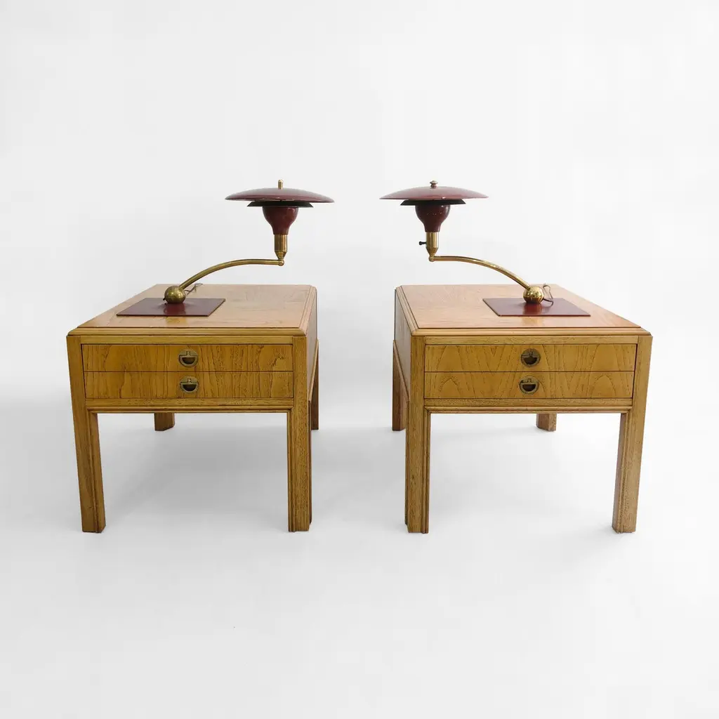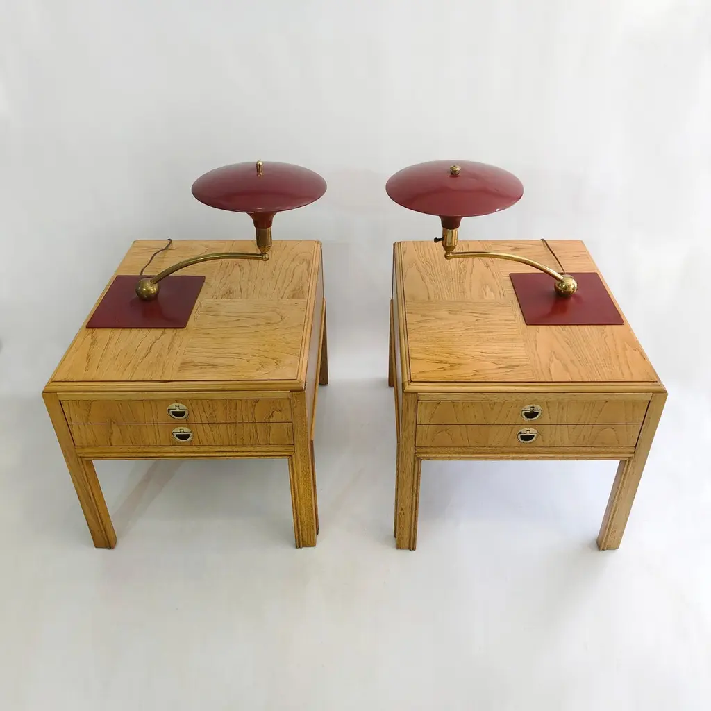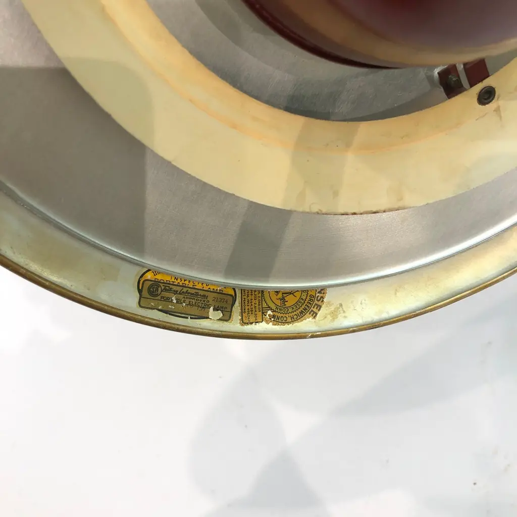 A classic desk table lamp by MG Wheeler in burgundy crackled finish and brass details. Steady heavy square base with a brass rotating ball with a curved pole that supports the UFO like shade. Elements of 1950s futurism and is evident on this classic design that would look amazing on most desks and tables.There are two lamps available. The given price is for one lamp, the left one on top of the tables.Currently USA wired Please contact us for international postage quotes.CREATOR: M. G. WheelerPLACE OF ORIGIN: United StatesDATE OF MANUFACTURE: c. 1960'sPERIOD: 1960 - 1969MATERIALS & TECHNIQUES: Metal, Brass.CONDITION: Good original condition.WEAR: Wear consistent with age and use. Minor paint chips and scratches on the shade as seen in the pictures.HEIGHT with Shade: 33cm 13inWIDTH with Shade: 58cm 22.8inDEPTH with Shade: 24cm 9.44in
