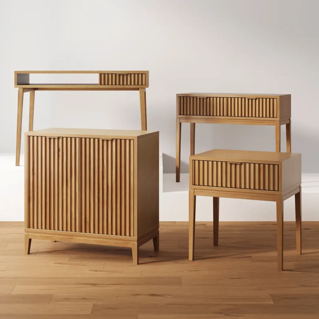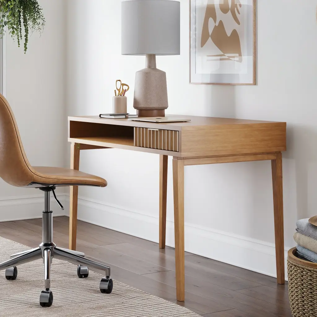 Introducing the Jasper Desk, the ultimate boho-inspired workstation! From its fluted accents and brass hardware to its stylish neutral finish and tapered legs, this desk is eye-catching and brings delightful texture to your workspace. Stay organized with both the hidden drawer and handy open cubby, perfect for storing your essentials. Let the Jasper Desk be your creative sanctuary where work and style effortlessly collide.