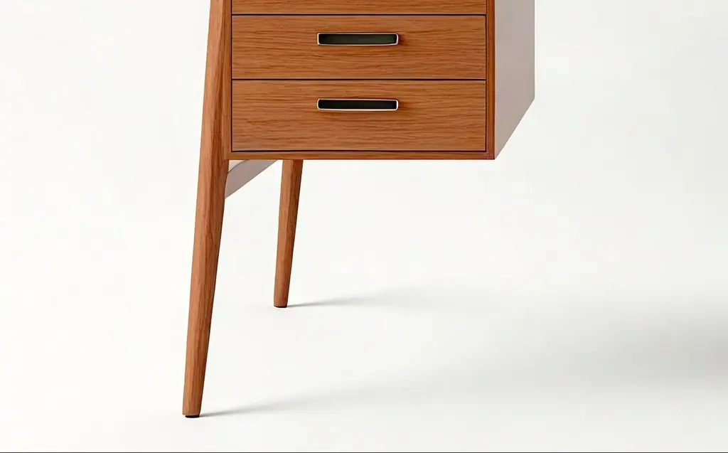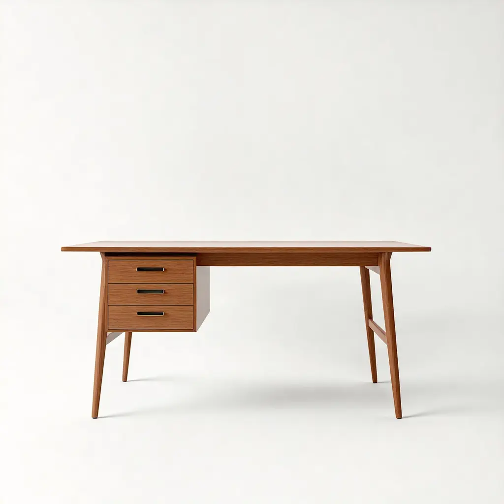 Elevate your workspace with this striking Mid-Century Modern desk, meticulously handcrafted from sustainably sourced solid wood. Designed by Artisanal, this piece blends clean lines, tapered legs, and warm wood tones to embody the timeless sophistication of mid-century design.Featuring three seamlessly integrated drawers with sleek metal pulls, this desk provides both visual balance and practical storage for a clutter-free environment. The cantilevered drawer module floats effortlessly beneath the desktop, adding a sculptural quality while maximizing legroom.Ideal for a stylish home office or a creative studio, this desk combines functionality with refined craftsmanship. Each piece is hand-finished by master artisans in India.Details:Materials: Solid woodFinish: Natural matte or custom upon requestFeatures: Three drawers, hand-finished,Style: Mid-Century Modern, MinimalistCustom sizes and finishes available on requestOwn a piece that celebrates the artistry of Indian woodworking and the elegance of mid-century design.