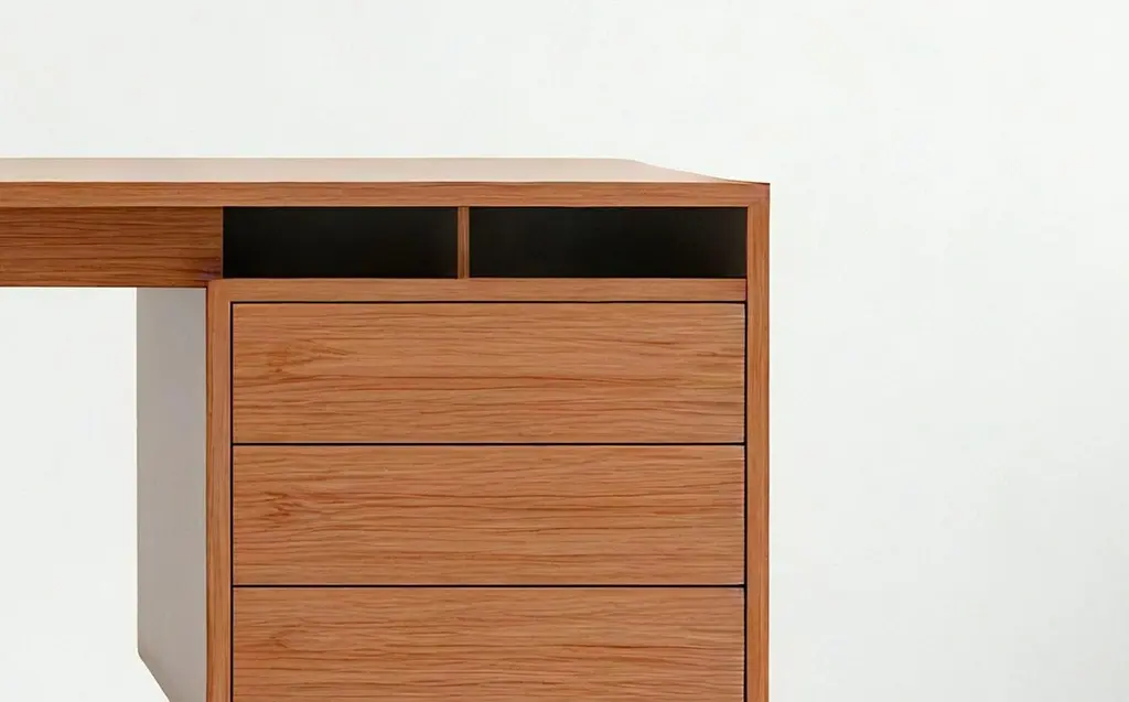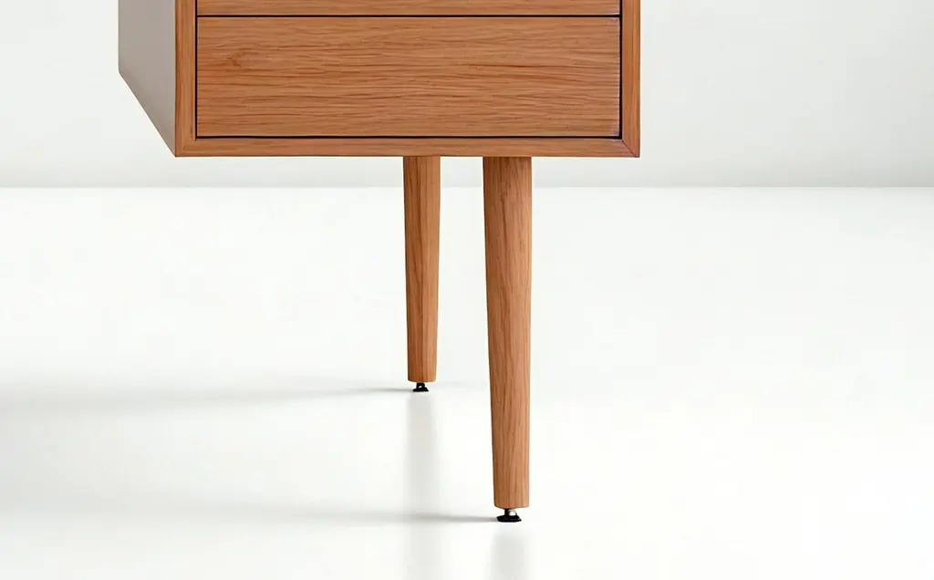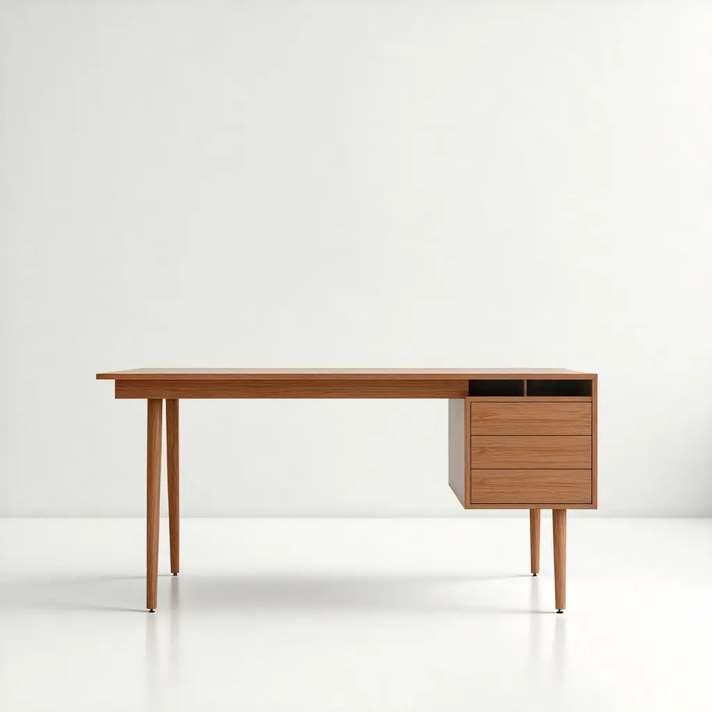 Refined and elegant, this handcrafted mid-century modern teak desk is a perfect balance of form and function. Designed by skilled artisans, the desk showcases clean lines, minimalist aesthetics, and expert craftsmanship, making it a timeless addition to any workspace or home office.Constructed from solid teak wood, this desk highlights the natural beauty of the grain, with a warm, hand-polished finish that enhances its organic appeal. The design features a floating drawer module with three spacious drawers and two open compartments, offering practical storage while maintaining a streamlined look. Slender tapered legs with metal-adjuster feet add a subtle touch of sophistication, ensuring both stability and elegance.Product Details:- Material: Sustainably sourced solid teak wood- Design: Mid-century modern silhouette with a floating drawer unit- Storage: Three drawers + two open compartments for seamless organisation- Legs: Slender tapered legs with metal-capped feet for durability- Finish: Hand-polished natural teak with a smooth, lustrous surface- Condition: New, artisan-made This one-of-a-kind teak writing desk is an exquisite choice for collectors, designers, and professionals who appreciate fine craftsmanship. Whether placed in a contemporary office or a stylish home study, it embodies understated luxury and timeless design.