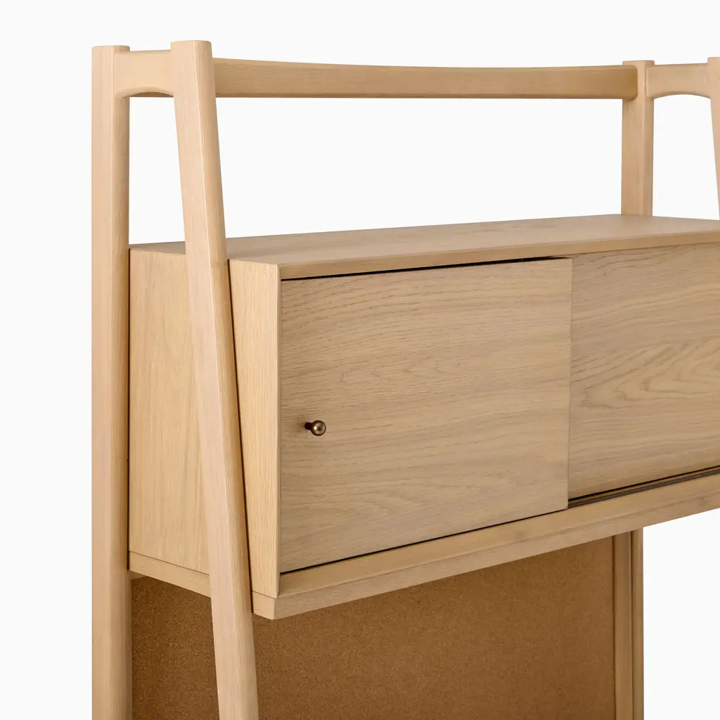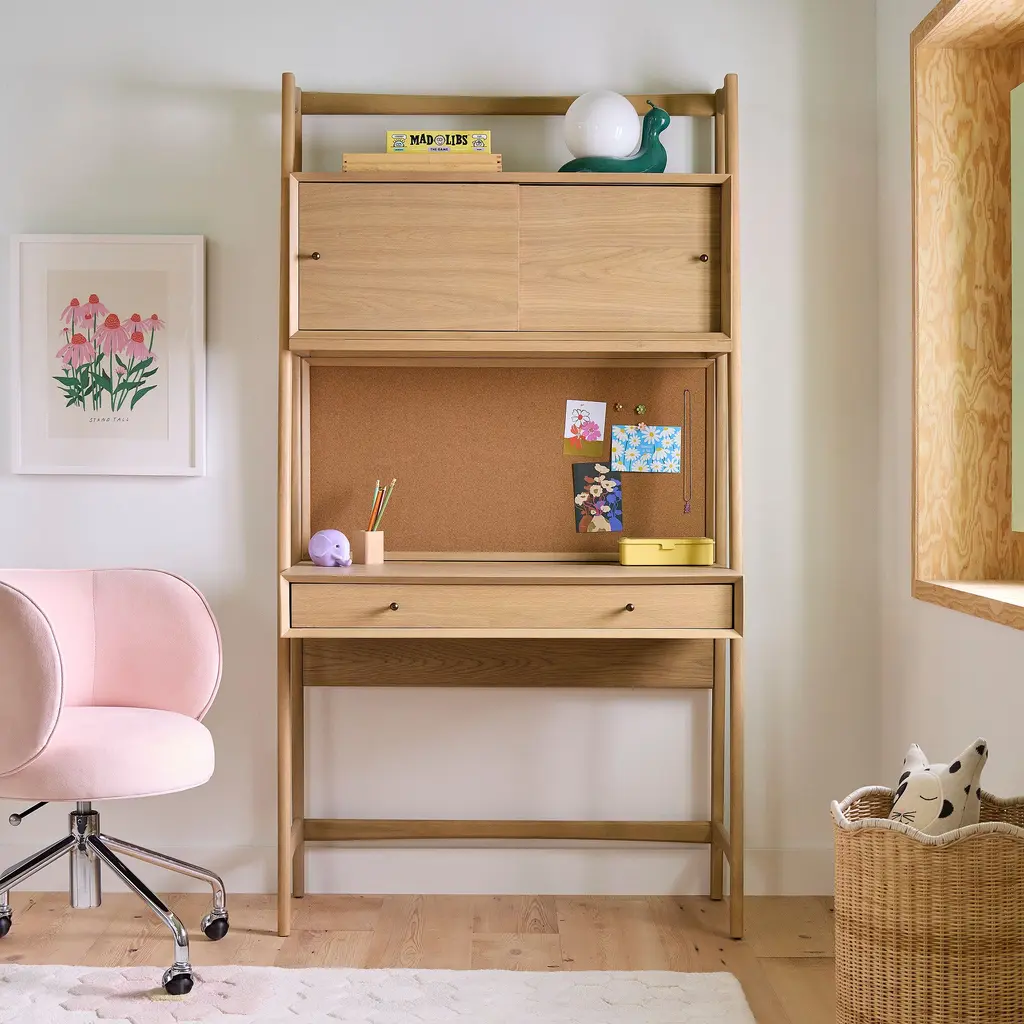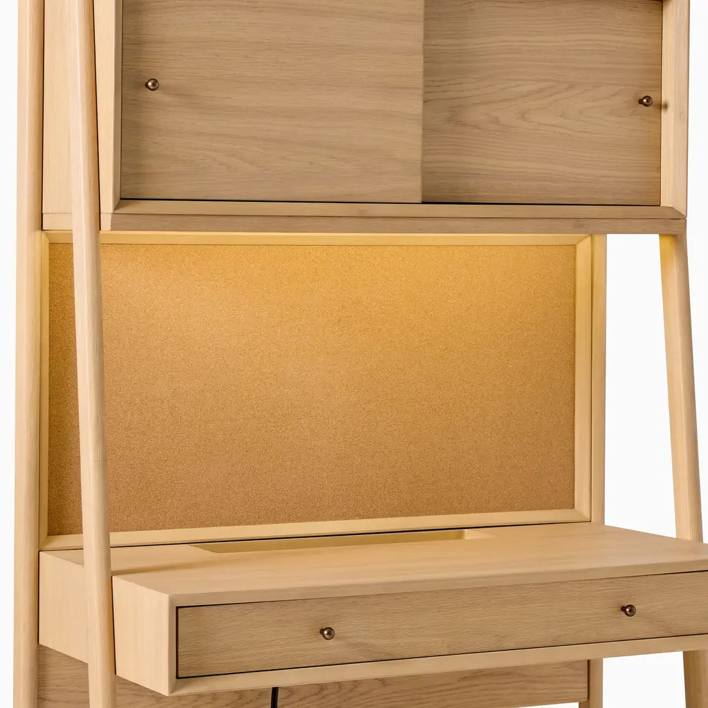 Its freestanding, compact design fits anywhere. Made of sustainably sourced wood. Covered in a child-safe, water-based finish. The handy corkboard, power and light sources.