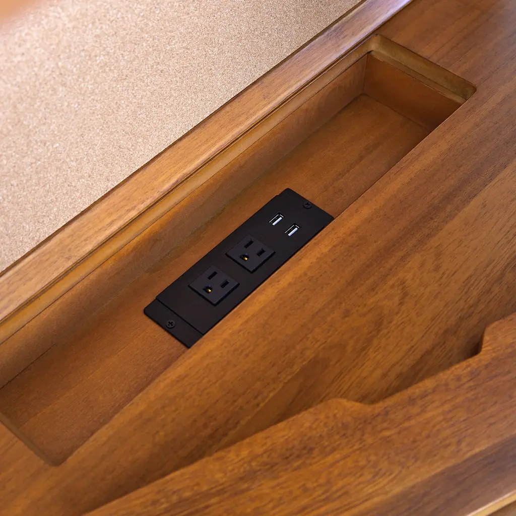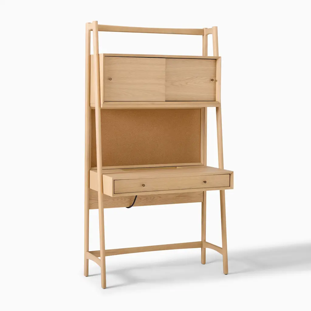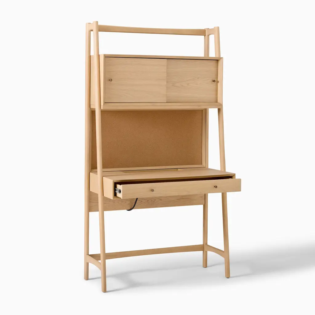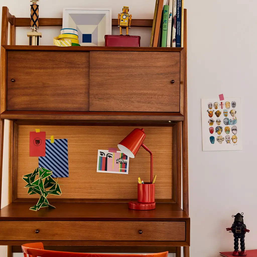 Its freestanding, compact design fits anywhere. Made of sustainably sourced wood. Covered in a child-safe, water-based finish. The handy corkboard, power and light sources.