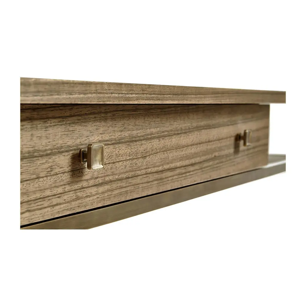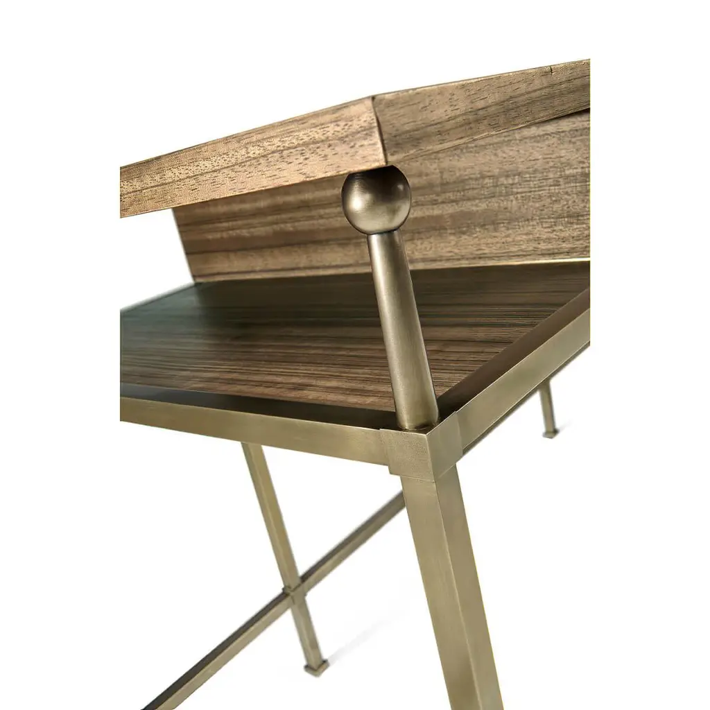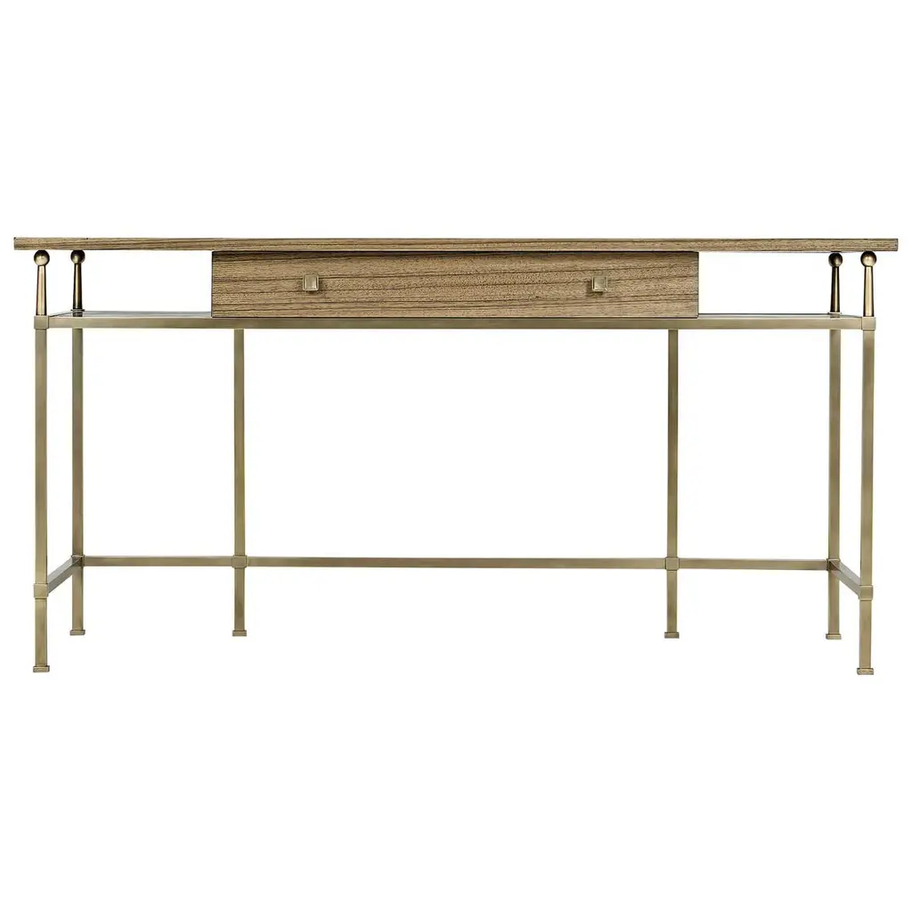A Mid-Century Modern style golden amber Paldao veneered desk with a Classic brass frame, squared brass pulls, a single long drawer and raised on six brass legs. Dimensions: 60.33" W x 25.33" D x 30" H.