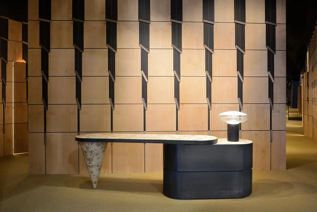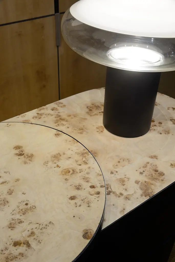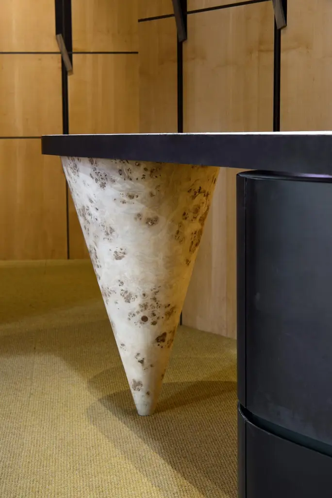 Multifunctional unit featuring a chest with two drawers, accented by two metal doors with an external coating. The interior is finished in matte lacquer (color to be determined). The top rests on a conical base, covered in natural finish poplar burl, with metal-coated edges for added durability and style.