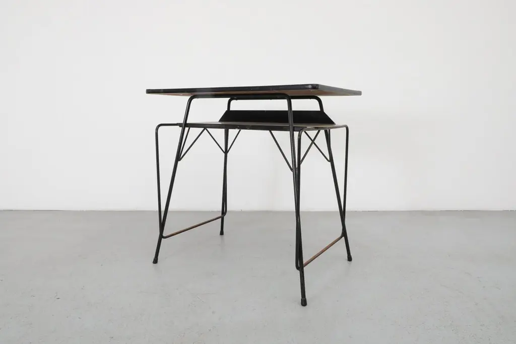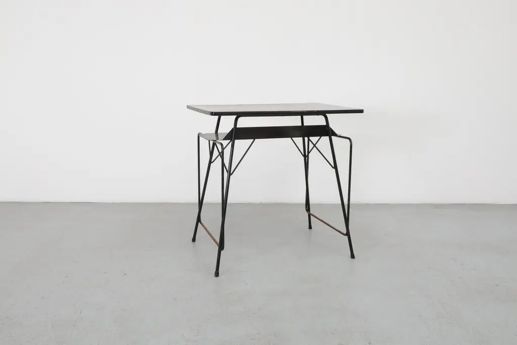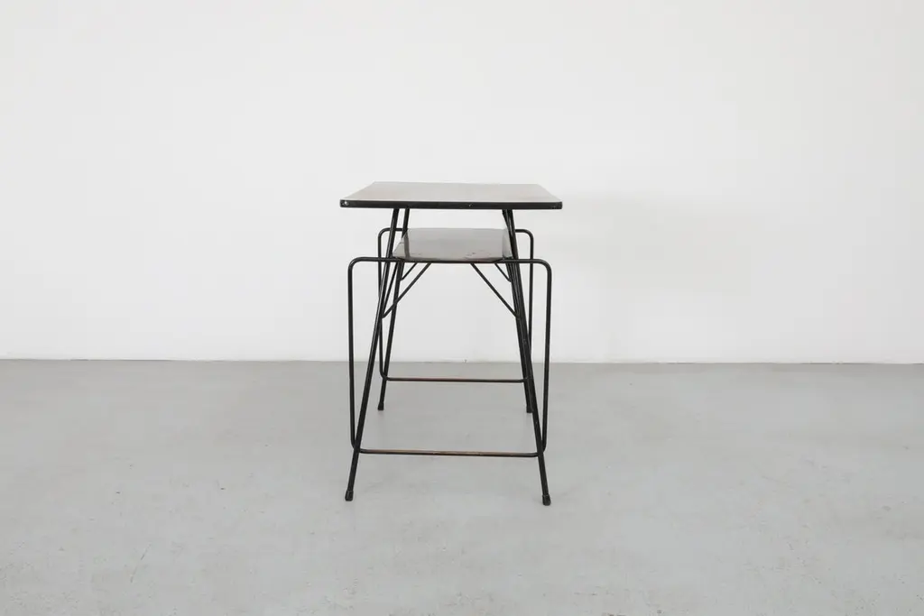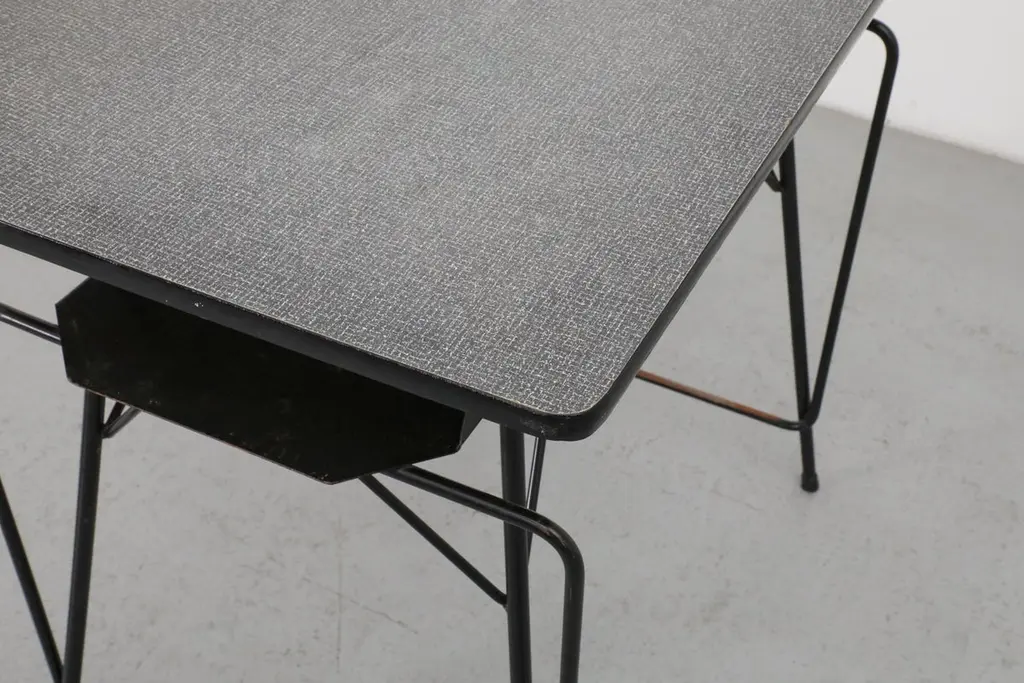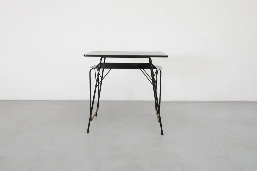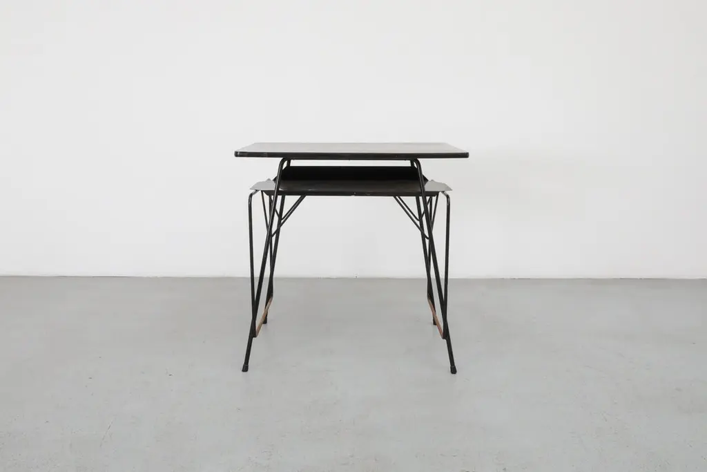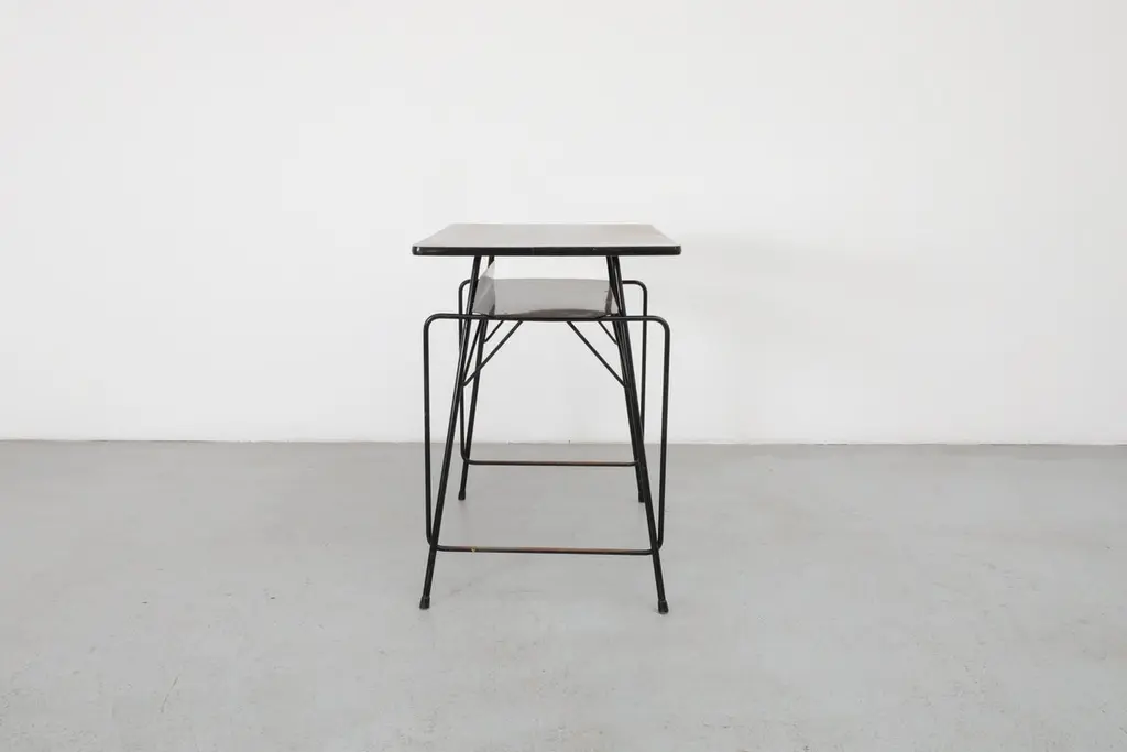 Mini Willy Van Der Meeren industrial desks for Tubax—perfect as an entry table or vanity, with a printed laminate top, black enameled metal wire frame, and black sheet metal shelf. Founded in 1948 by Jan Vits, Tubax became one of Belgium's leading metal furniture producers. By 1963, with around 200 employees, Tubax was at its peak and producing the now-iconic Van Der Meeren designs. This industrial-style desk from that era is in original condition, showing wear and enamel loss consistent with age and use. Seat clearance is 24.75" wide and 4.25" high. Priced individually. Piece may differ slightly in terms of wear from the one pictured. Similar versions with rounded or square wood edges, and a larger wood-edge model, are listed separately. More available with long lead time.