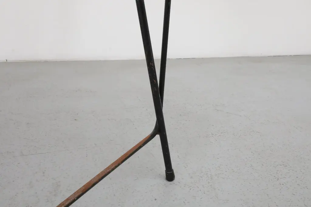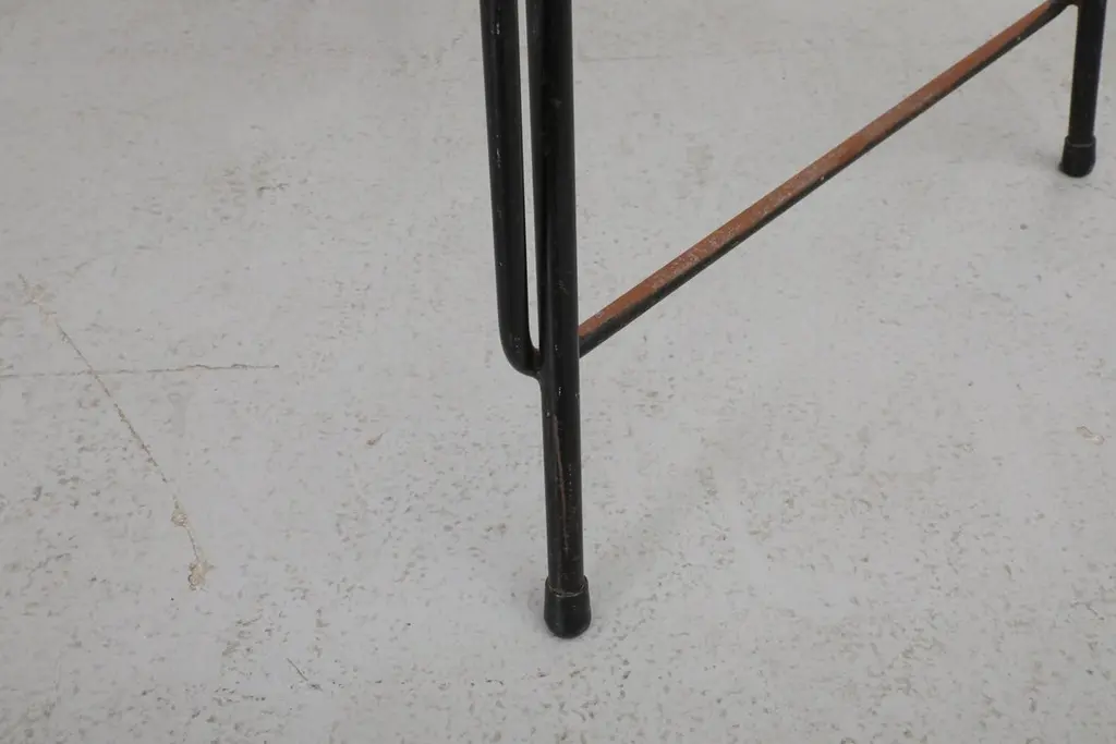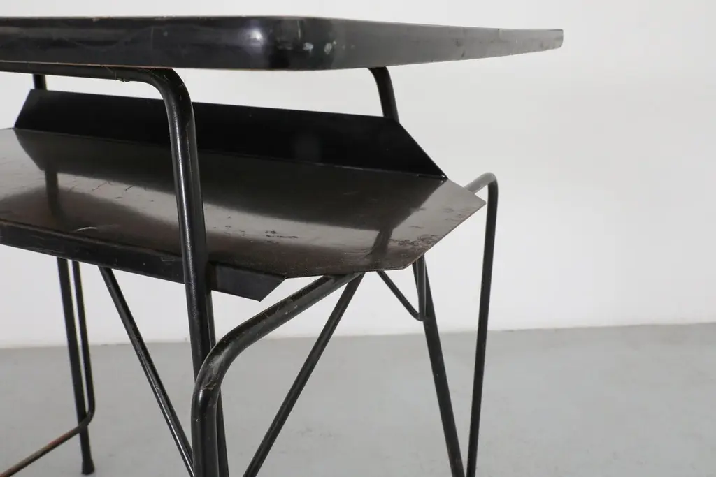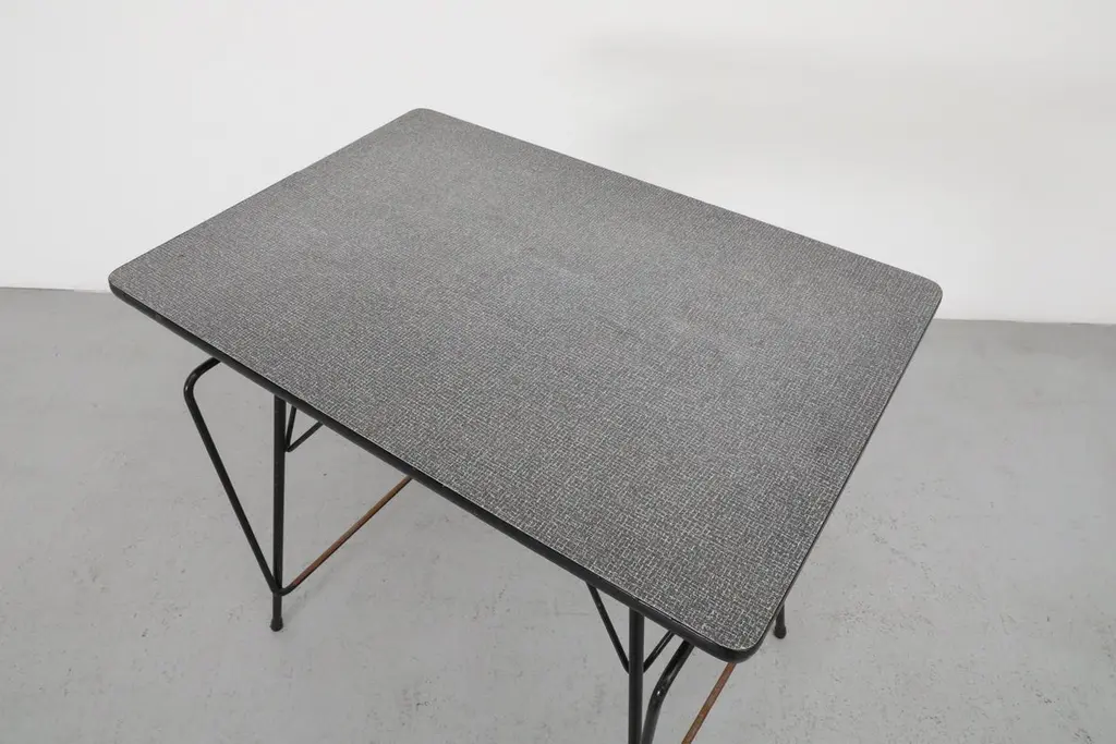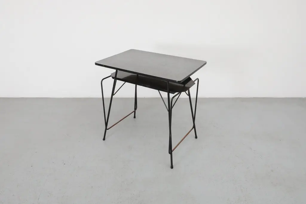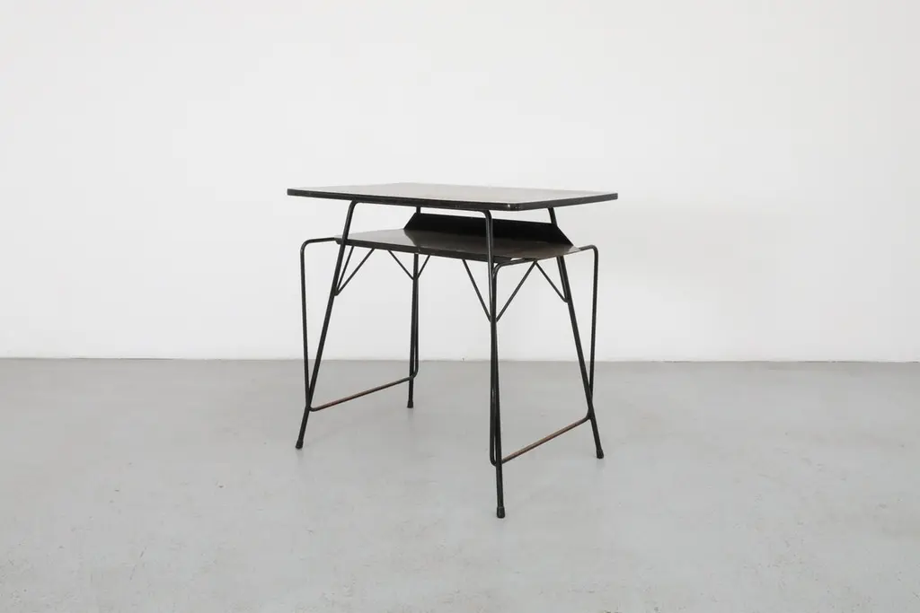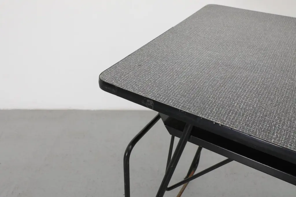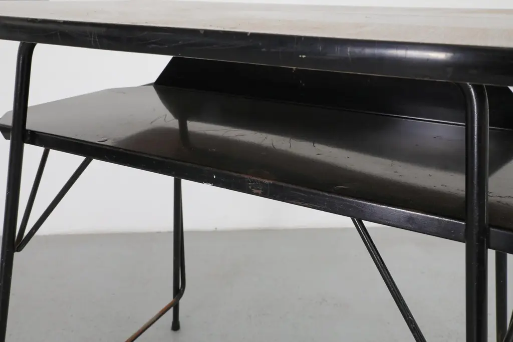 Mini Willy Van Der Meeren industrial desks for Tubax—perfect as an entry table or vanity, with a printed laminate top, black enameled metal wire frame, and black sheet metal shelf. Founded in 1948 by Jan Vits, Tubax became one of Belgium's leading metal furniture producers. By 1963, with around 200 employees, Tubax was at its peak and producing the now-iconic Van Der Meeren designs. This industrial-style desk from that era is in original condition, showing wear and enamel loss consistent with age and use. Seat clearance is 24.75" wide and 4.25" high. Priced individually. Piece may differ slightly in terms of wear from the one pictured. Similar versions with rounded or square wood edges, and a larger wood-edge model, are listed separately. More available with long lead time.