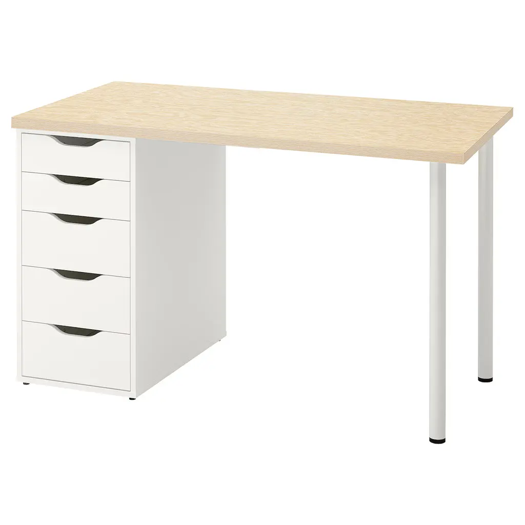 MITTCIRKEL / ALEX Desk - lively pine effect/white 47 1/4x23 5/8 ". The plywood-patterned edge band adds to the quality feel. The tabletop has pre-drilled holes to make it easier to attach to the underframe. The table top is made of board-on-frame, a strong and lightweight material.
