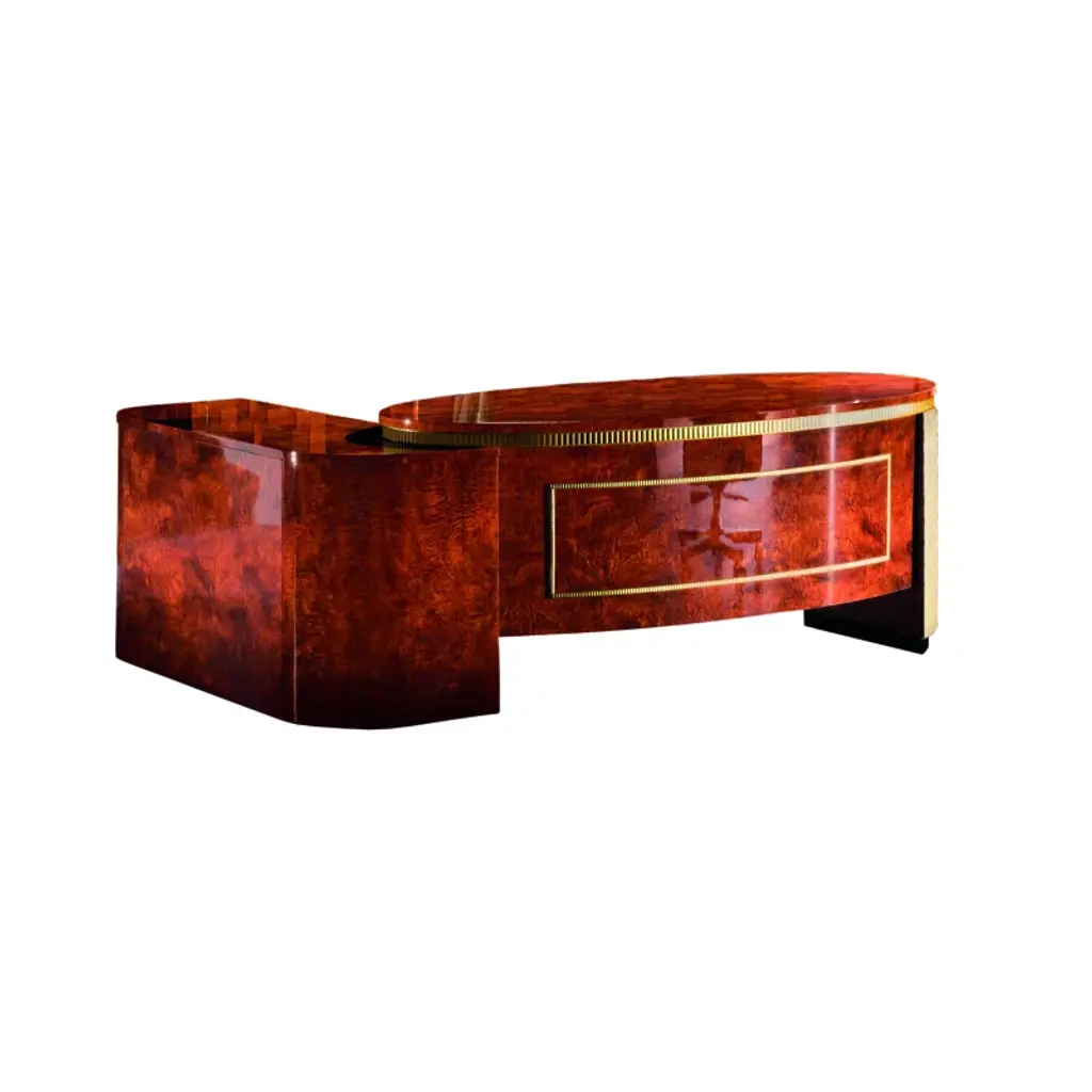 Writing desk made with a mix of raw materials: wood, leather, stainless steel and glass. Drawers in curved plywood, with a Makassar ebony finishing, equipped with drawers with full-extraction, hidden runners. Leather surface, legs and metal knobs with a glossy finishing. Extension worktop not included.