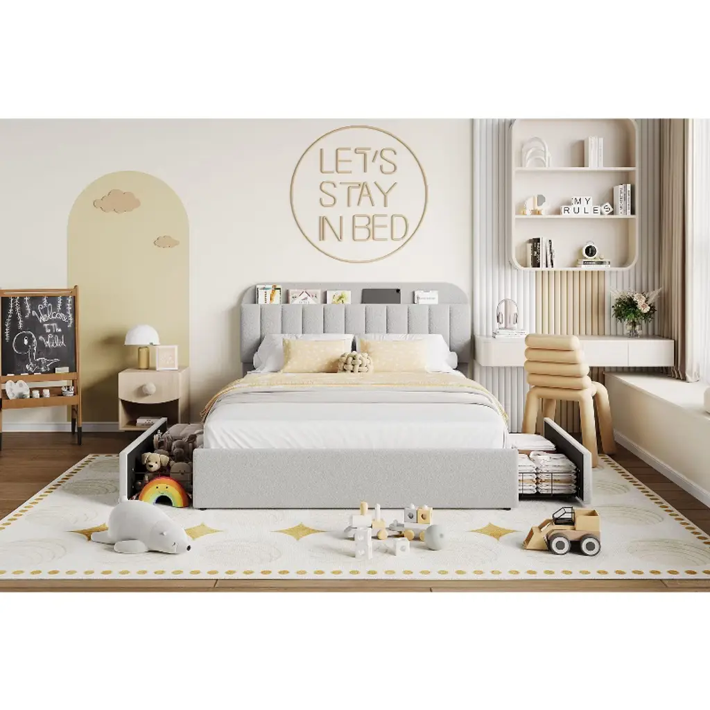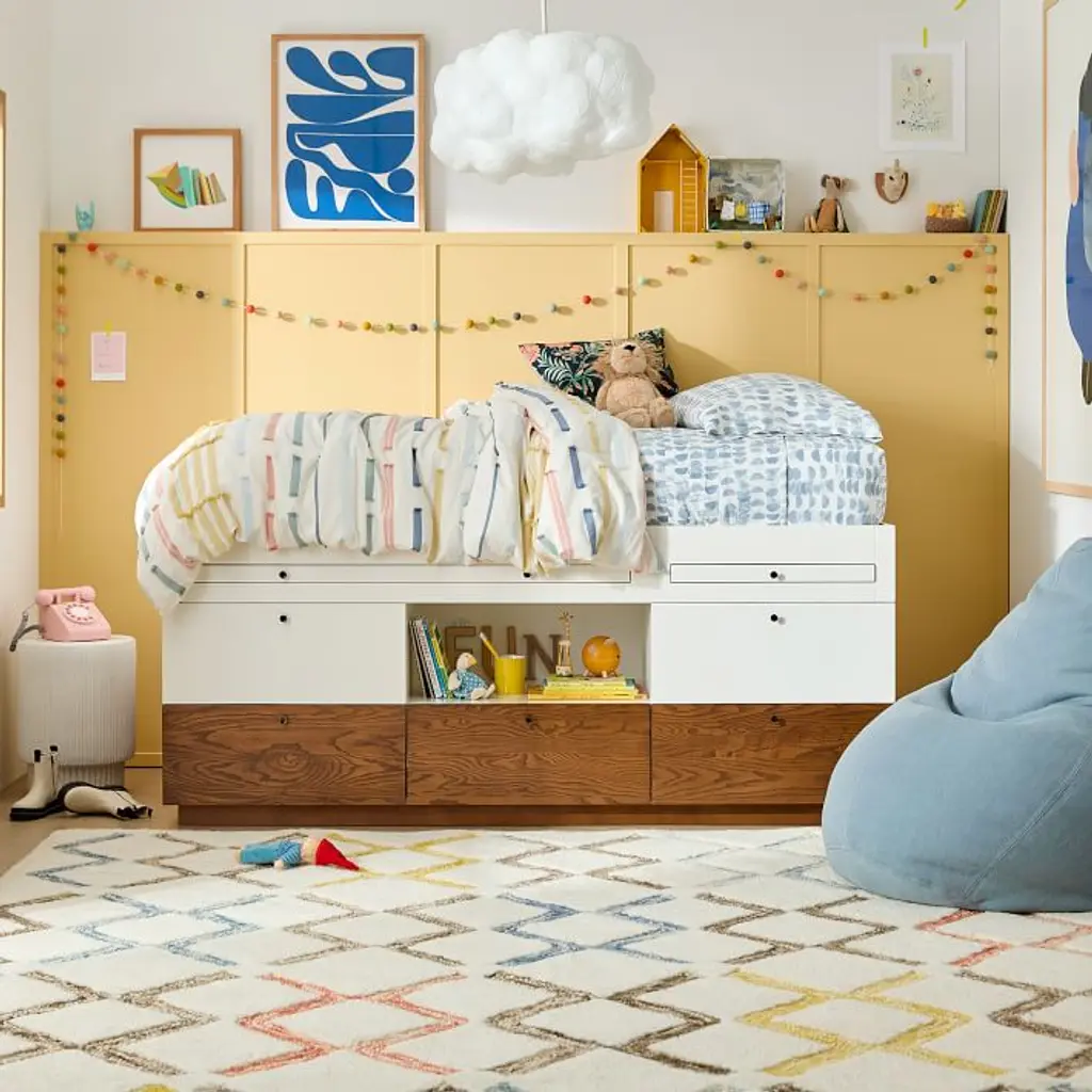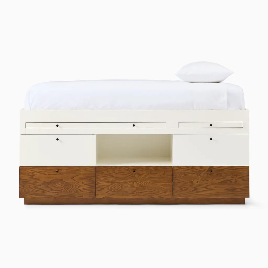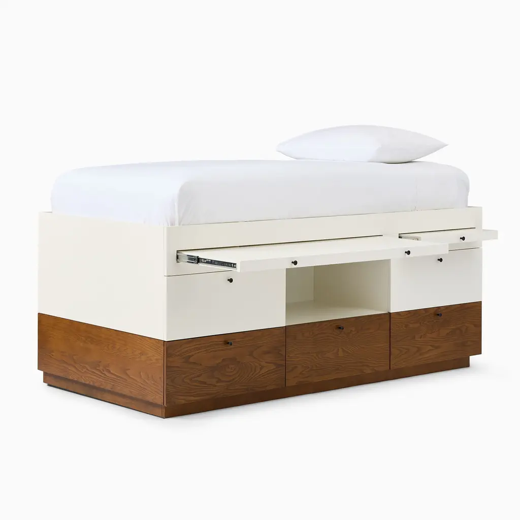 This versatile bed is a space maximizer. It has a mix of open & closed storage, plus a desk. Durably made & covered in child-safe finishes. GREENGUARD Gold Certified as low VOC.