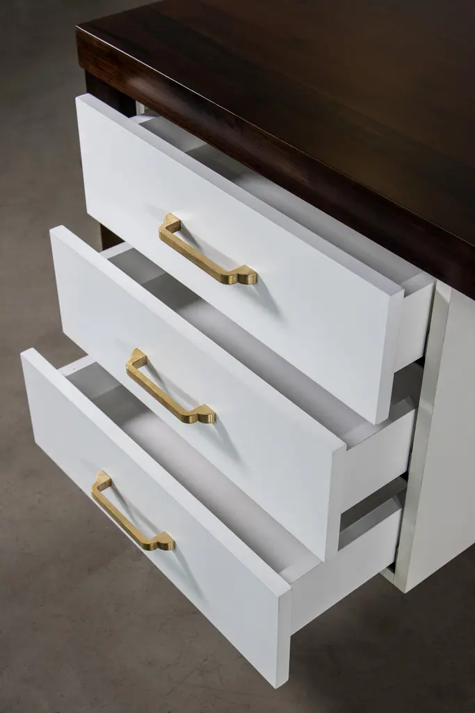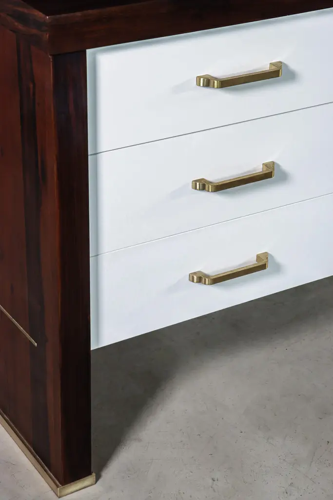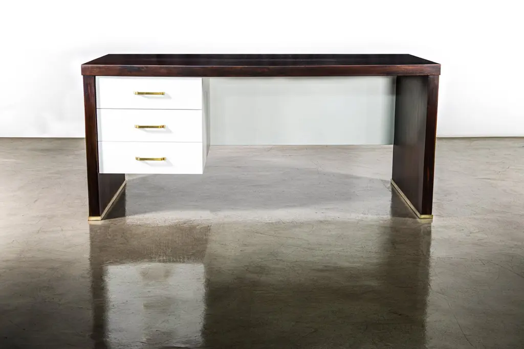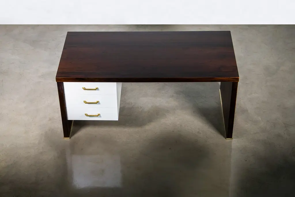 Lorenzo Modern Desk with Drawers in Argentine Rosewood & Bronze from CostantiniMeasurements are 66" W x 33" D x 29.5" HThis Classic yet modern desk features an Argentine Rosewood body and white mirror-polished lacquered face and drawers with bronze accents. The drawers feature soft-close hardware and can be used with the pulls of your choice, or as shown, with none. The entire pieces is handmade, including the oil-rubbed bronze detailing on the sides and feet. Available as shown or customizable to your desired size, finish, and more. With offices in New York and Buenos Aires, you can make the Lorenzo desk your own with Costantini’s team of Industrial designers and artisans, as well as review drawings and physical finish samples prior to production.About Costantini DesignCostantini is a furniture design and manufacturing company founded in 2002 by artist and designer William C Stuart. The name Costantini comes from his maternal grandfather, a first generation Italian-American. Born in New York City and raised upstate, William majored in studio art at Colgate University with a year abroad in Paris, graduating with honors. In 2001, he traveled to Buenos Aires and fell in love with the culture and craftsmanship instantly. He designed his first collection soon after and opened an art and design gallery in Los Angeles. A decade later, he came home to New York and now has a studio in the famed West Chelsea Arts Building where his works blur the lines between art and functional design. The team of artisans continue to produce the majority of the furniture in Argentina. Aside from private collections, some notable public projects include the Hotel Bel Air, the Sultanate of Oman, Bergdorf Goodman, NoMad Hotels, Four Seasons, Ritz Carlton, and Grand Hyatt. Our work has been featured in publications such as Architectural Digest, Galerie Magazine, the Wall Street Journal, Interior Design Magazine, Luxe, and more. Visit us at our New York studio, open by appointment.