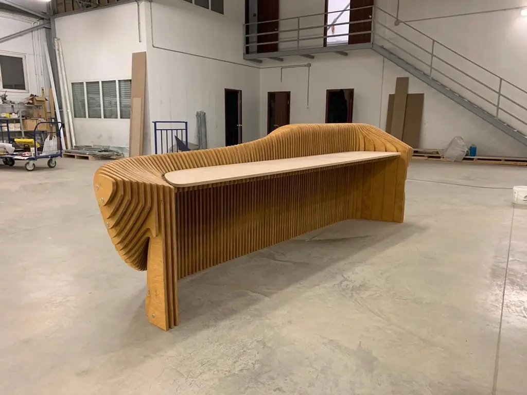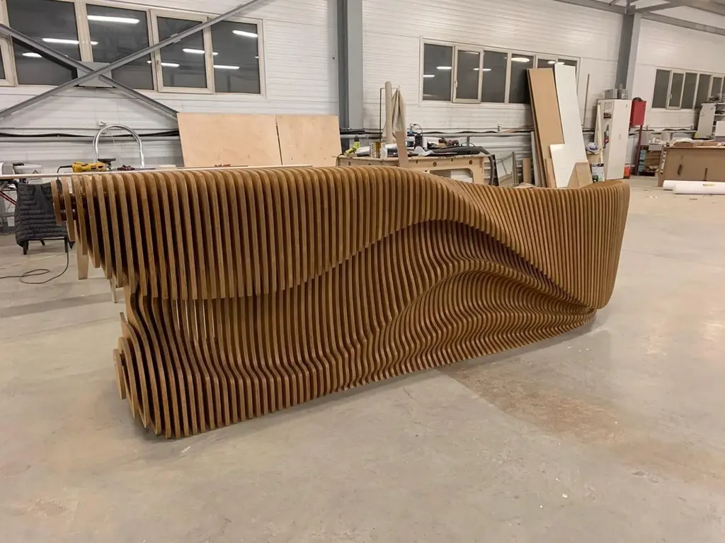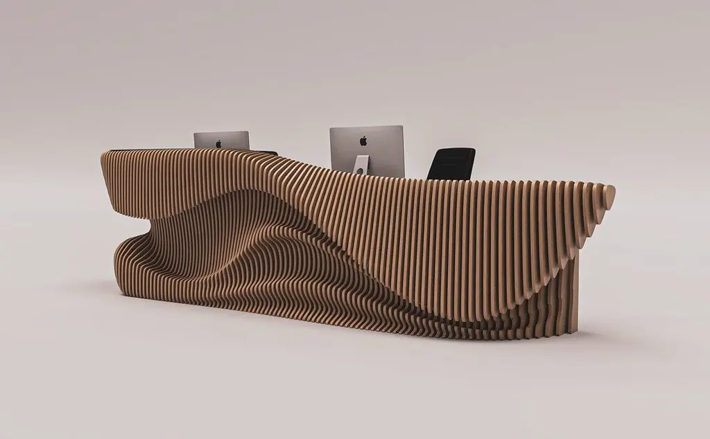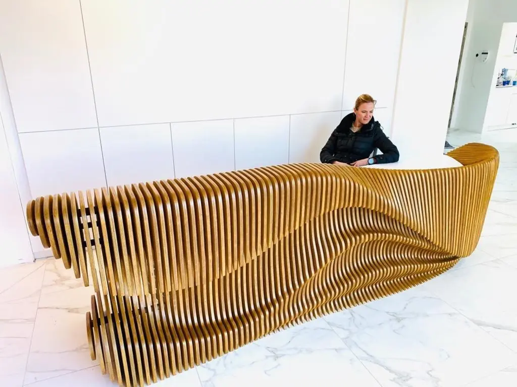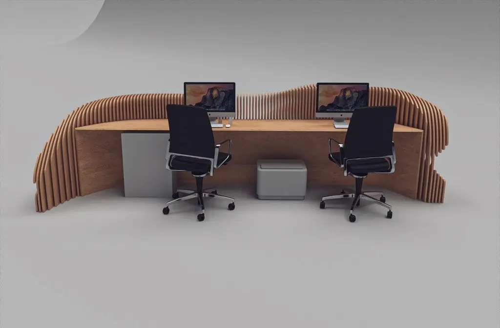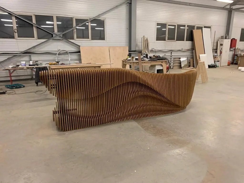 A striking blend of sculpture and function, this parametric reception desk features a fluid, dynamic form craftedfrom 18mm plywood and reinforced with metal rods. Designed to be a statement piece, it transforms anyreception area into a modern, architectural space while ensuring durability and practicality.Dimensions: L 4000 mm × W 1000 mm × H 1200 mmWeight: 900 kgMaterials: 18 mm plywood, metal rods, wax oil