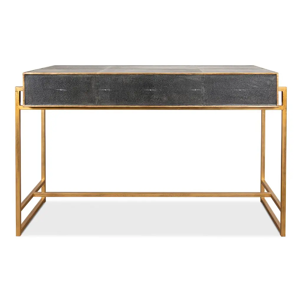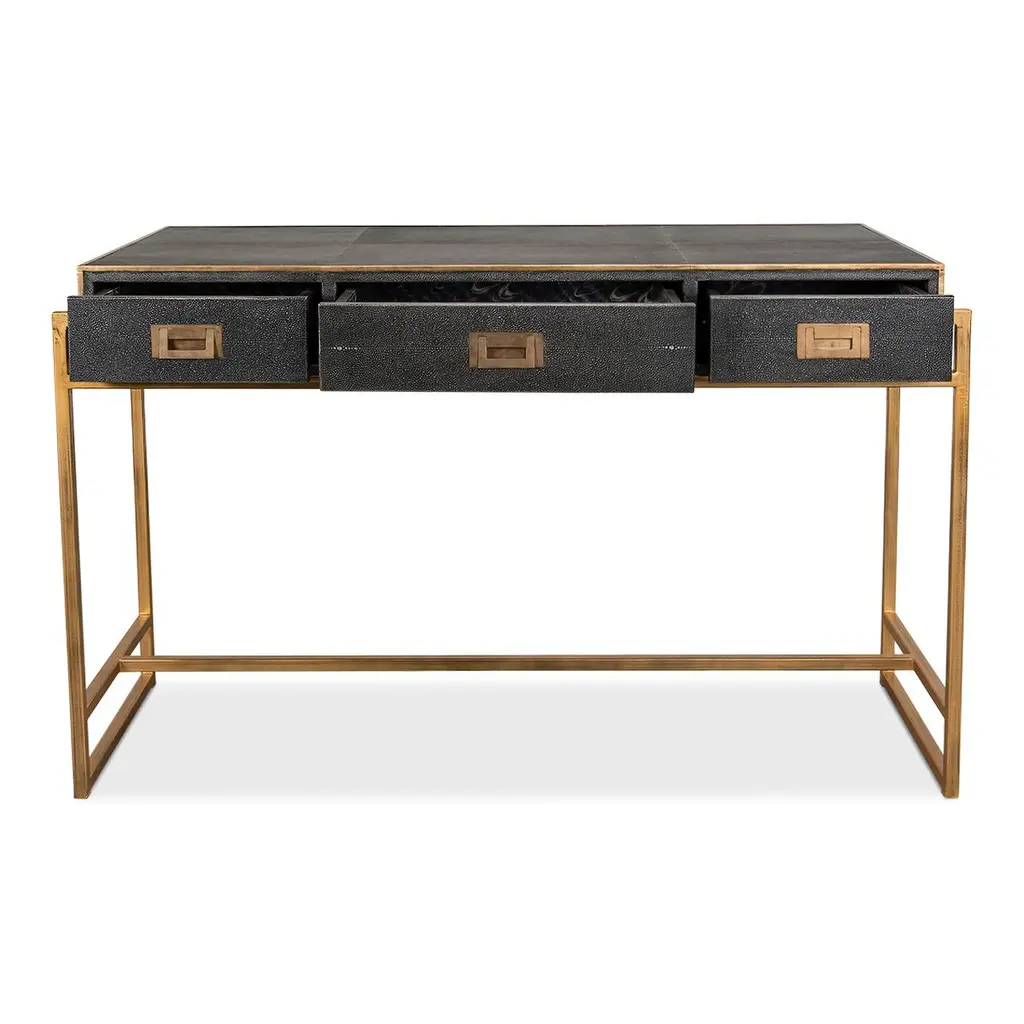 A modern shagreen embossed leather-wrapped desk with a brass tone iron-framed base. Three drawers with marbleized paper-lined interiors and with brass pull handles.Dimensions: 49" W x 22" D x 31" H.