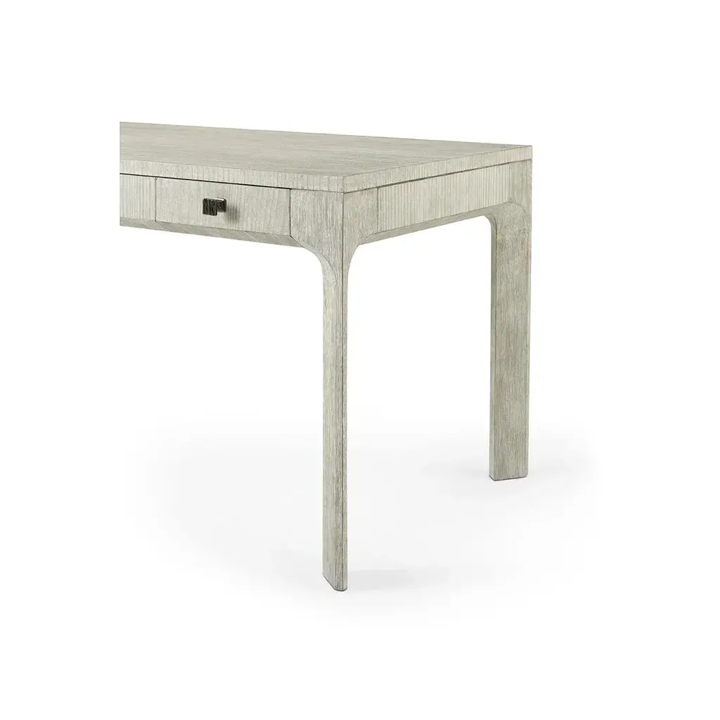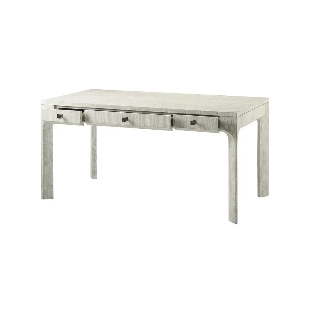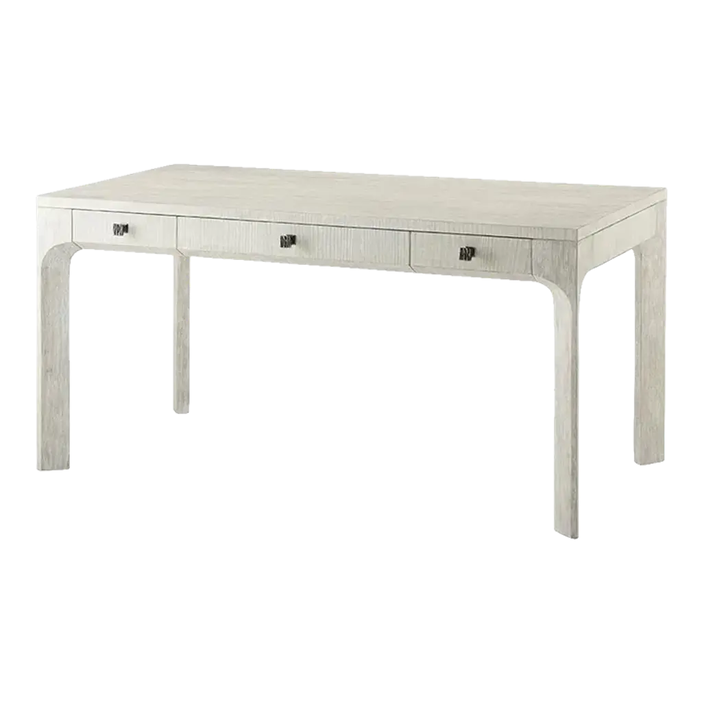 handcrafted wire-brushed cerused pine in a light and subdued Sea Salt finish, the desk displays three functional drawers with organic ribbed metal knobs in our Dark Sterling finish and a beveled-shaped cross-section. Dimensions: 60" W x 30" D x 30" H