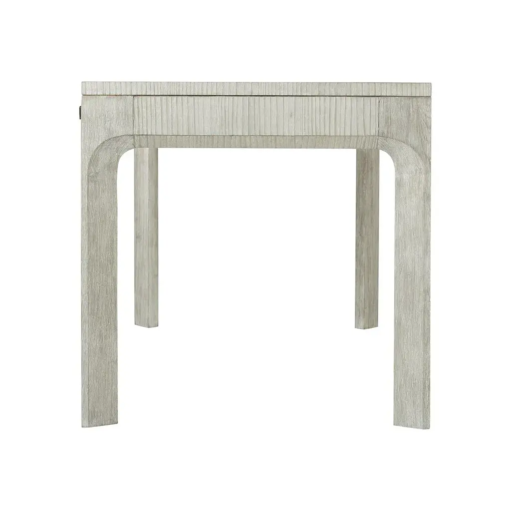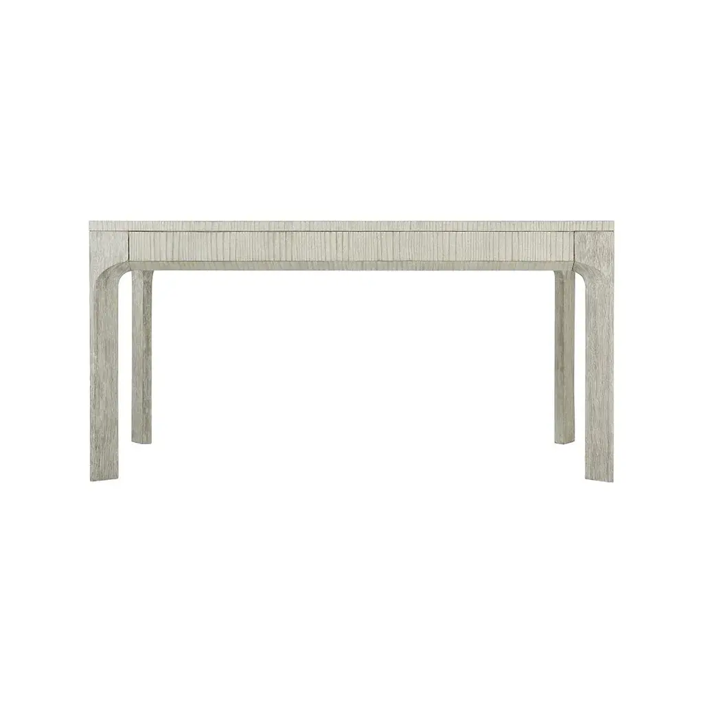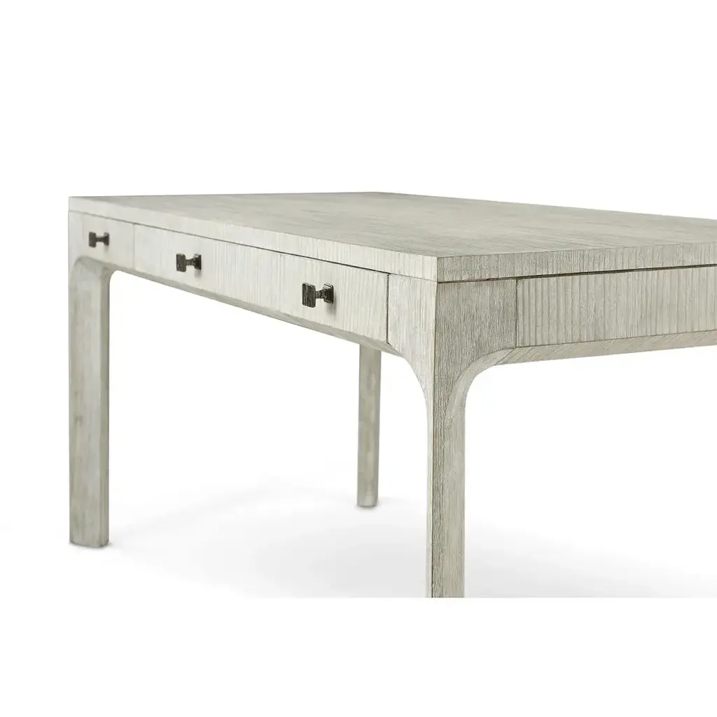 handcrafted wire-brushed cerused pine in a light and subdued Sea Salt finish, the desk displays three functional drawers with organic ribbed metal knobs in our Dark Sterling finish and a beveled-shaped cross-section. Dimensions: 60" W x 30" D x 30" H