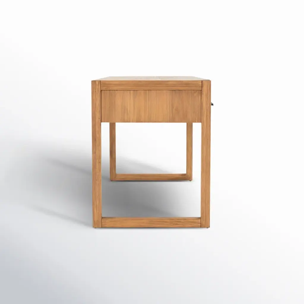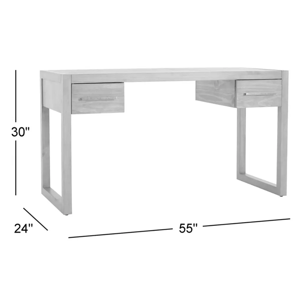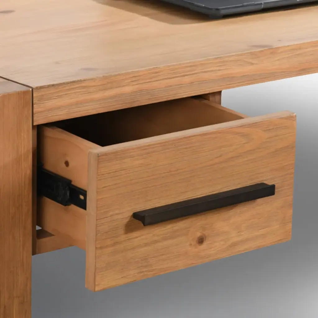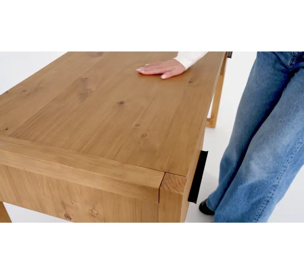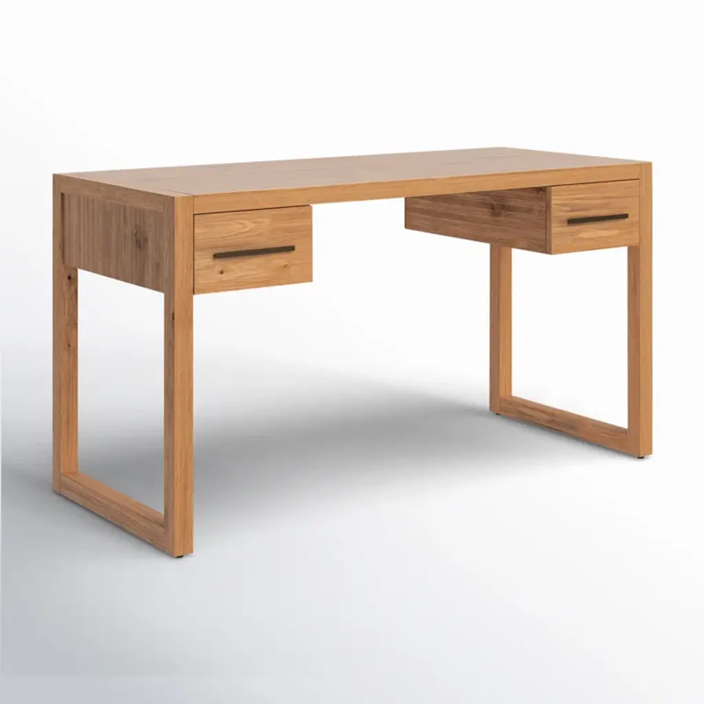 Simple and sophisticated, this minimalist desk captures the beauty of Scandinavian design. Made from kiln-dried solid pine wood, its rich finish highlights the natural grain. Open U-shaped legs provide support, while two small drawers with sleek metal pulls add functionality. With a finished back, it looks great lining a wall or in the center of the room.