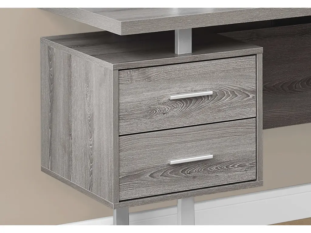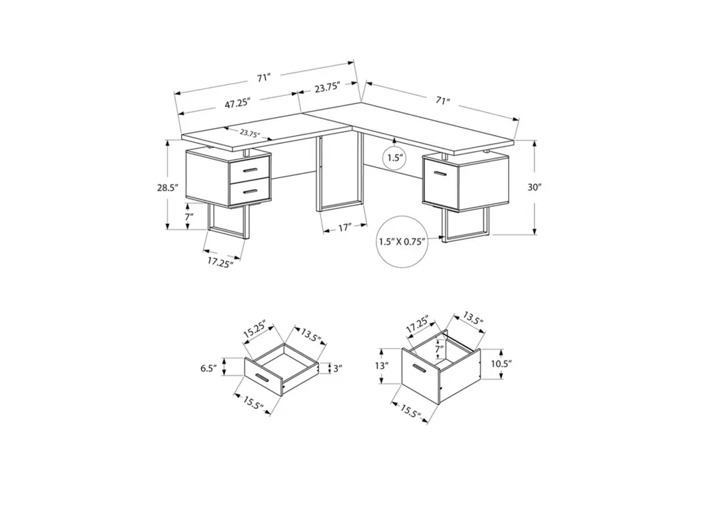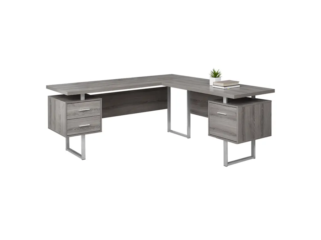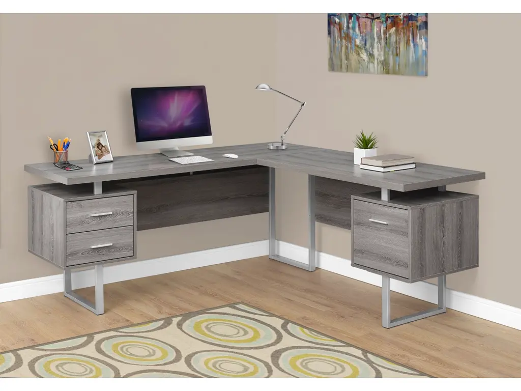 Give your home office a promotion with this extra-large corner desk. The L-shaped, floating desktop in a dark taupe wood-look finish is generously sized and leaves space to use the tops of the drawer units as shelves. A reversible configuration lets you set up the desk with the drawer units on either side as desired. The space between the three storage drawers allows ample room to easily move around your workspace. Providing support are robust metal legs in a silvertone finish that matches the drawer handles. This L-shaped computer desk saves space when used in a corner, but is finished on all sides for a polished look wherever it is placed in a home office.