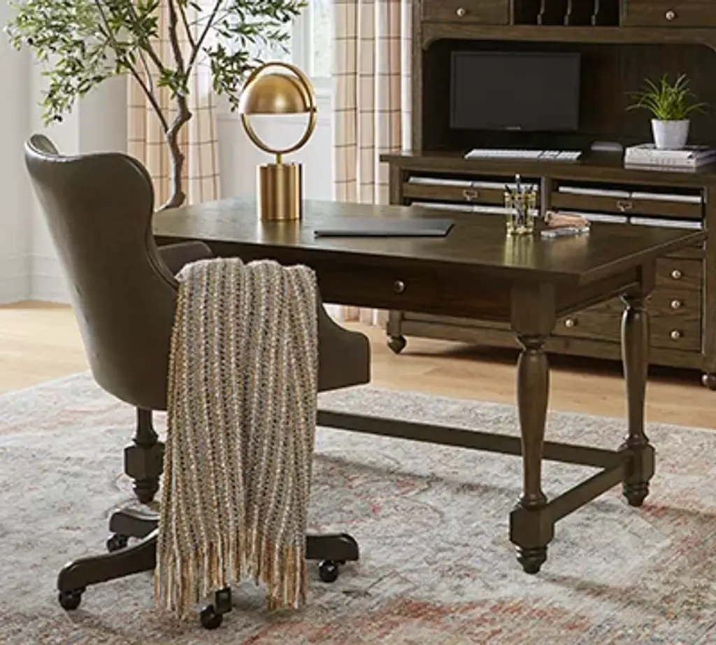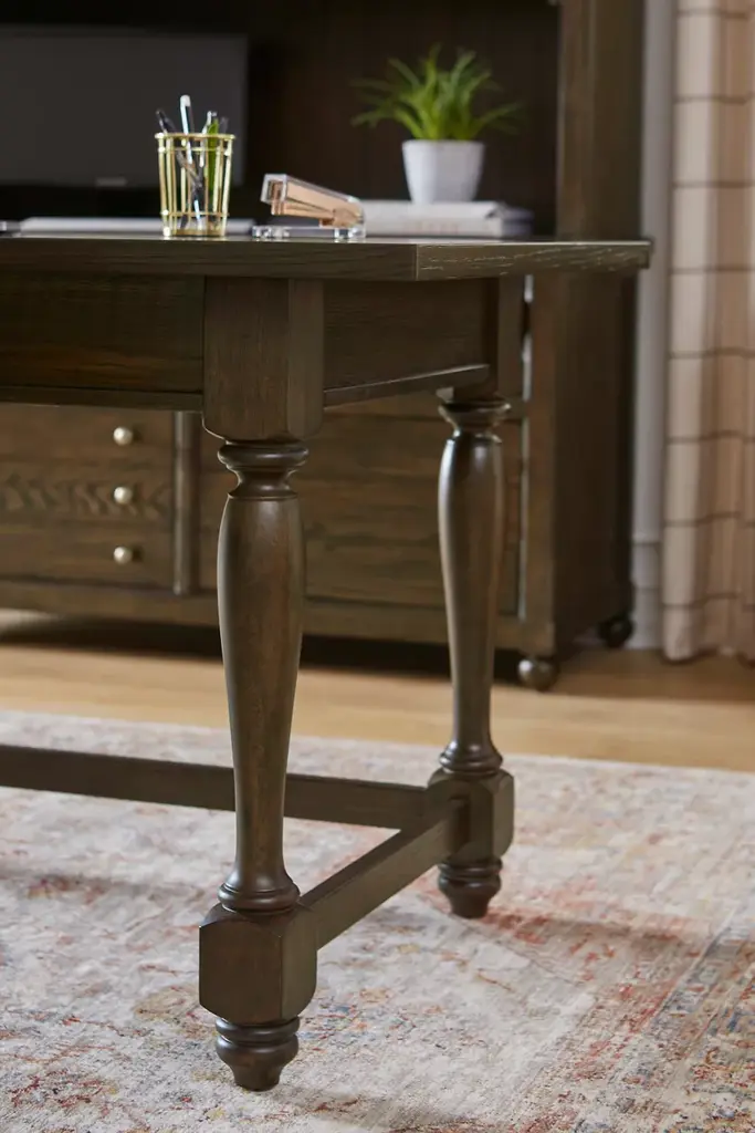 With its distressed brown finish and satin brass knob hardware, our Montgomery writing desk features a sleek silhouette that can be placed in a variety of places. Crafted with hardwood solids and white oak veneers, this desk has turned legs that add elegant sophistication. One drawer with a flip-down keyboard tray provides storage room for your writing utensils and papers, while cord management ensures a tidy workspace.
