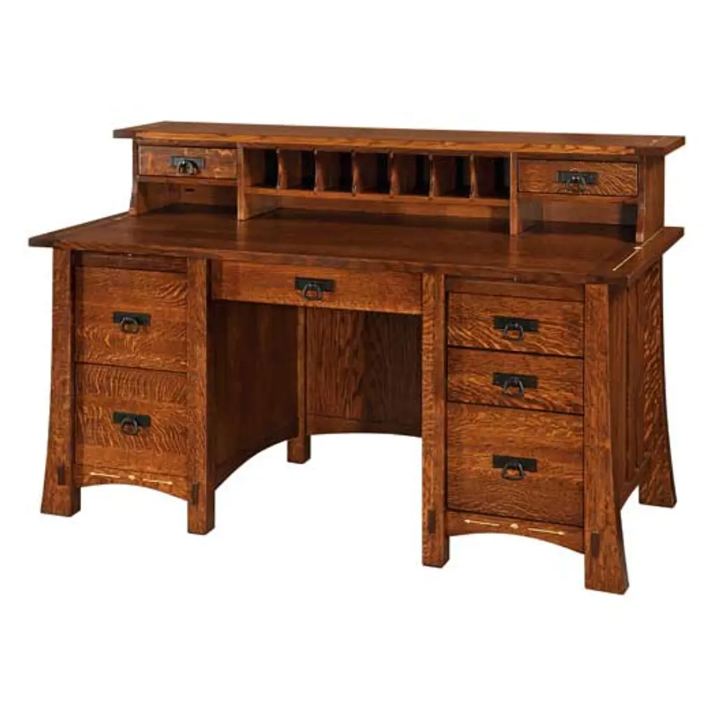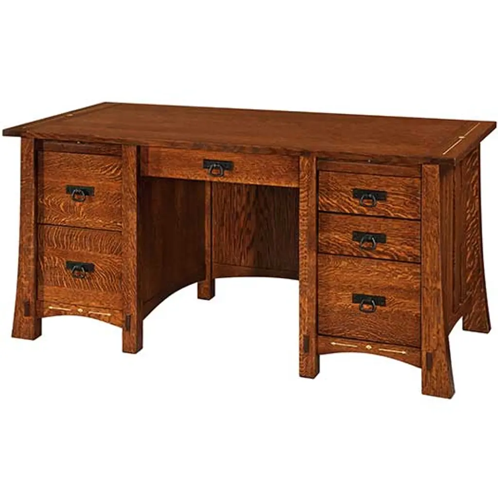 The Amish Morgan Desk is an Arts and Crafts style featuring sweeping legs, Yellow Heart wood inlays, bread board top and black period Mission hardware. This awesome Amish made desk is sure to turn heads in any setting!