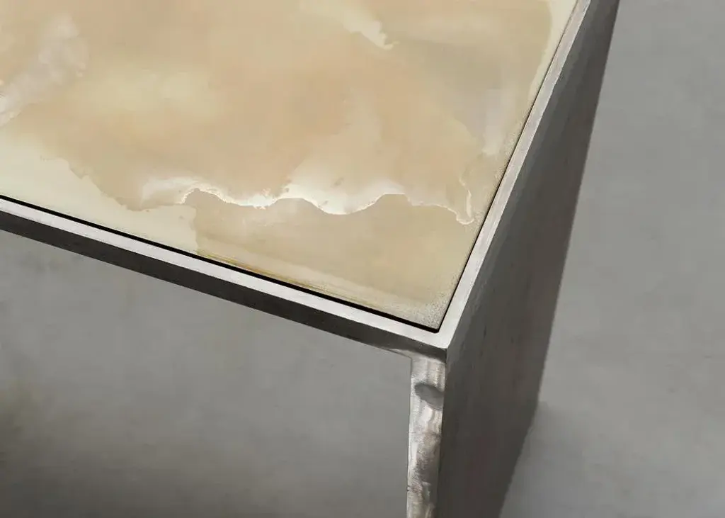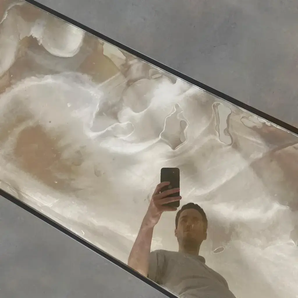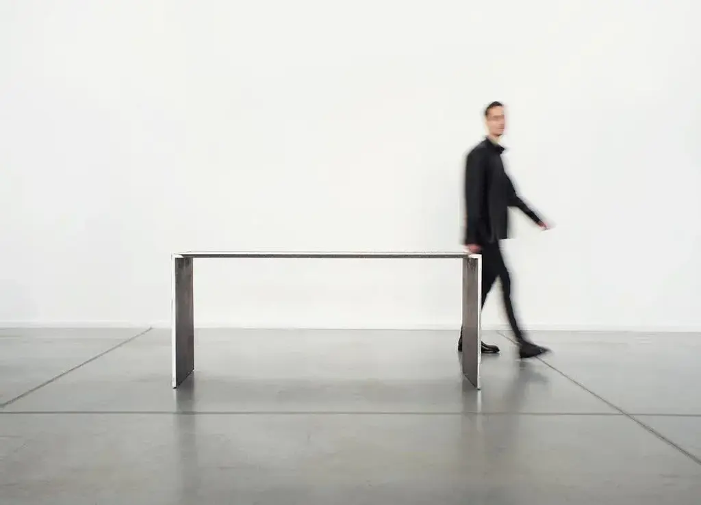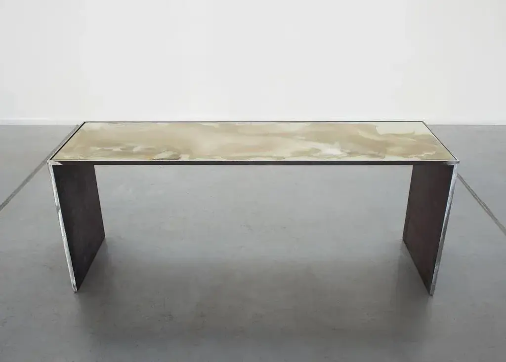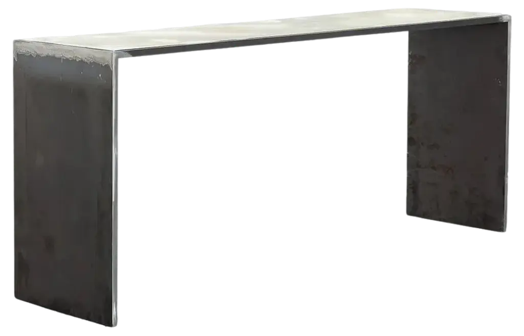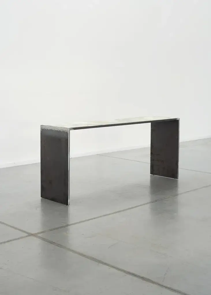 Memento Mori desk 01 by Boldizar Senteski Dimensions: 180 W x 45 D x H 72 cm Materials: Raw steel, Oxidized mirror. Growing up in Budapest, Boldizar Senteski was influenced by the eclectic environment of the city where post soviet brutalism blends with the elements of a once prosperous monarchic era. Boldizar creates his unique and limited edition collectible design pieces by incorporating fragments from the urban landscape. He celebrates the simultaneous existence of past and future, passing and renewal, decay and flourishment.