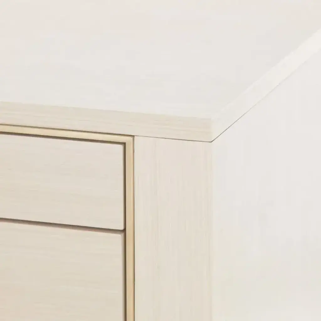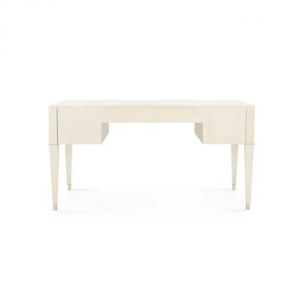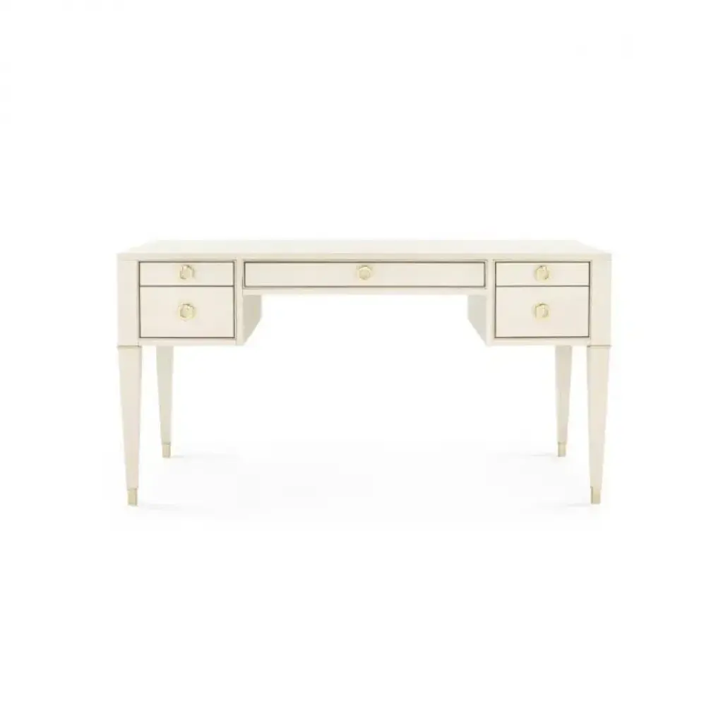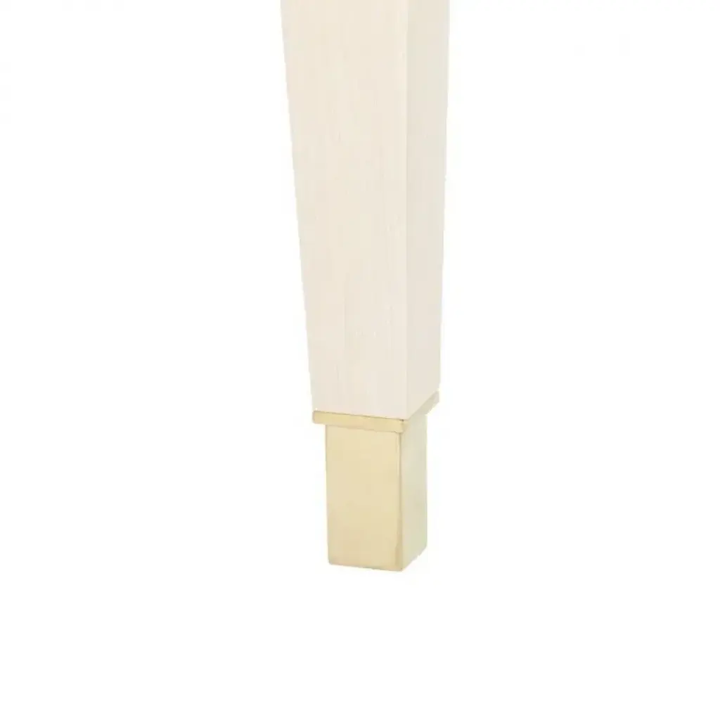 The chic Morris Desk taps French-styled elegance and gorgeous champagne accents to create a dignified piece that could be used as a home workspace or even a bedroom vanity, paired with a mirror. A refined silhouette and thoughtfully designed details, such as slim, tapered legs and shining sabots, bring the piece’s old-world charm to the forefront. Petite proportions mark the look of its five drawers, with two flanking its sides and sleek middle drawer in the center. They’re all bordered by a champagne-gilded ribbon, which creates a glamorous contrast to the Morris’s straight-grain veneer finish in blanched oak. Topped with matching metallic pulls with geometric flair, the drawers softly glide to reveal expertly crafted stained interiors, perfect for storing anything from office supplies to cosmetics. Each luxurious element comes together in graceful harmony, resulting in a fabulous furnishing you’ll love.
