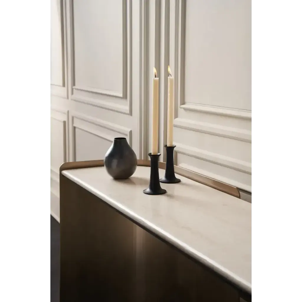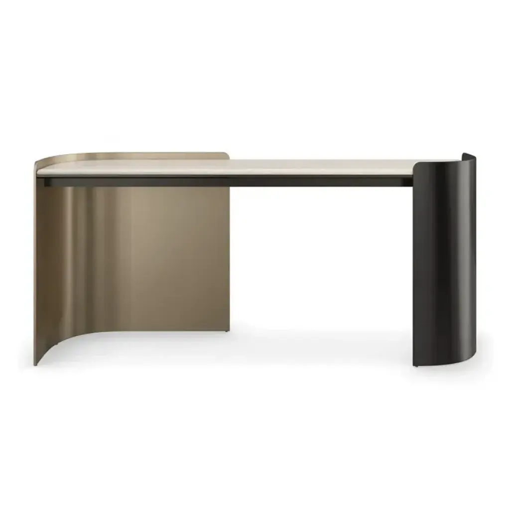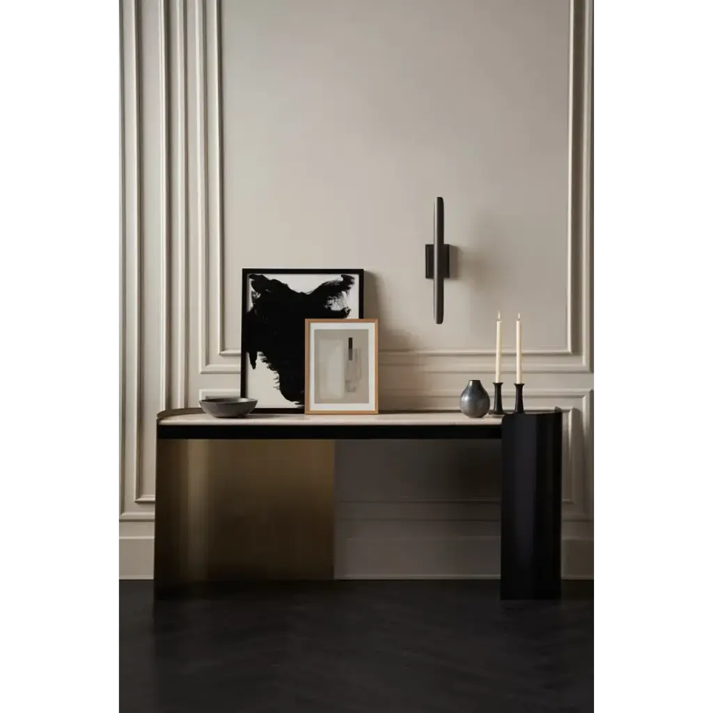 With an inherent rhythm and sleek design, the Movement console is fluid in both form and function. Artfully integrating sensual curves with muted lines, a Creme Travertine stone top is balanced on metal legs in contrasting bronze finishes for added drama. Makes an alluring statement in halls, entryways, and home offices as a minimalist desk.