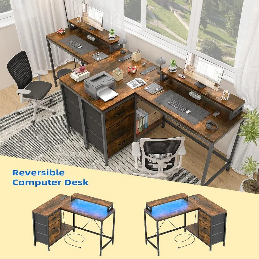 Transform your workspace or gaming station with the Nasitip 43" L-Shaped Desk—a multifunctional solution designed for style, comfort, and convenience. Featuring vibrant RGB LED lighting with over 60,000 color options, this desk creates a fully immersive atmosphere tailored to your mood. The built-in power station keeps your devices charged with 4 AC outlets and 2 USB ports. An elevated, reversible monitor stand promotes better posture, while the 3-drawer fabric storage system keeps your essentials organized and dust-free. With a sturdy metal frame and water-resistant finish, this corner desk is built for everyday durability whether in a bedroom, office, or studio.