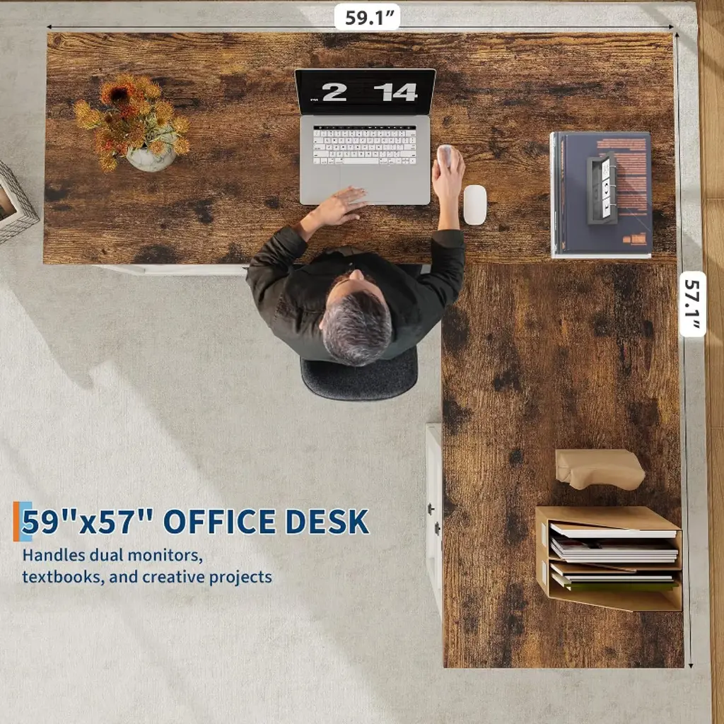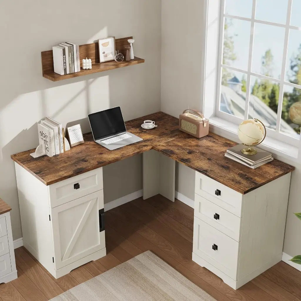 Elevate your workspace with the Nasitip 60" L-Shaped Executive Desk, where farmhouse charm meets modern functionality. Featuring a spacious corner design, this desk offers ample surface area for your computer, paperwork, and daily essentials. With four drawers and an adjustable side cabinet, organizing files, office supplies, and books is effortless. The warm brushed finish and metal handles add timeless character, while the engineered wood construction ensures durability. Whether you're working from home or creating a focused study space, this desk blends style, storage, and space-saving practicality.