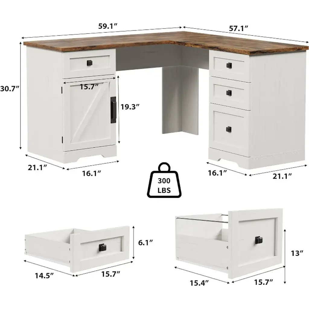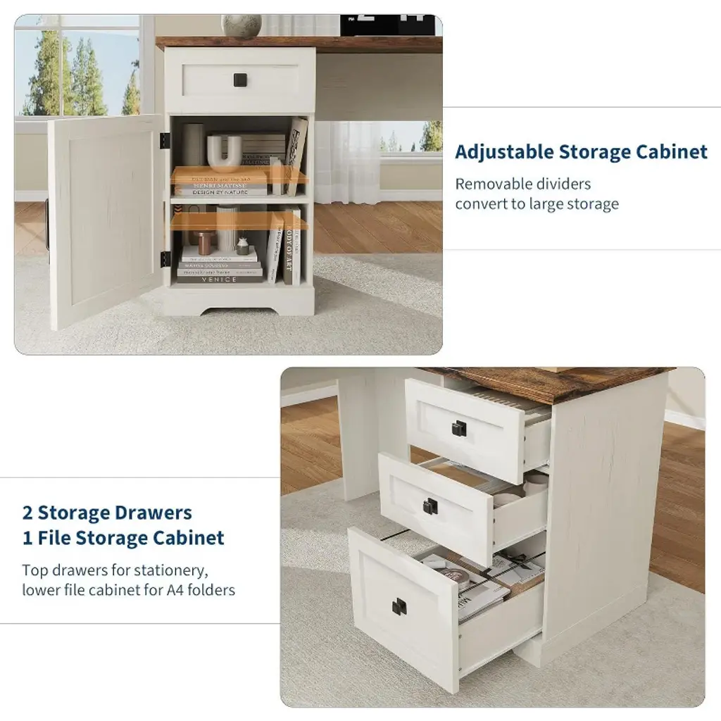 Nasitip 60" White L-shaped Executive Desk, Farmhouse Corner Computer Desk With File Drawers And Adjustable Storage Cabinet