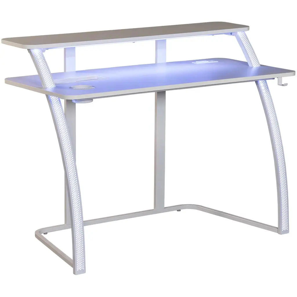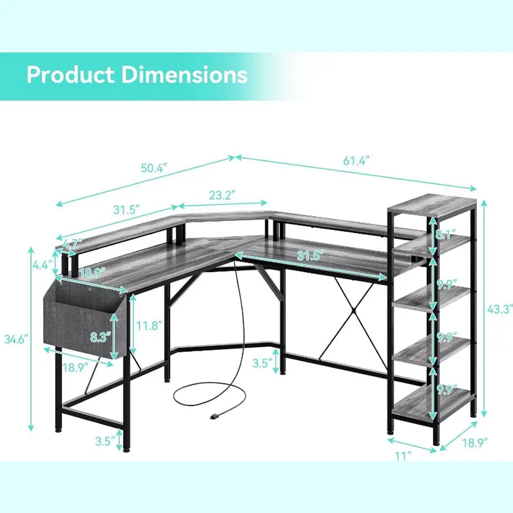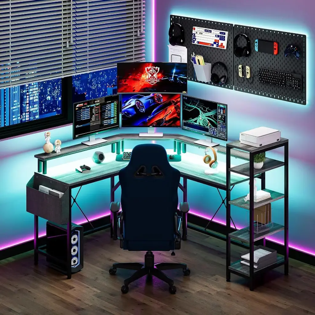 Elevate your workspace with the Nasitip 62" L-Shaped Gaming and Computer Desk—an ergonomic and multifunctional solution ideal for both home offices and gaming setups. Crafted with a modern iron frame and lacquered wood surface, this corner desk offers ample surface area, a full monitor riser, and five open shelves to keep your essentials organized and within reach. Designed with built-in RGB LED lights and integrated power outlets, it brings dynamic lighting and seamless device charging to your fingertips. Whether you're working, streaming, or gaming, this desk delivers style, convenience, and performance all in one.
