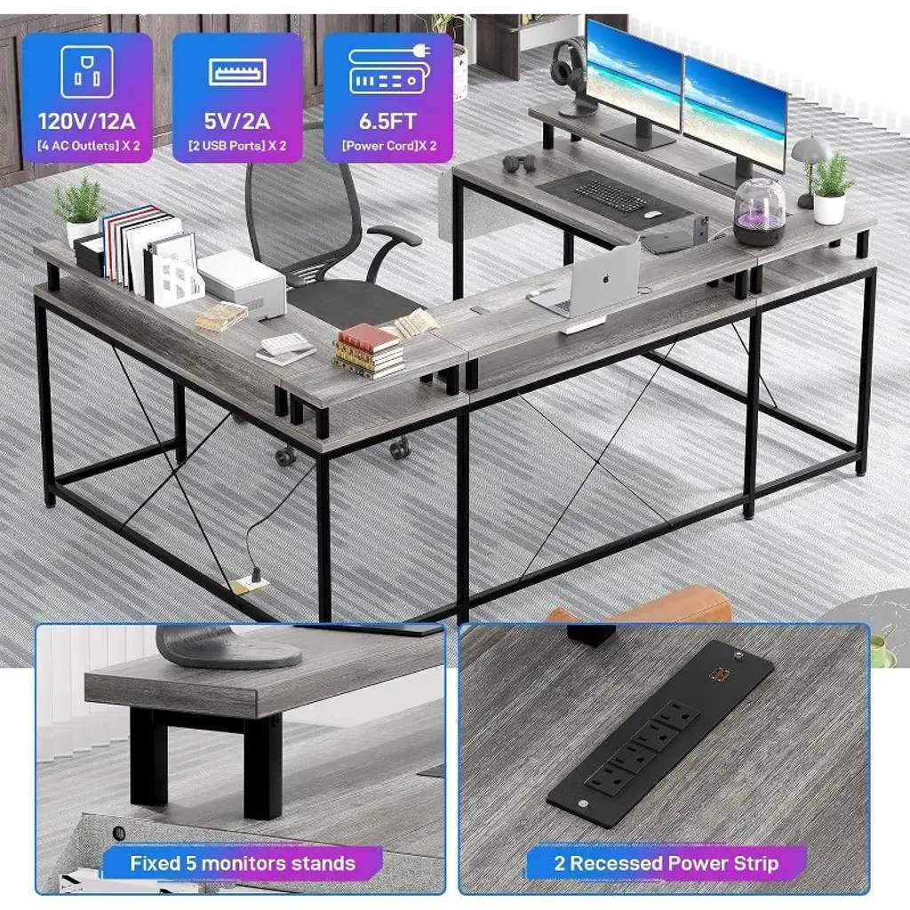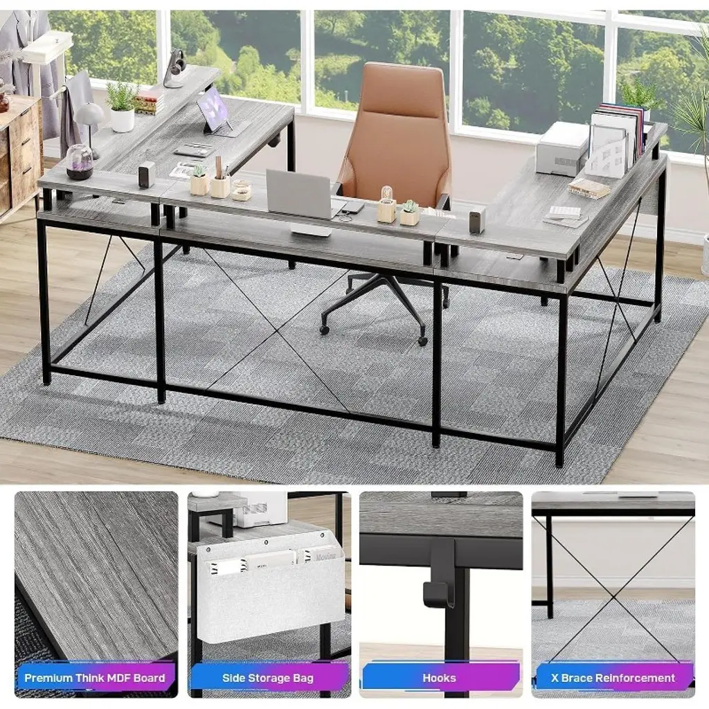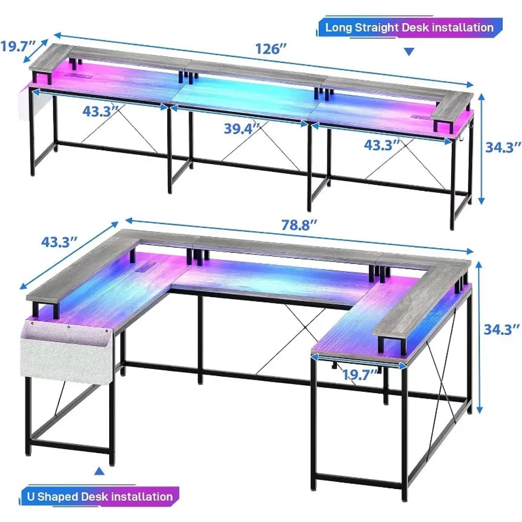 This 78.8" reversible U-shaped desk transforms into an L-shaped or extended 126" two-person workstation. Features three spacious desktops, a full-length monitor stand, and 4 power outlets + 2 USB ports for easy device charging. Customize your setup with dynamic RGB LED lighting (60,000+ colors, app/remote control). Built with sturdy engineered wood and metal legs (600 lb capacity), it includes ample storage shelves for organization. Ideal for home office, gaming, or workstation use. Available in multiple colors (black/white/pink/gray/brown). Assembly required.
