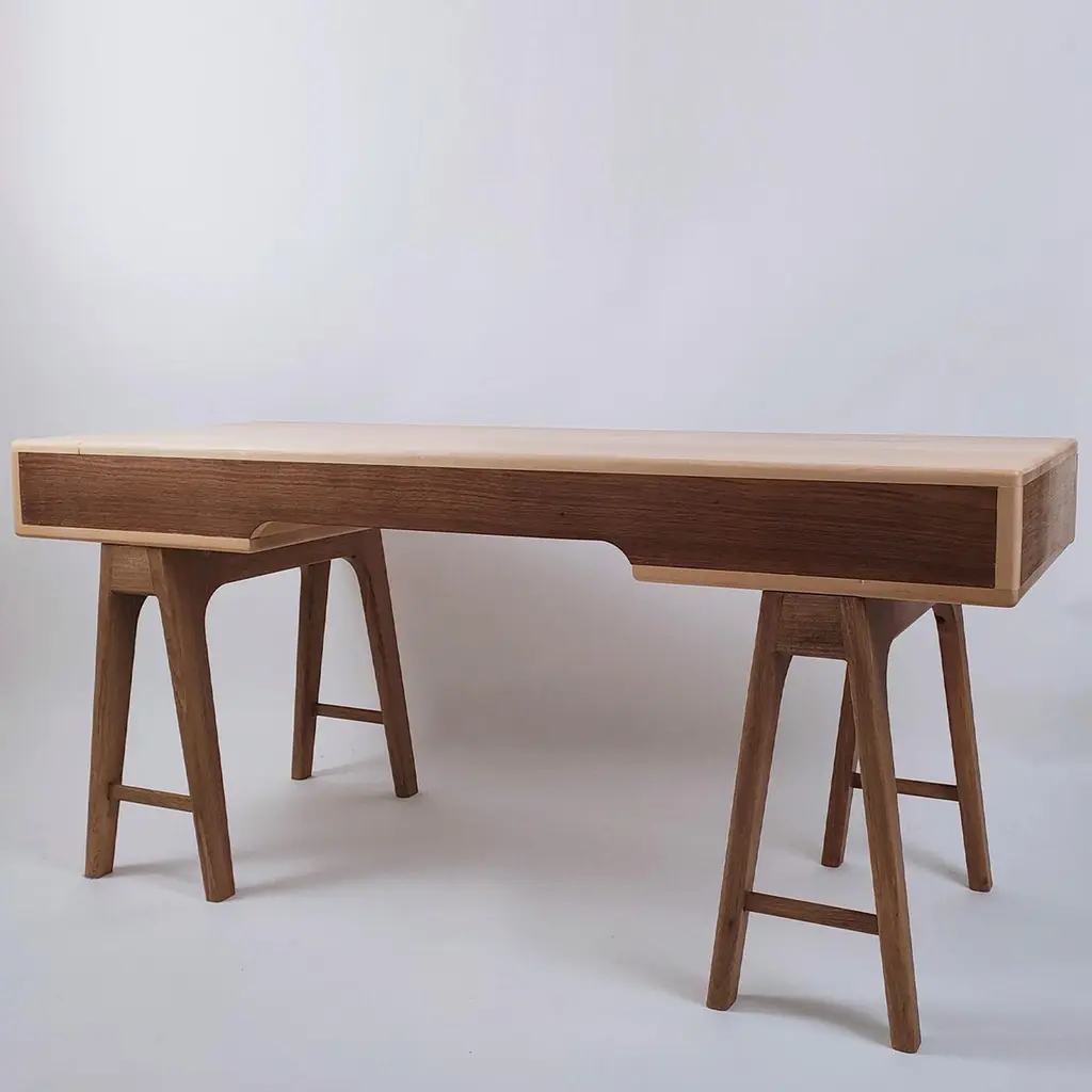 The Nathalie Desk is the ultimate workstation, featuring two trestle legs and a spacious tabletop with hidden drawers to keep the office space stylishly uncluttered. A Scandinavian-style design that channels its penchant for sleek, essential, uncomplicated architecture, this desk combines walnut (base and drawer) and solid maple (top) wood for a suggestive chromatic contrast. Drawers are built with dovetail joints and are equipped with hidden, metal sliding guides, and Blumotion closure. Fully customizable upon request, please contact the Concierge for details.