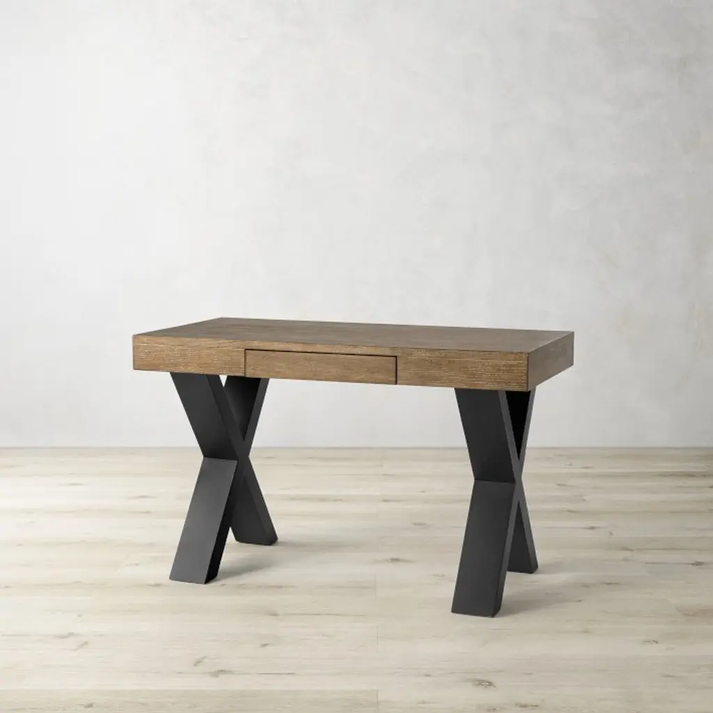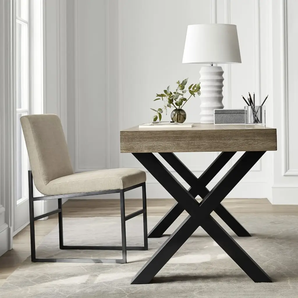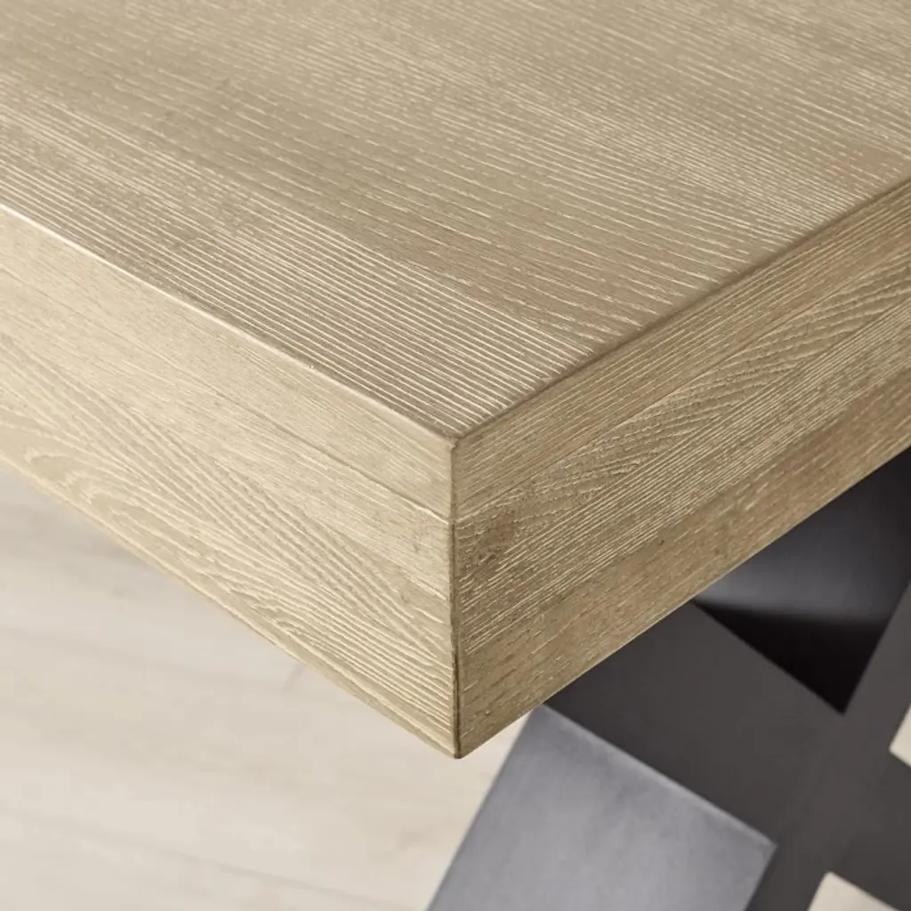 Crafted by master furniture builders with American ash veneer and steel, this sizeable desk brings rich texture to contemporary design. Set on bold steel X bases, the substantial top offers ample workspace and a drawer for essentials.