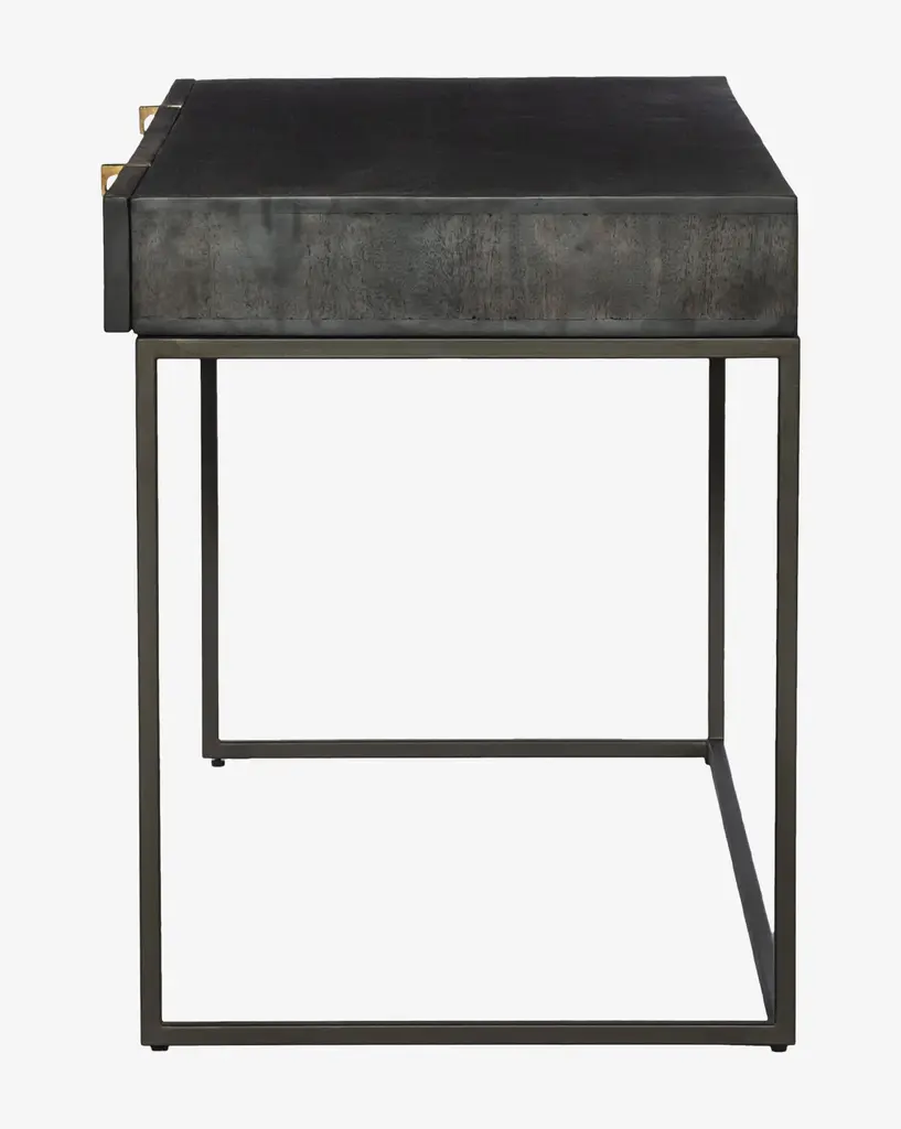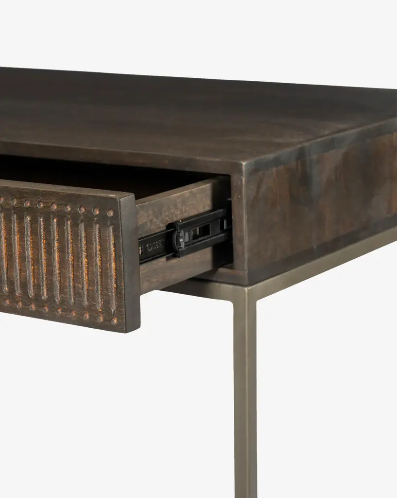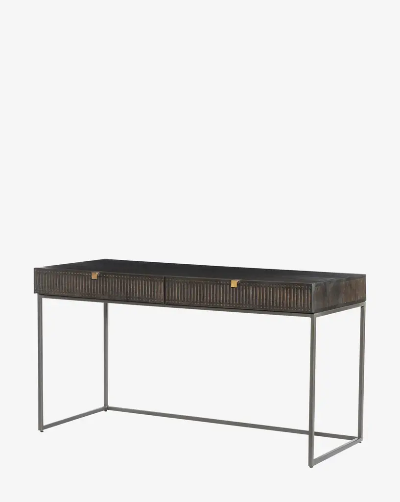 Expertly crafted with an artisan feel, the Nevan Writing Desk features unique linear carvings bringing dimension to its simple form. Two drawers provide just enough room for desk storage, as slim iron legs combine with the textured wood frame for an airy, contemporary look.