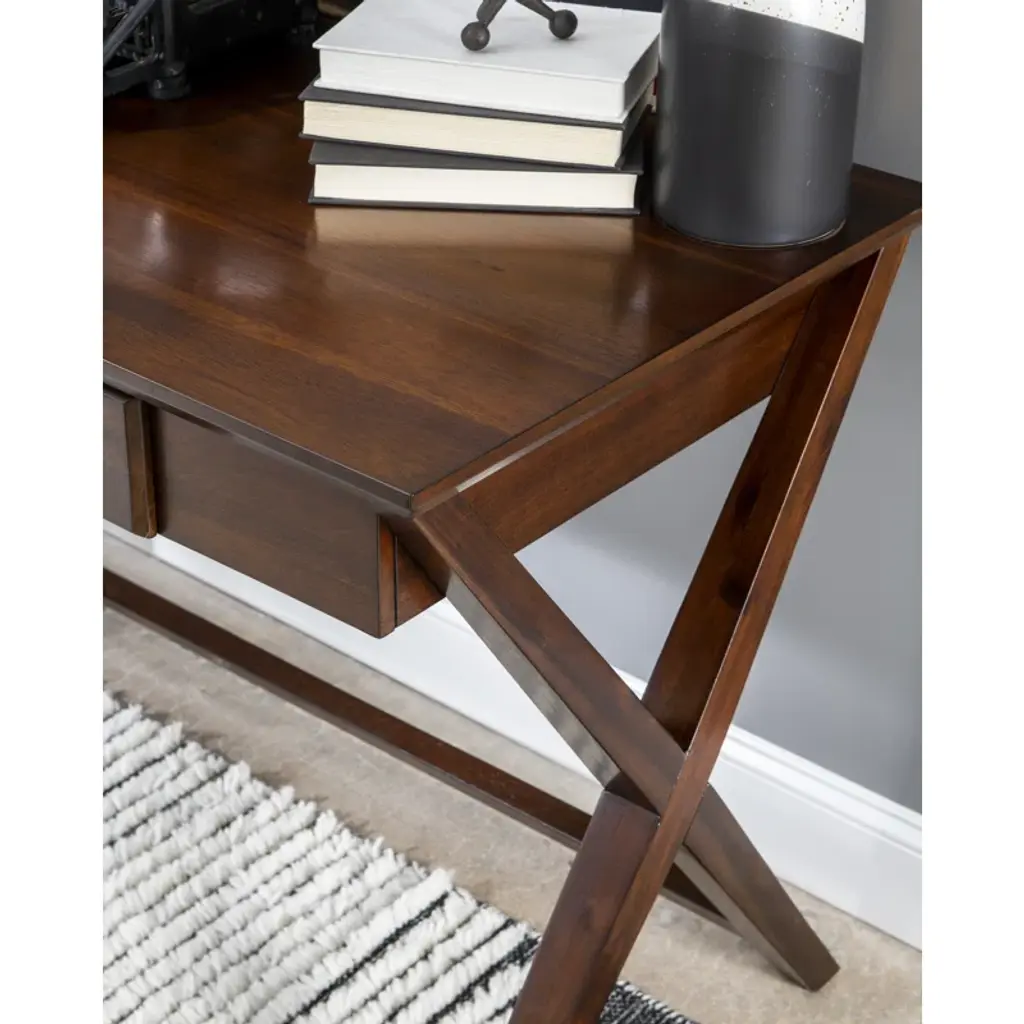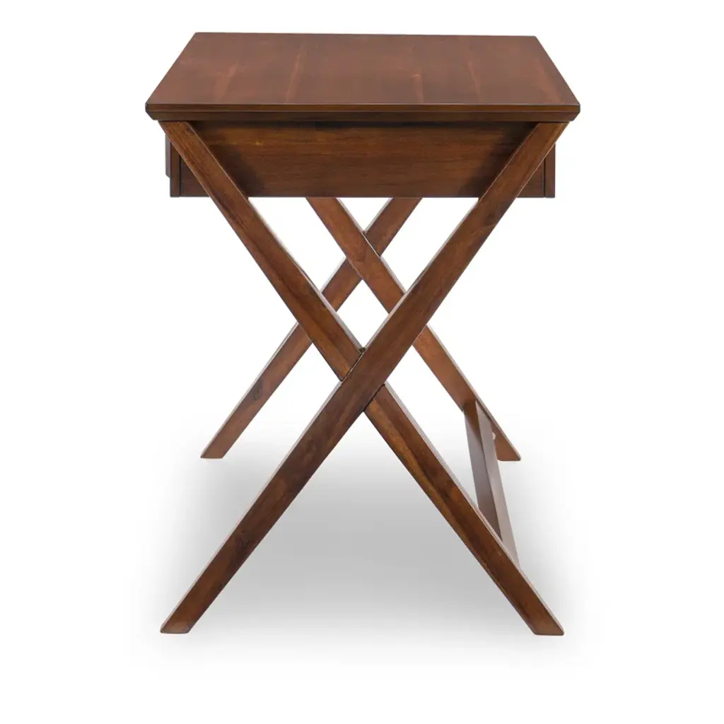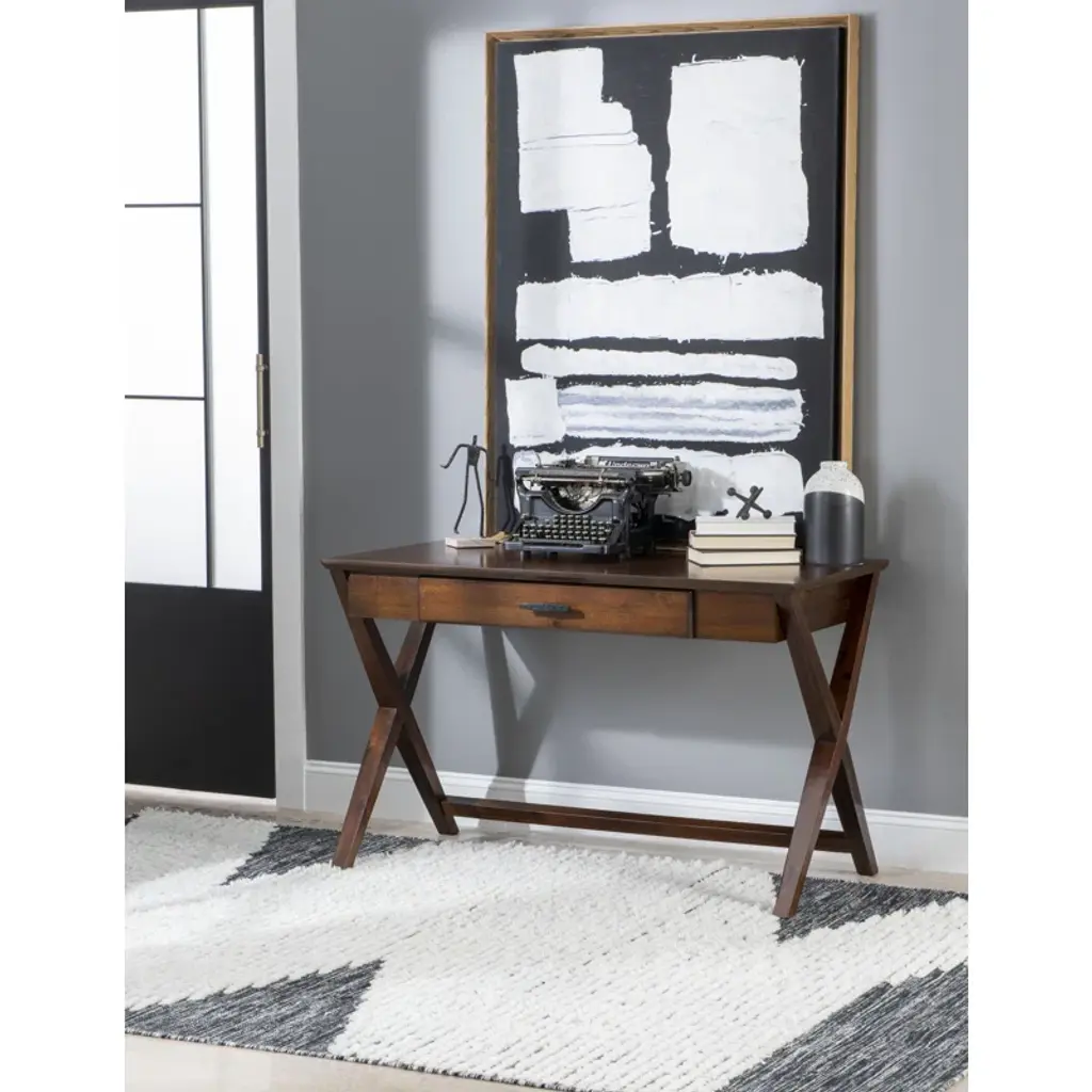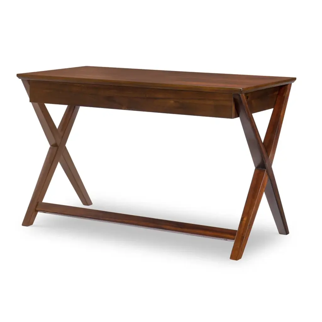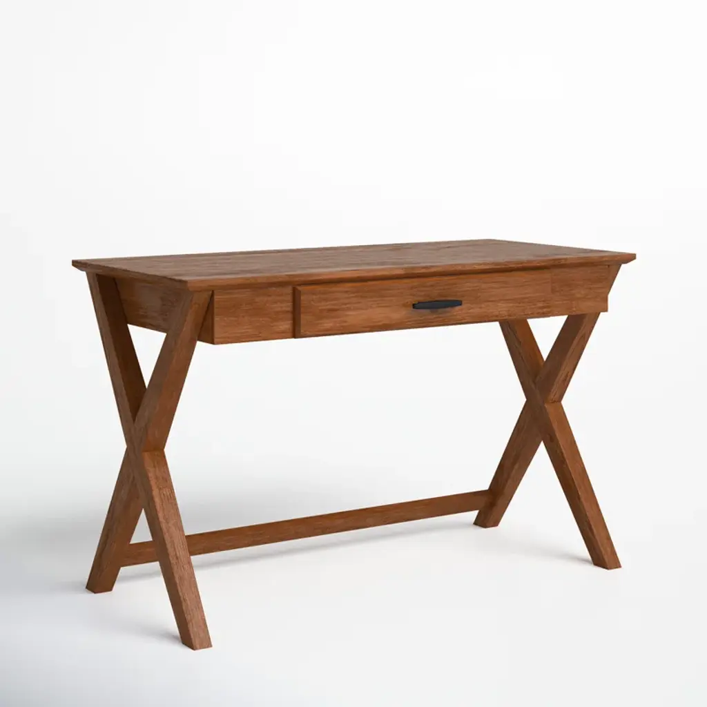 Transform your workspace into a cozy haven with this rustic-inspired writing desk. Its trestle X-shaped design and natural wood grain make it a standout piece for your home office or study. The desktop, crafted from a blend of solid wood and engineered wood, offers ample space for your laptop and notebooks. A single drawer with metal glides provides storage for your essentials, while the desk's finished back allows for versatile placement in any room. Enjoy a clutter-free, creative space with this charming addition to your home.