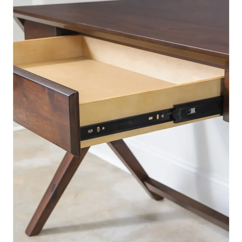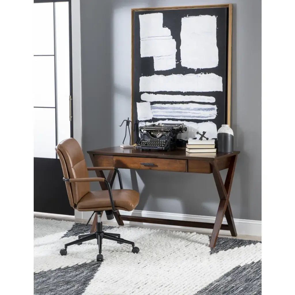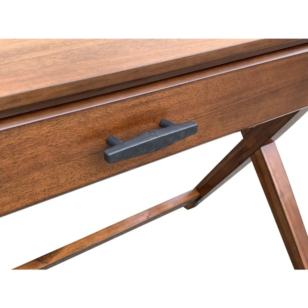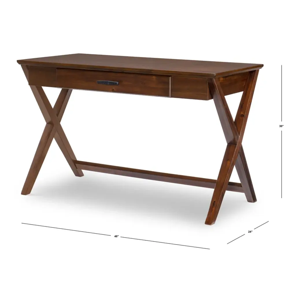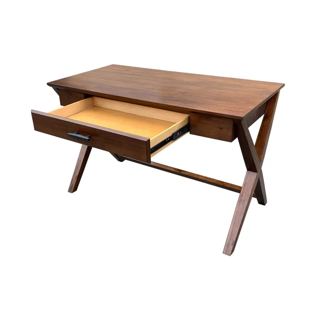 Transform your workspace into a cozy haven with this rustic-inspired writing desk. Its trestle X-shaped design and natural wood grain make it a standout piece for your home office or study. The desktop, crafted from a blend of solid wood and engineered wood, offers ample space for your laptop and notebooks. A single drawer with metal glides provides storage for your essentials, while the desk's finished back allows for versatile placement in any room. Enjoy a clutter-free, creative space with this charming addition to your home.