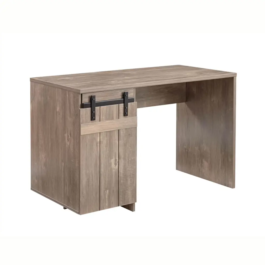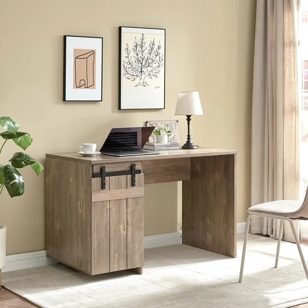 The bottom of the desk is designed with a cabinet and a barn door, which is equipped with three shelves, providing ample storage space for users to store items and keep the desktop neat and tidy.The addition of black metal hinges not only enhances the overall aesthetics, but also makes it easy for users to open the cabinet.This desk is made of high-quality wood, with a stable and durable structure and strong load-bearing capacity, providing users with a stable and efficient office environment.