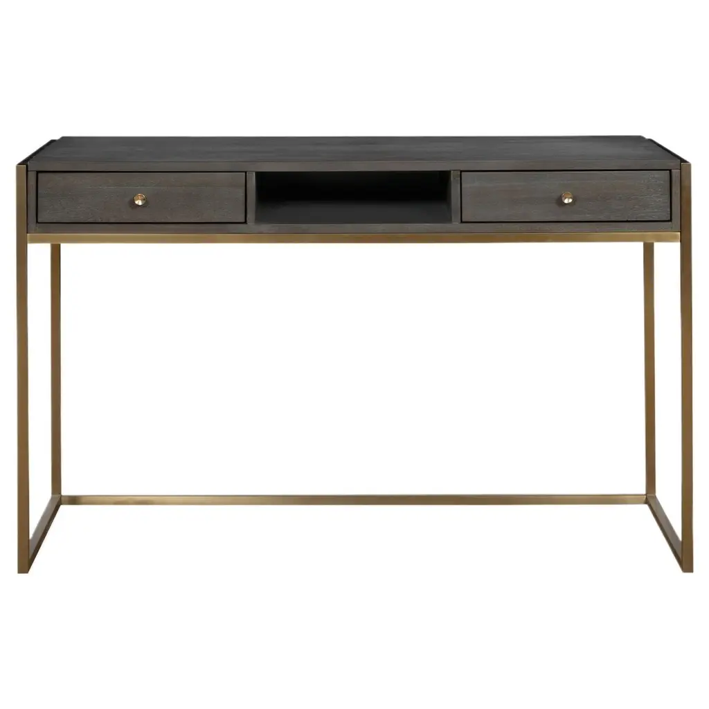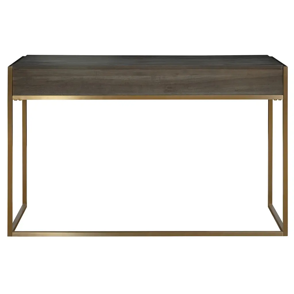 Discover the allure of the Nolwen Writing Desk, where contemporary design meets timeless elegance. This exquisite piece is a harmonious blend of sleek stainless steel and the rich warmth of acacia veneer. The framework, plated in brushed brass, exudes a sophisticated charm that is both modern and classic. The desk's top, with its dark walnut stain and light gray glaze, offers a serene surface that invites creativity and focus. Brass drawer pulls add a touch of refined luxury, making this desk not just a piece of furniture, but a statement of style and grace. Let the Nolwen Writing Desk be the centerpiece of your workspace, inspiring productivity and elegance in equal measure.