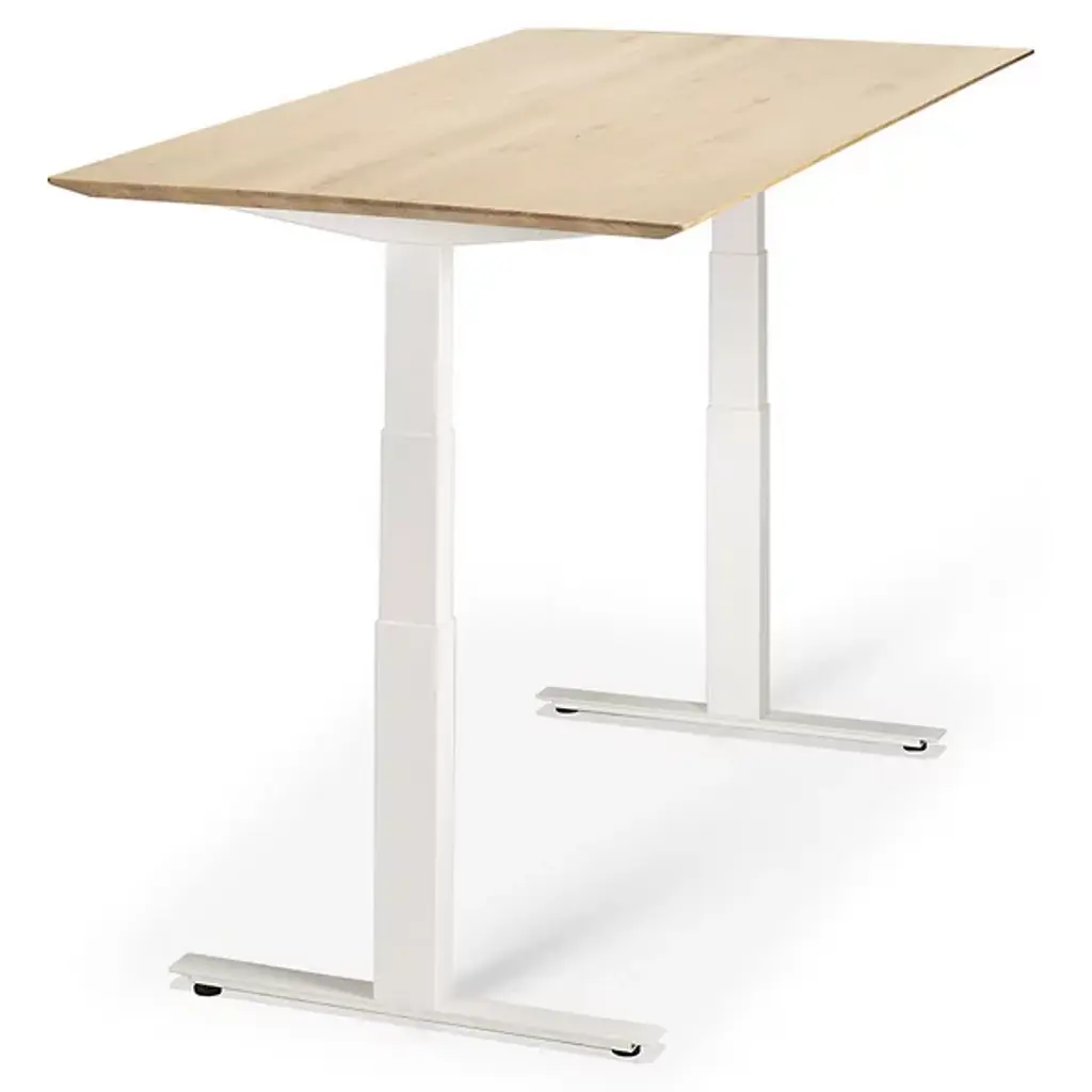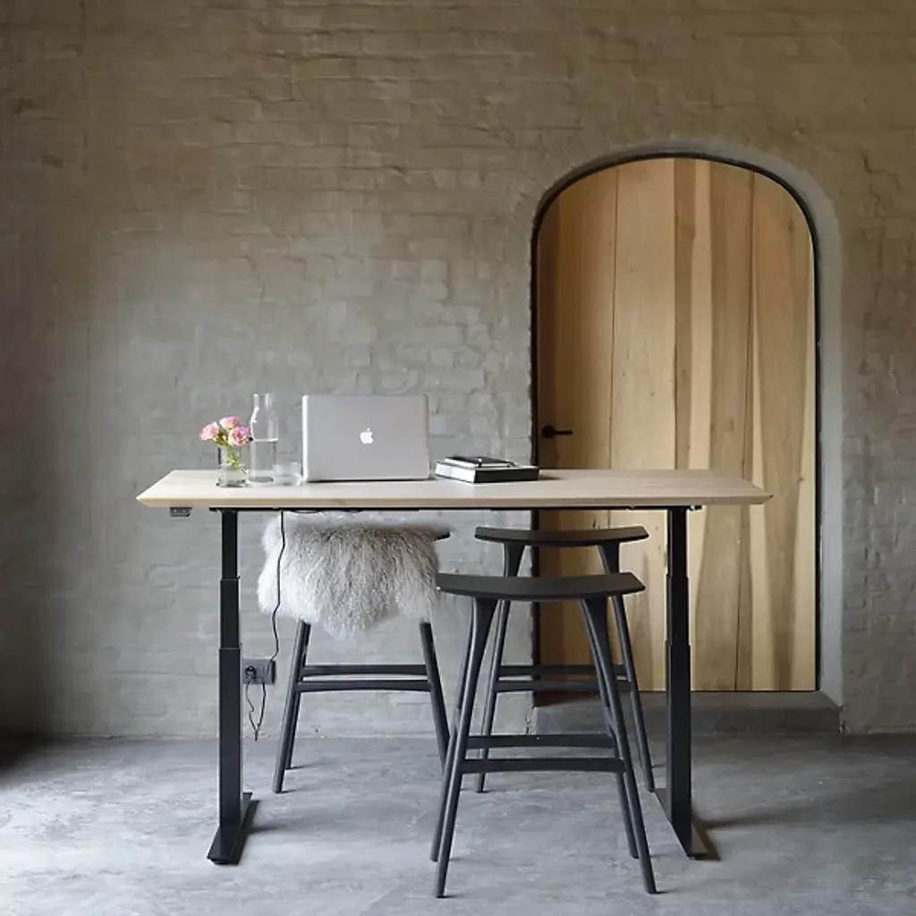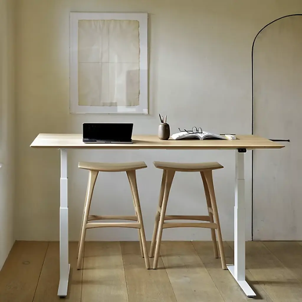 Bring a robust and engaging attitude to your workspaces with the Oak Bok Adjustable Desk from Ethnicraft. Designed by Alain van Havre and made in Serbia, it’s able to be easily tailored to health and posture needs and rests a rectangular oak desktop on a robust and adjustable metal support structure. The wooden top is beveled to bloom slightly upwards while providing an excellent work surface at any level, especially when shifting from sitting to standing through the workday using its motorized adjustment.