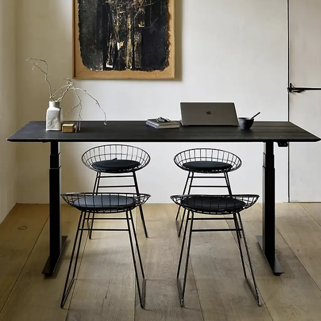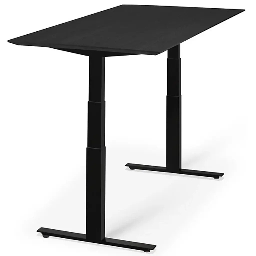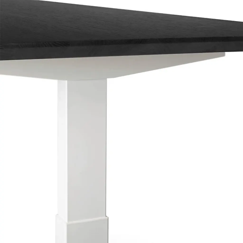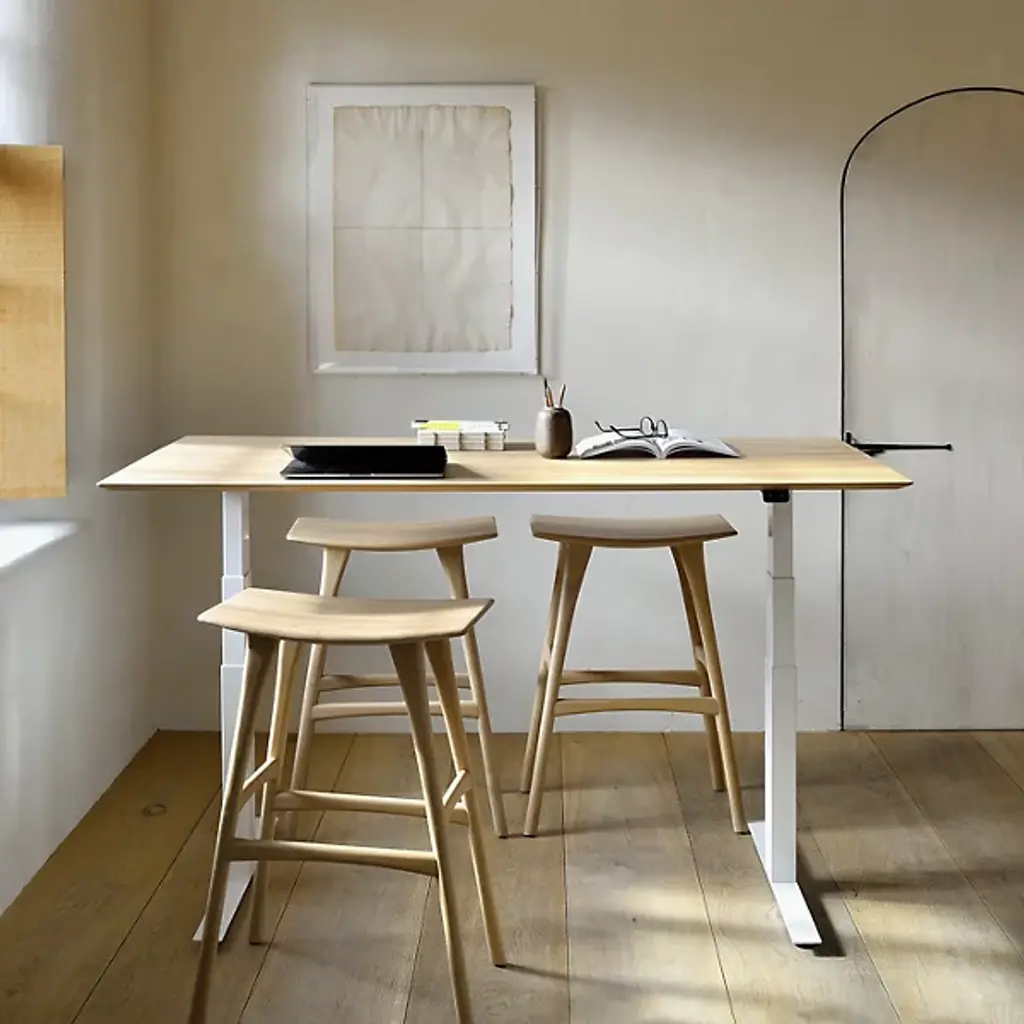 Bring a robust and engaging attitude to your workspaces with the Oak Bok Adjustable Desk from Ethnicraft. Designed by Alain van Havre and made in Serbia, it’s able to be easily tailored to health and posture needs and rests a rectangular oak desktop on a robust and adjustable metal support structure. The wooden top is beveled to bloom slightly upwards while providing an excellent work surface at any level, especially when shifting from sitting to standing through the workday using its motorized adjustment.