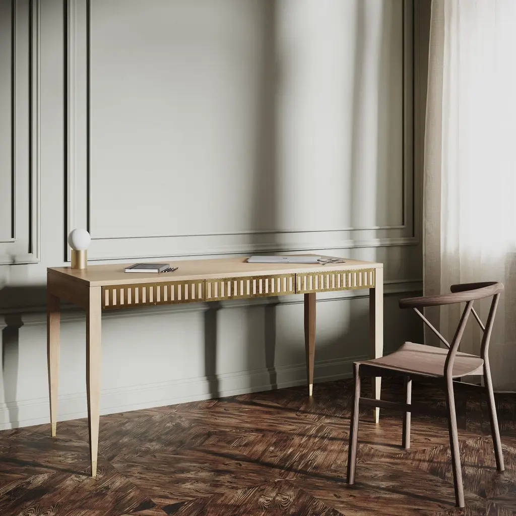 Oak Desk With Three Drawers With Brass Fronts In Mid Century Modern Style