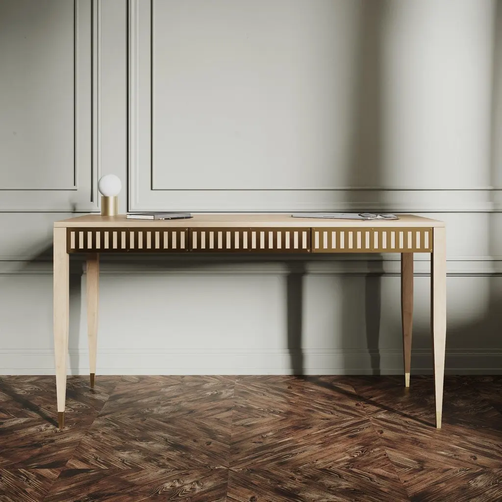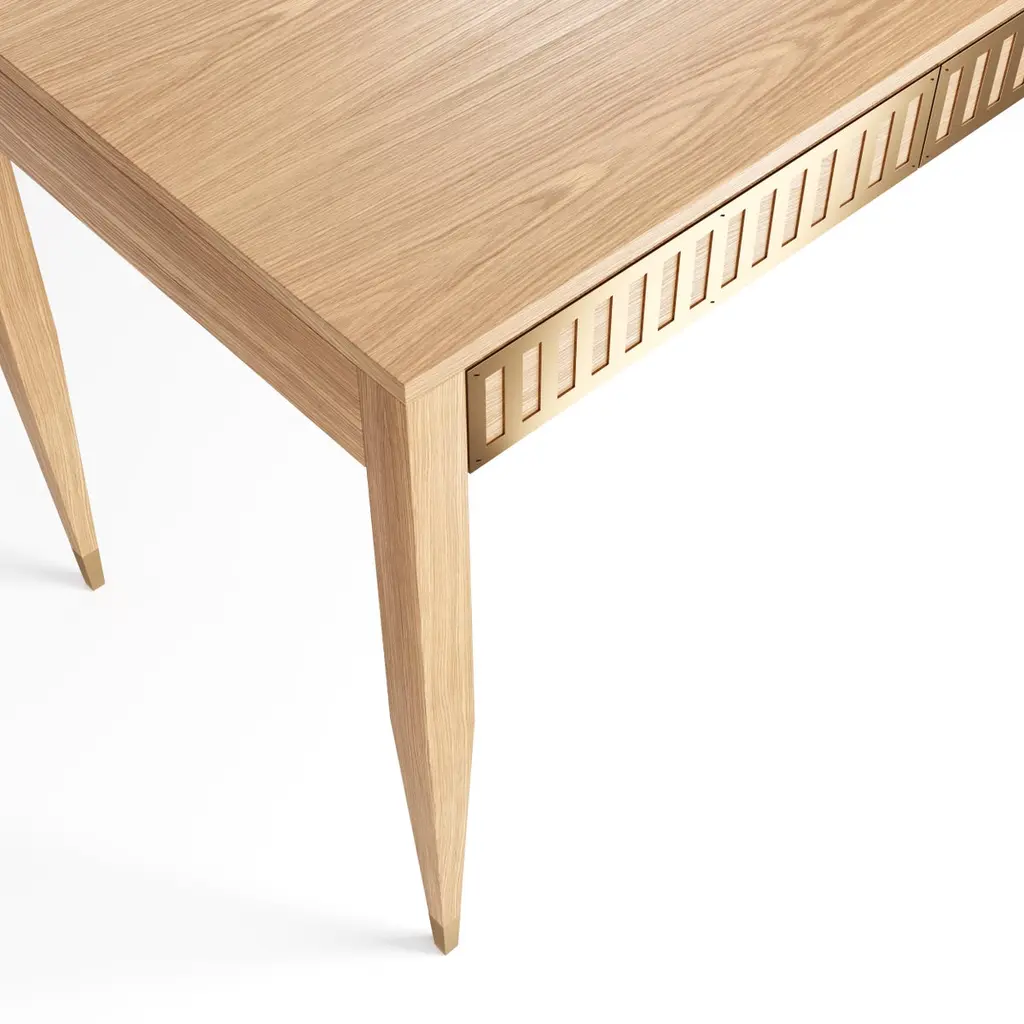 Desk in mid-century style with three drawers with brass fronts. The tapered legs are finished with brass plated aluminum feet. Desk made of solid oak wood and wood covered with natural oak veneer. Other wood on request. Perfect as office desk, study desk, computer desk.Handmade in Poland.Materials:-drawer fronts: solid oak with brass plated aluminum-sides, dividers, back: solid oak-drawer body: solid oak-legs: solid oak-top: blockboard overlaid with oak veneer-handles: solid brass-feet: brass plated aluminum-matte varnishDimensions:width: 140 cm (55,1")depth: 60 cm (23,6")height: 75 cm (29,5")Also available in 160cm x 70cm version.You can change the size, material, surface treatment after prior contact and setting prices.