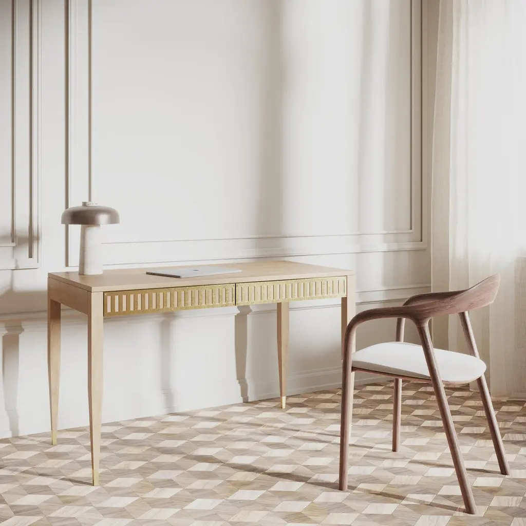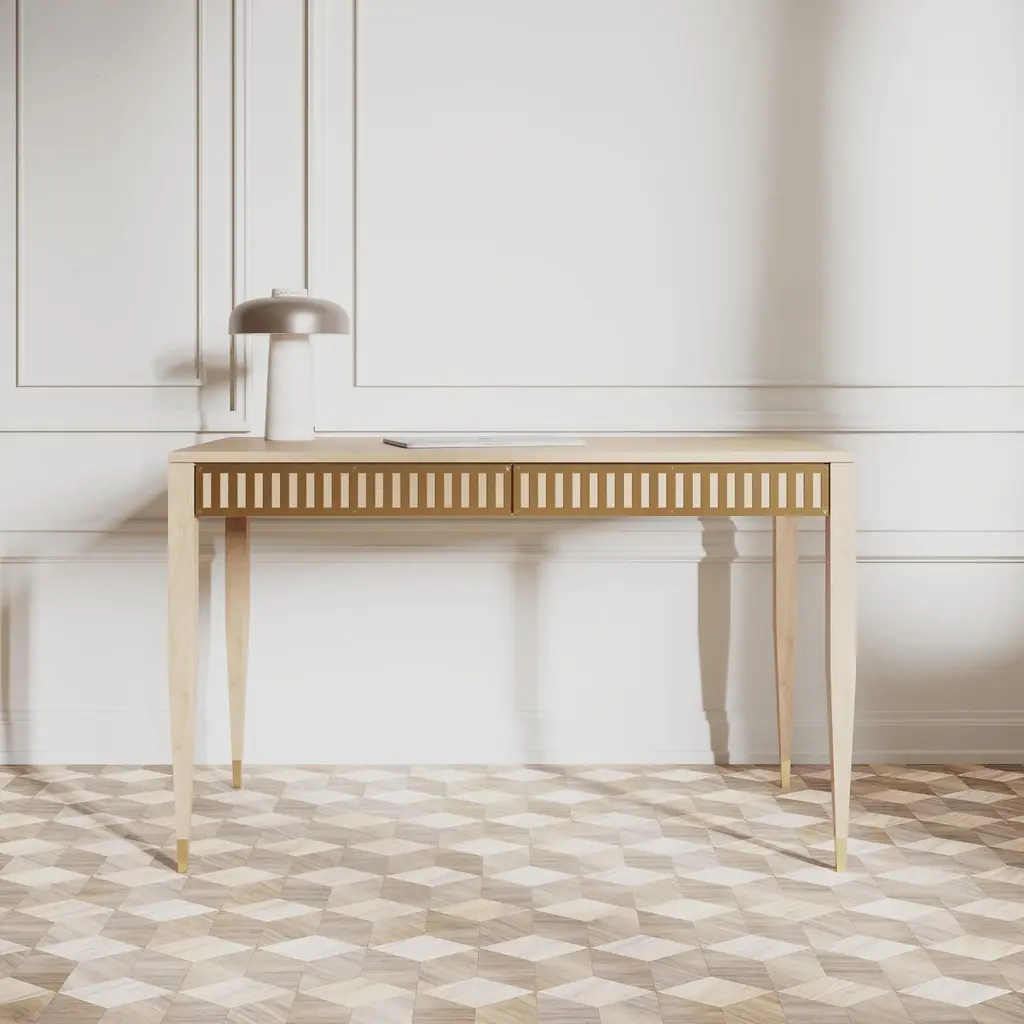 Oak Desk With Two Drawers With Brass Fronts In Mid Century Modern Style